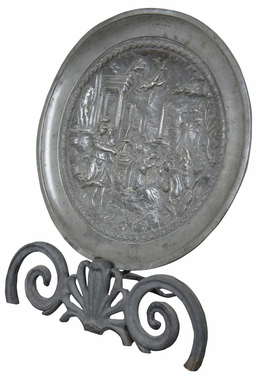 Antique decorative European pewter plate featuring a detailed Renaissance scene of a Roman forum with Cupid flying above Athena and other figures. Stamped on reverse with a crowned rose with the initials “ND” and another worn round mark with “II” and the letters “-llans” still discernible. Plate displayed on a wrought iron scrolled and scallop shell stand.