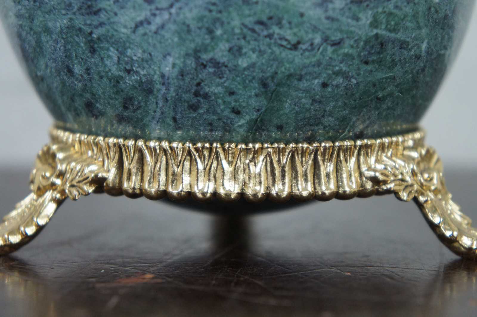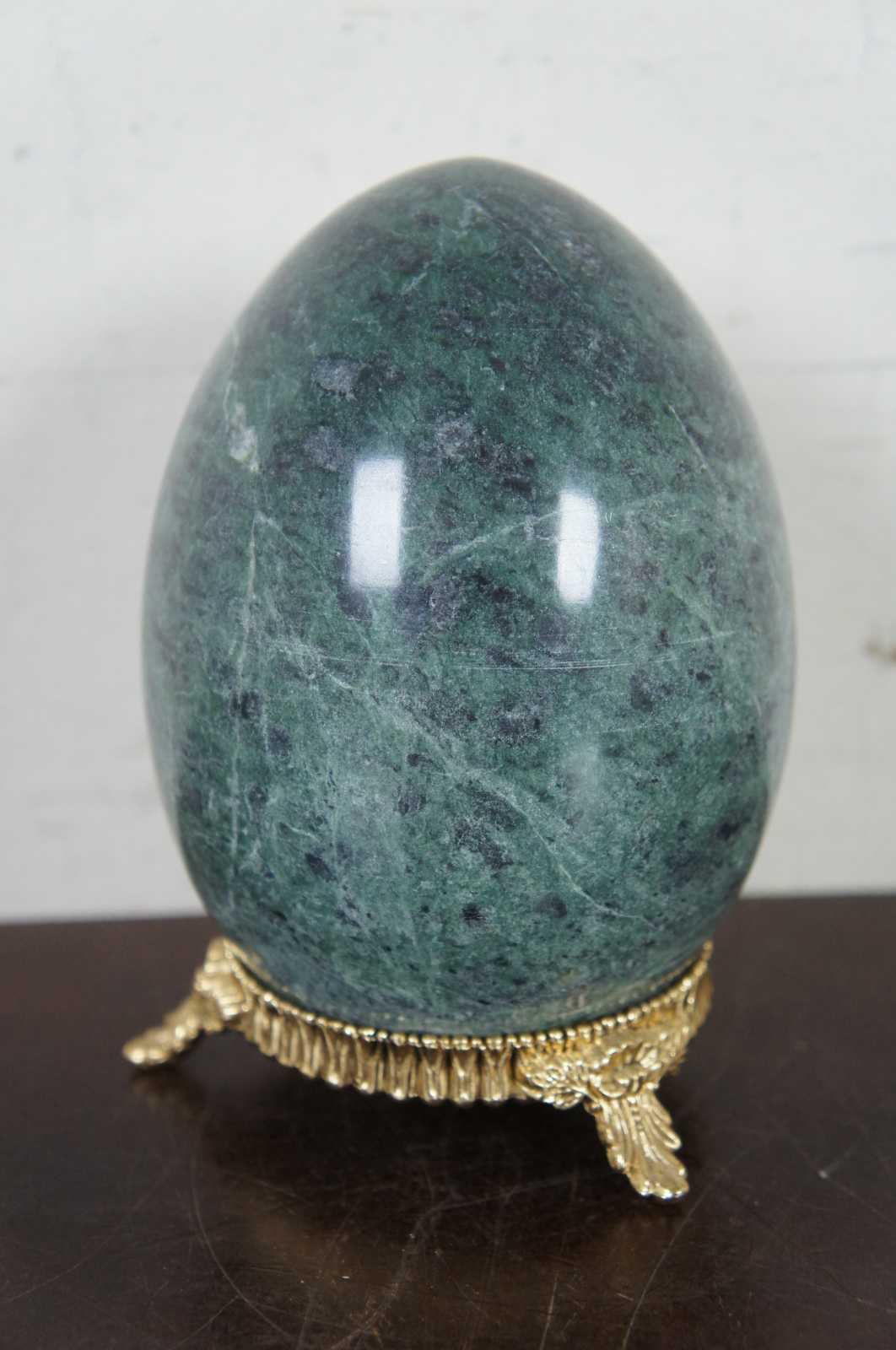 Green marble or granite polished stone egg on a gold tone metal, floral patterned stand.