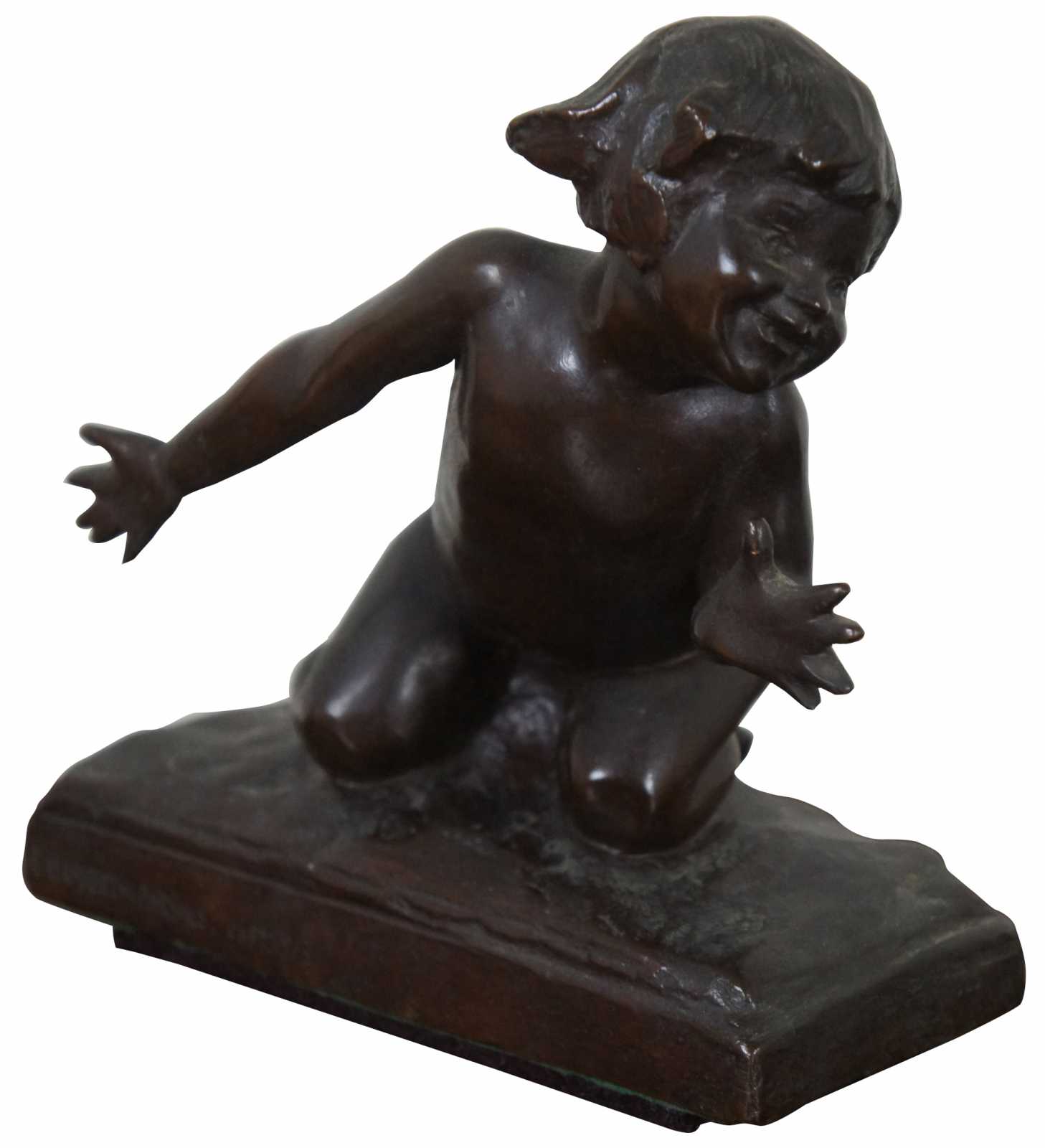 Two bronze bookends featuring two children playing by Edith Barretto Parsons, marked with copyright 1913, produced by the Gorham Co foundry. / BIO: Edith Barretto Stevens, grandmother of Serena Pelissier, was born in Halifax, Virginia, in 1878, as her parents were residing there at the time. She died in New Canaan, Connecticut in 1956. When she was six years old the family moved from Virginia to New Jersey. She said that the move inspired her to become an artist: the Virginia property had been so beautiful, and she found the fiercely structured garden in New Jersey so ugly, that she decided to create work that celebrated the beauty of untouched nature. Her figures are pure in their natural state, with no added man-made ornamentation or sentimentality. In her best known figures of small children and animals, we can detect a connection, very subtly rendered, between the animals and the children: the Duck Baby’s hair, for example, flies out at the side, resembling little wings; the Baby Pan has tiny “horns” hidden in the curls on his forehead. There is that hint at connection to be found in each of them. She studied from the age of 15 at the Art Students’ League in New York City, with, among others, Daniel Chester French, George L. Barnard and John Twachtman, and she worked as apprentice to James Earle Fraser. In 1903, at the age of 25, she was appointed to design the pediment of the main entrance to the Liberal Arts Building at the St. Louis fair. In 1908 she married Howard Parsons, one of the many direct descendants of Charles Willson Peale and the slightly fewer descendants of Rembrandt Peale. They had one child, their daughter Edith Gilman Parsons, who married Howard French. Mrs. Parsons’ best-known works are the garden sculptures she made between 1911 and 1930: the Duck Baby (1911), the Turtle Baby (1915), the Frog Baby (1917), the Joy Fountain (1919), the Little Duck Fountain (1921), the Big Duck (1925), and the Baby Pan (1930). The original molds of some of these pieces survived in the possession of Mrs. Parsons’ daughter Edith French and her daughter Serena Pelissier, and a very limited number of authorized recasts have been available for sale. She worked constantly in her studios (in New York City and Quogue, Long Island, New York) until illness kept her from it. Quoting an anonymous newspaper article from the 1920s, "“Though intensely reticent about herself one may, if privileged to enter that home, breathe there the spirit of the gifted woman who has been able to imprison in bronze the smile of a little child.”