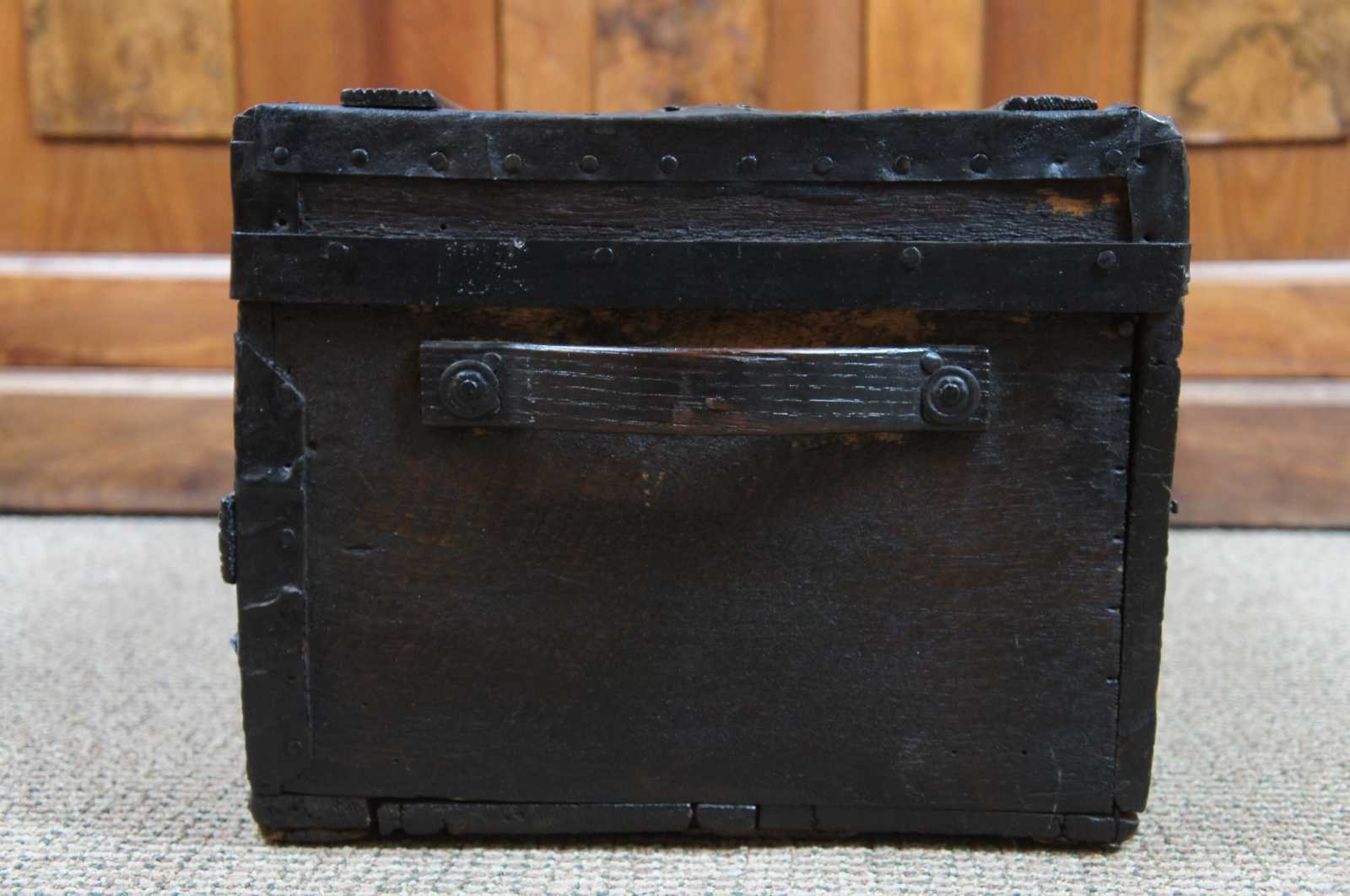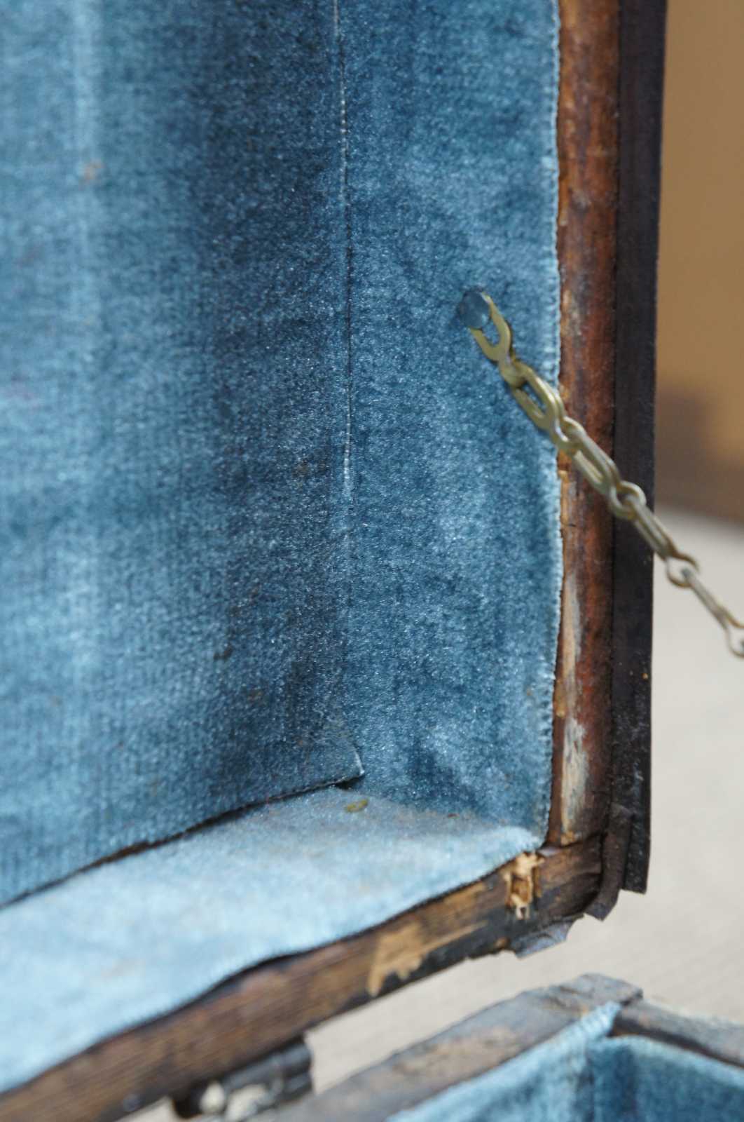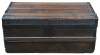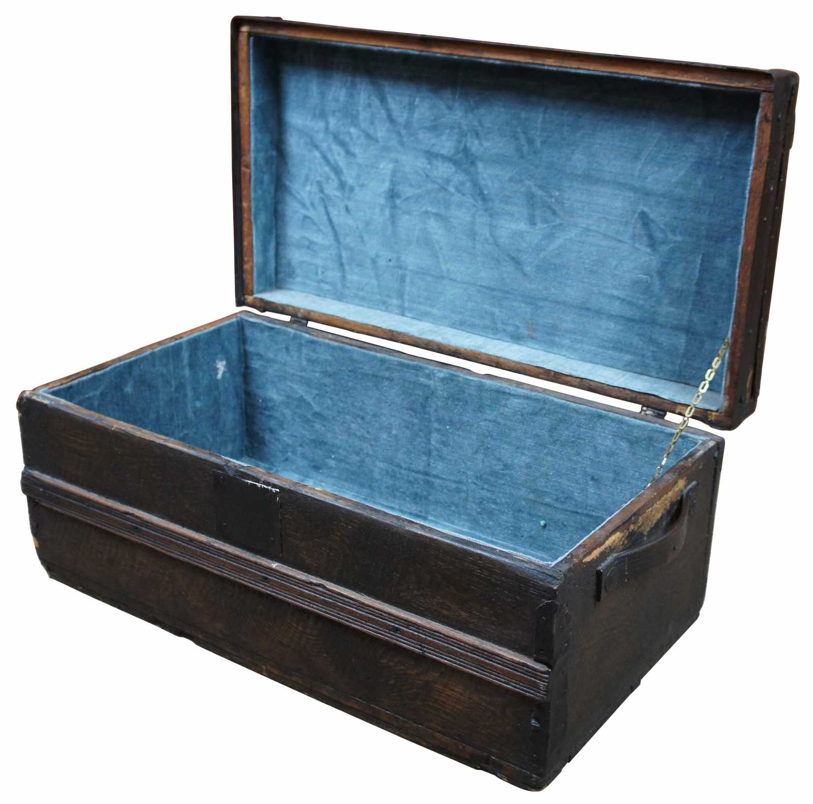 Antique wooden trunk, chest or foot locker with a flat top, wood handles on the sides, metal banding. The box does not latch and has a nice sky blue velvet lining.