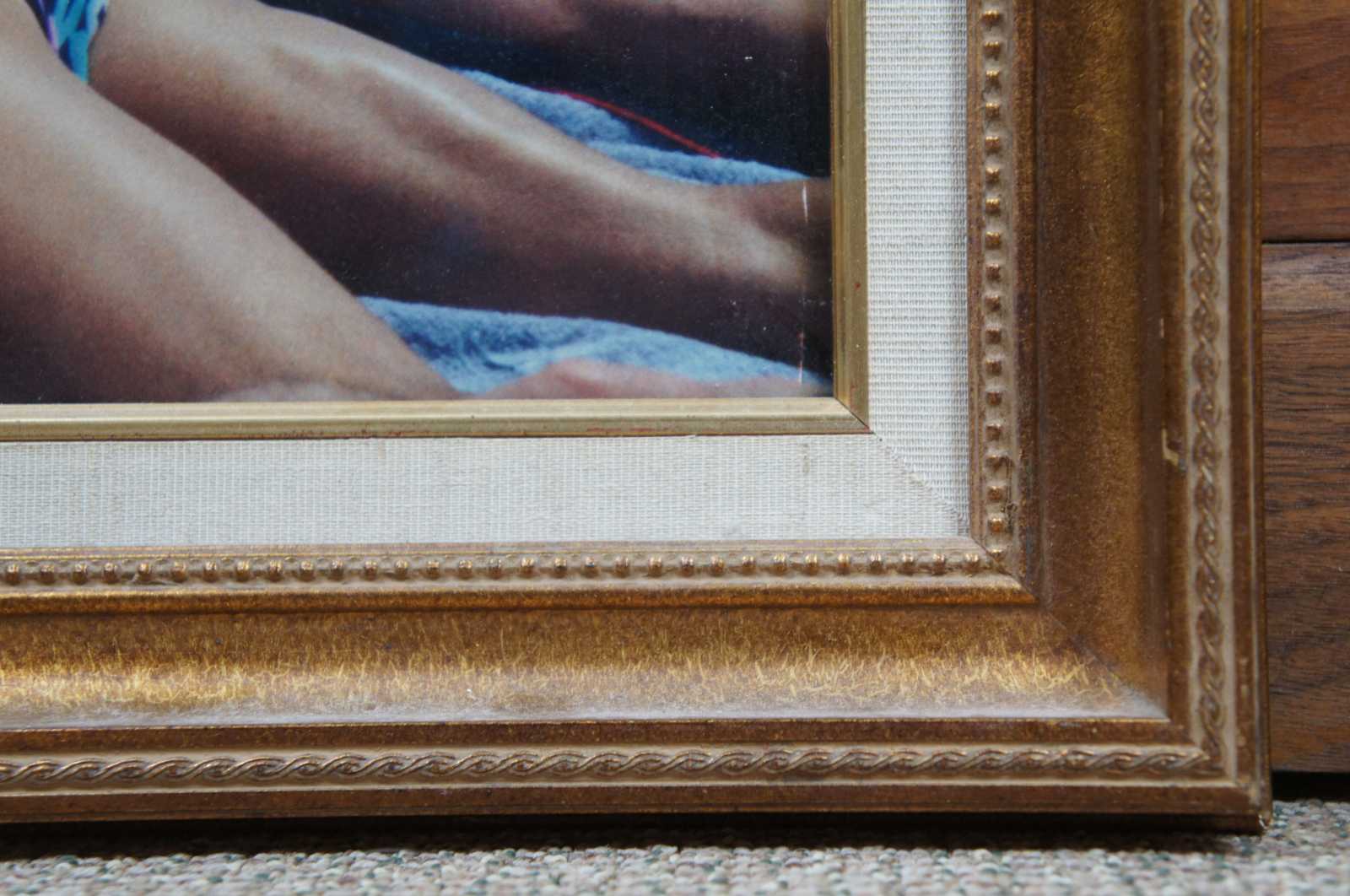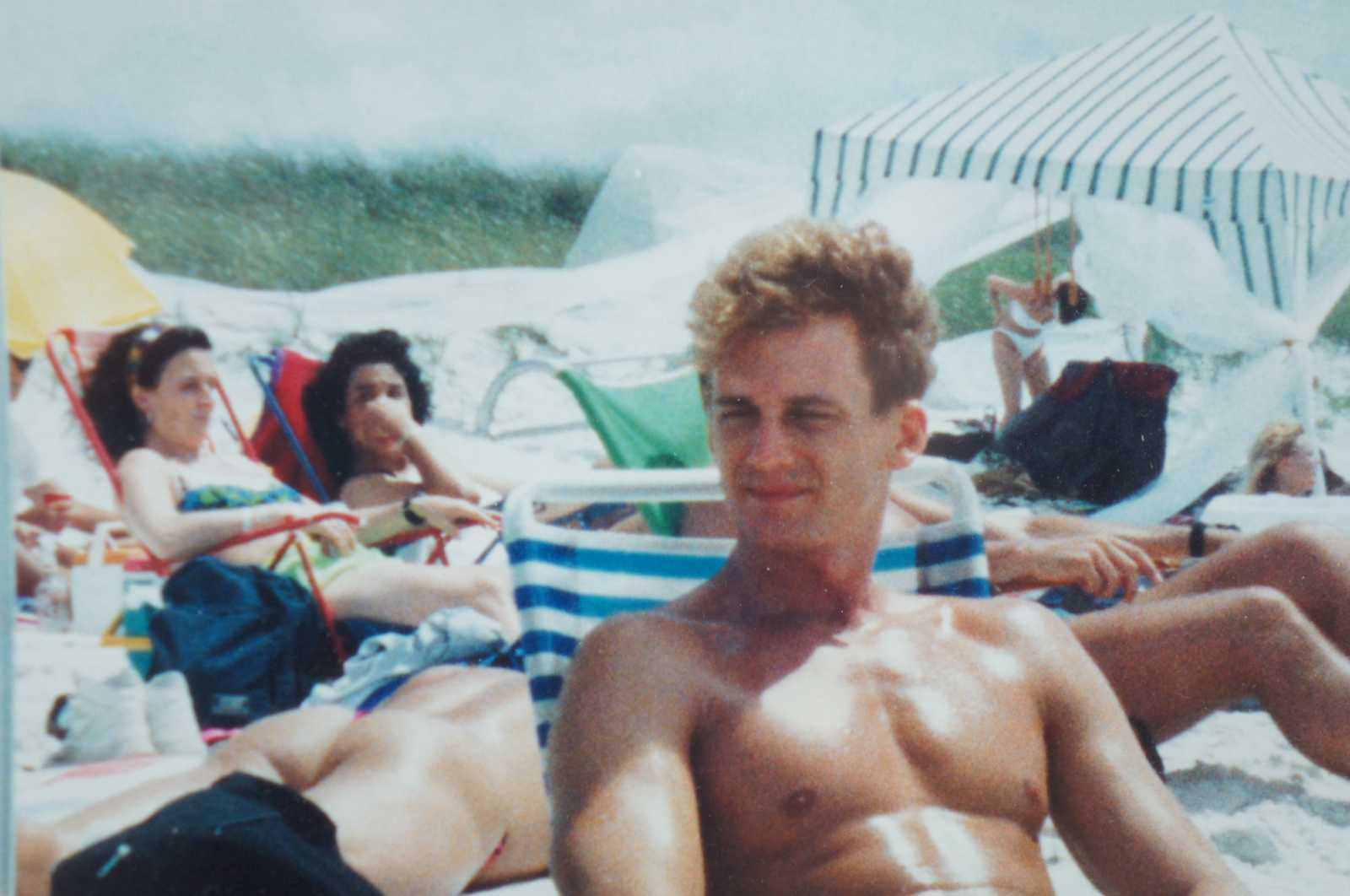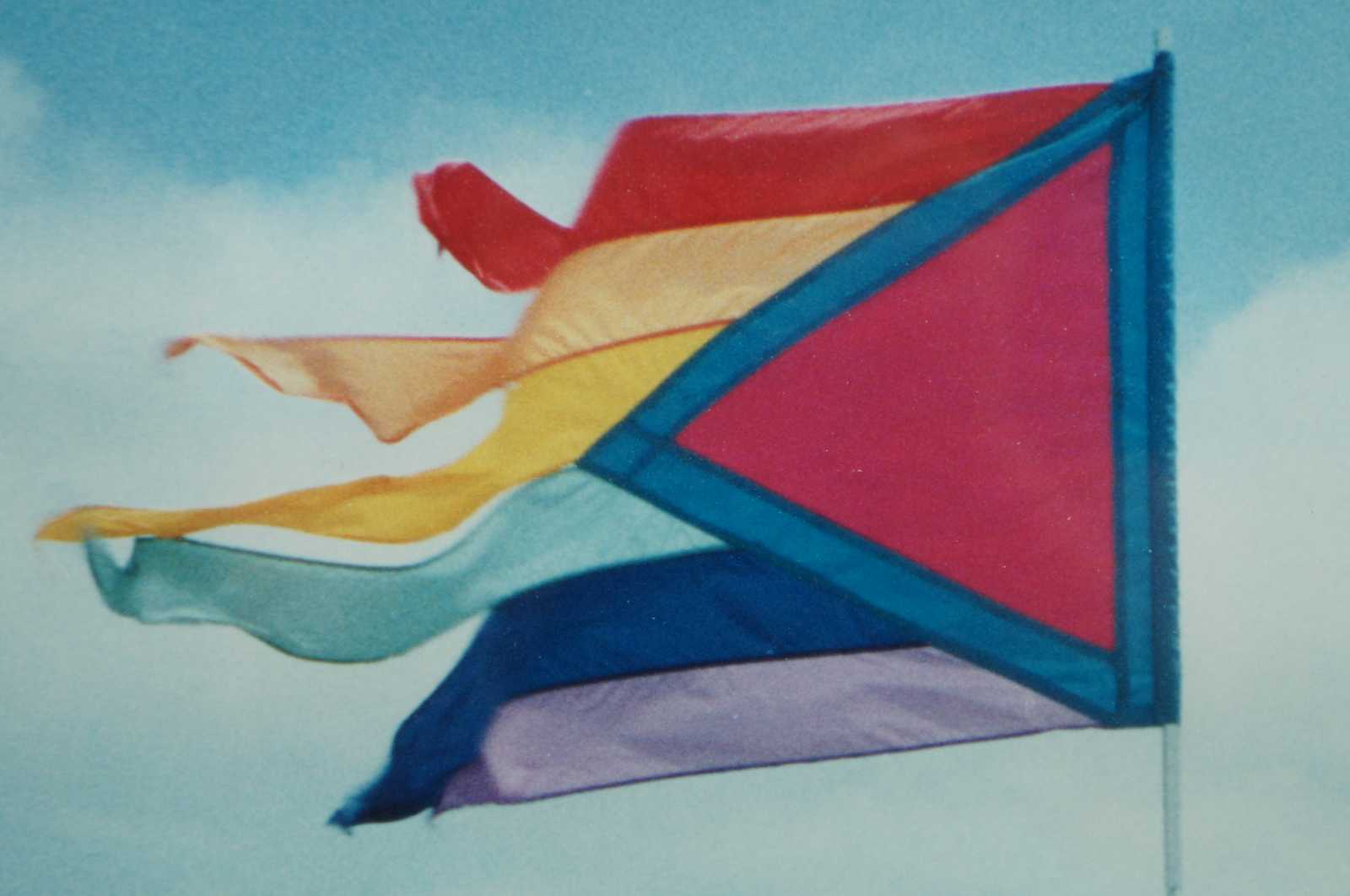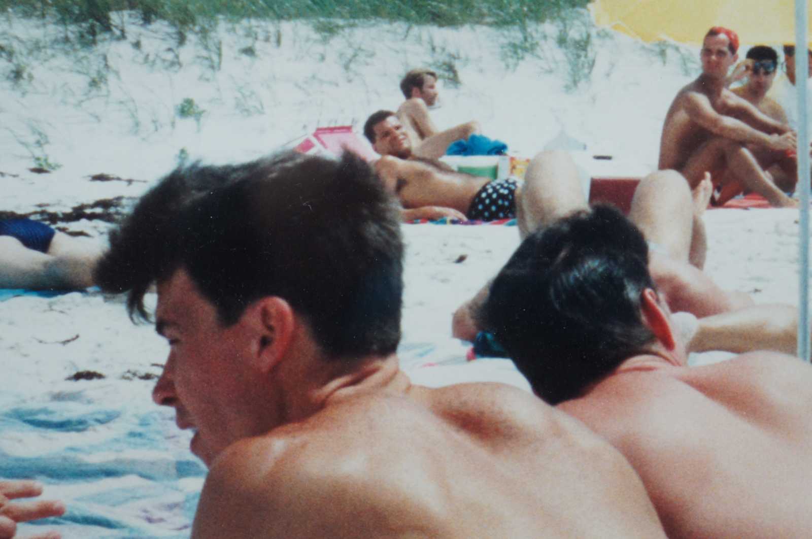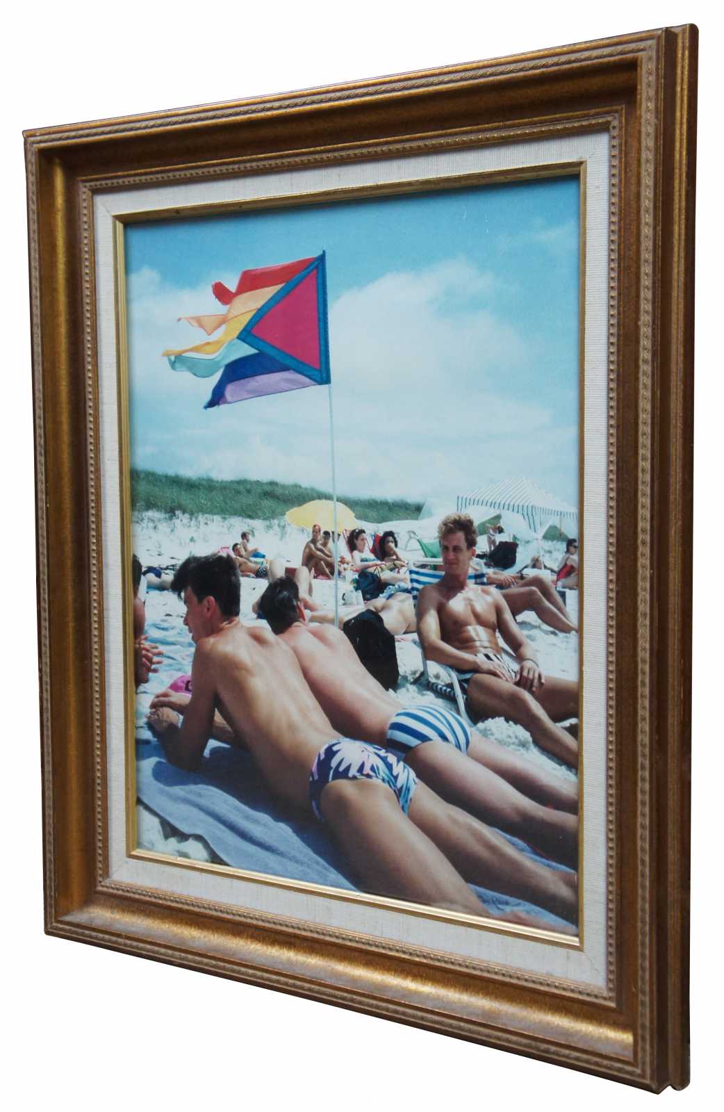 Vintage color photographic print of same sex couples on a beach under a gay pride flag.