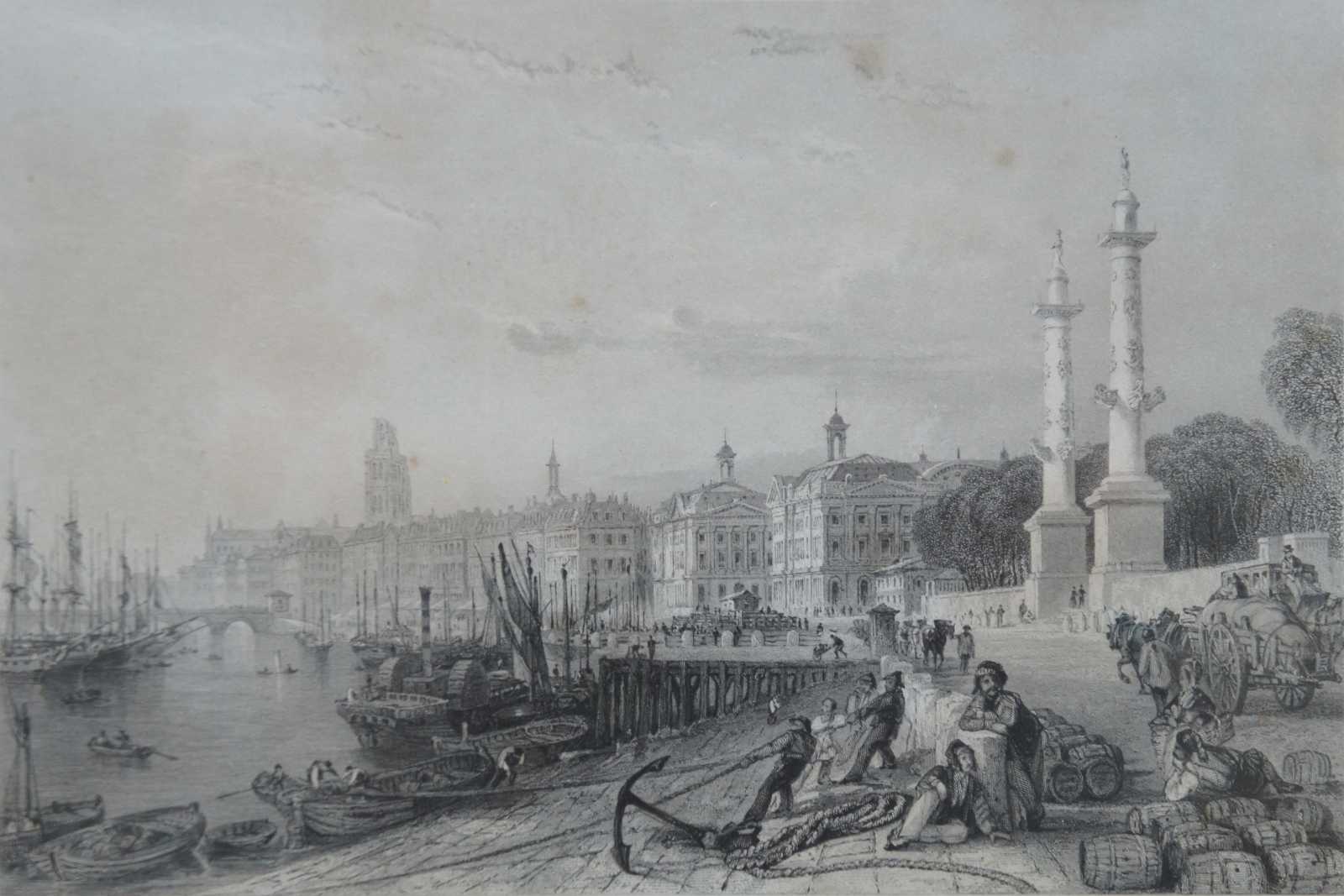 Antique 1840 steel engraving of the Quay of Louis XVIII, Bordeaux drawn by Thomas Allom, engraved by H. Adlard, and printed by Fisher Son & Co. / BIO: Thomas Allom was an English artist, topographical illustrator and architect, and one of the founder members of what eventually became the Royal Institute of British Architects (RIBA).