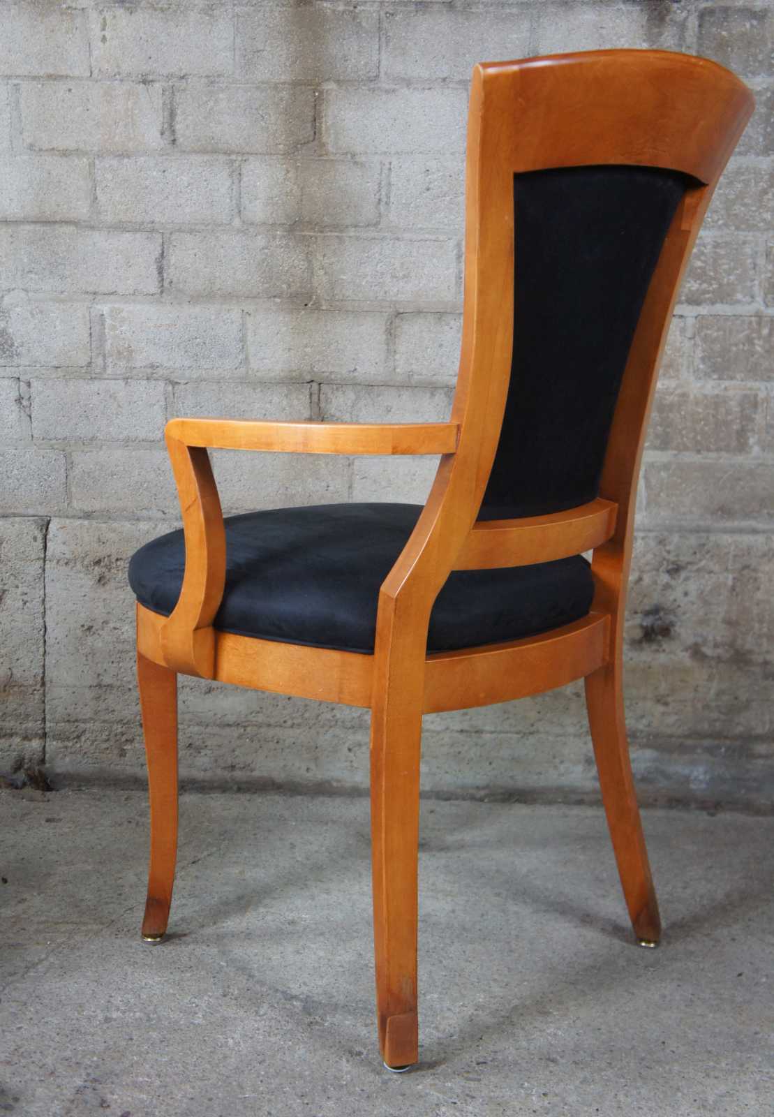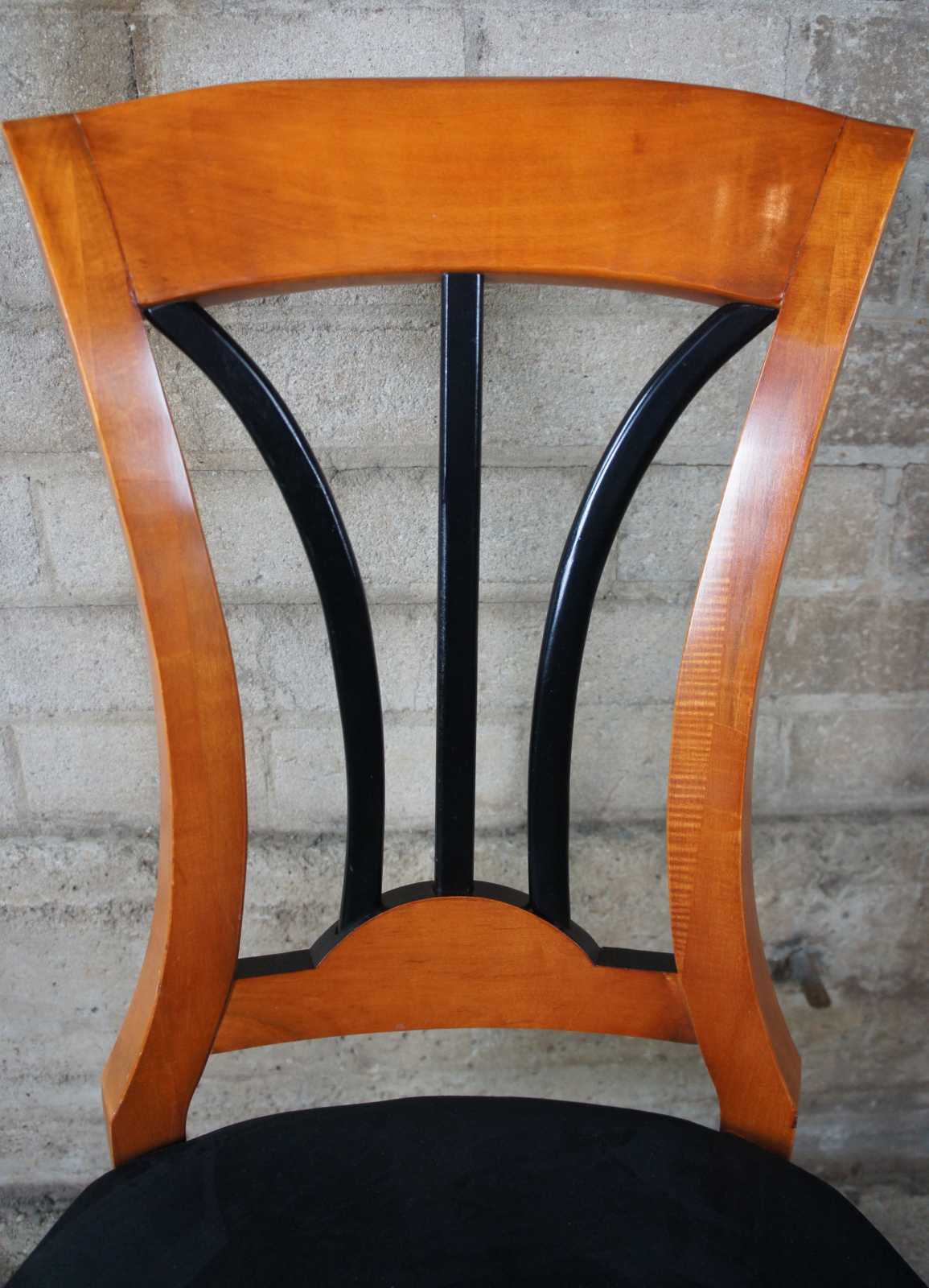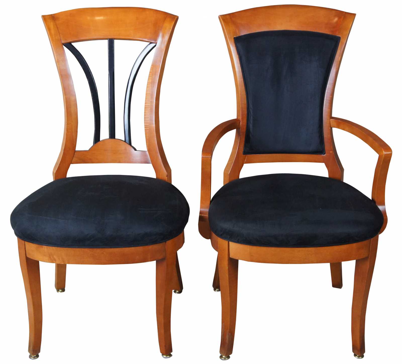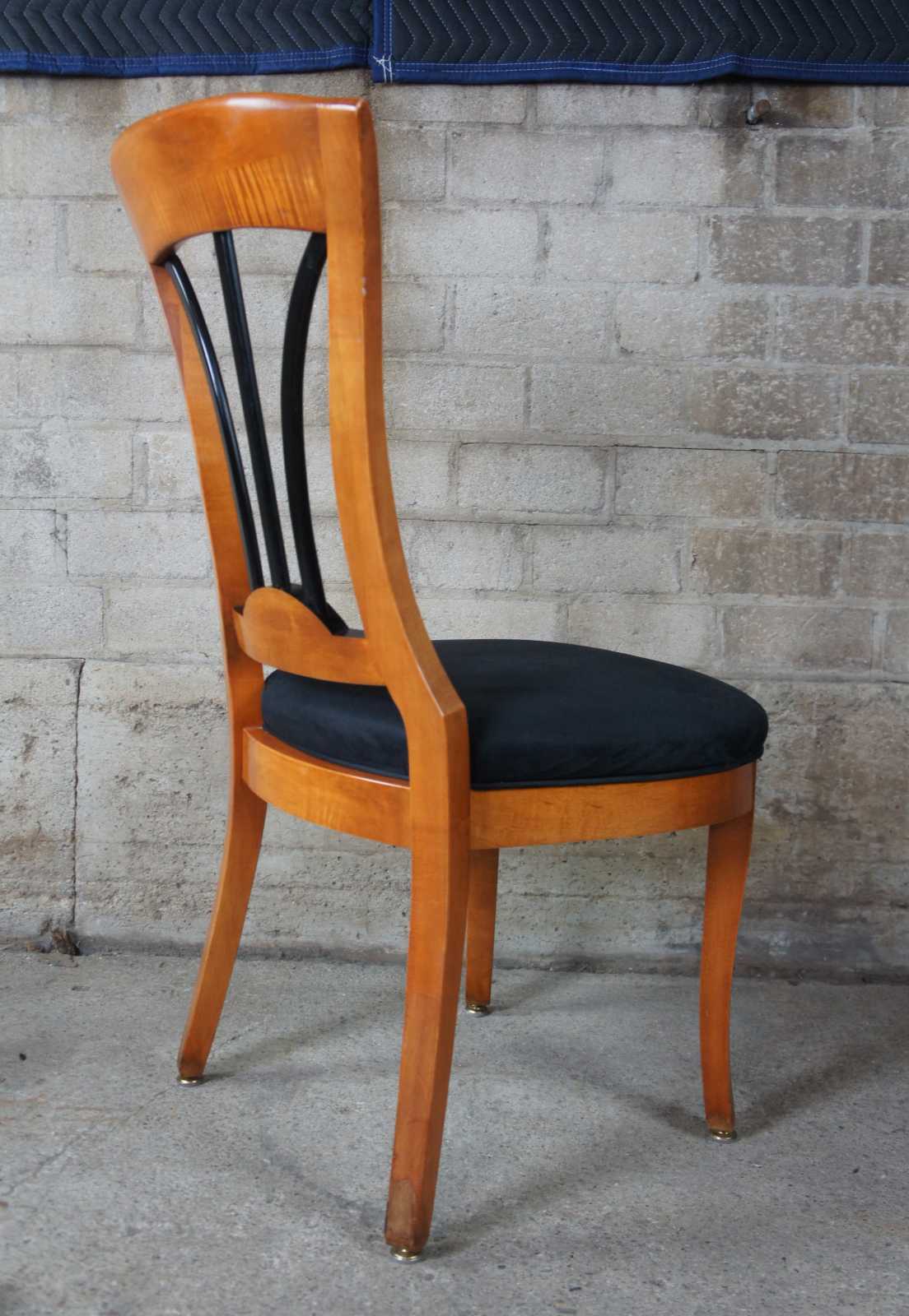 Circa 1990s National Mt Airy dining chairs. Beidermeier style with maple and ebonized frame. Upholstered in black with two arm chairs.