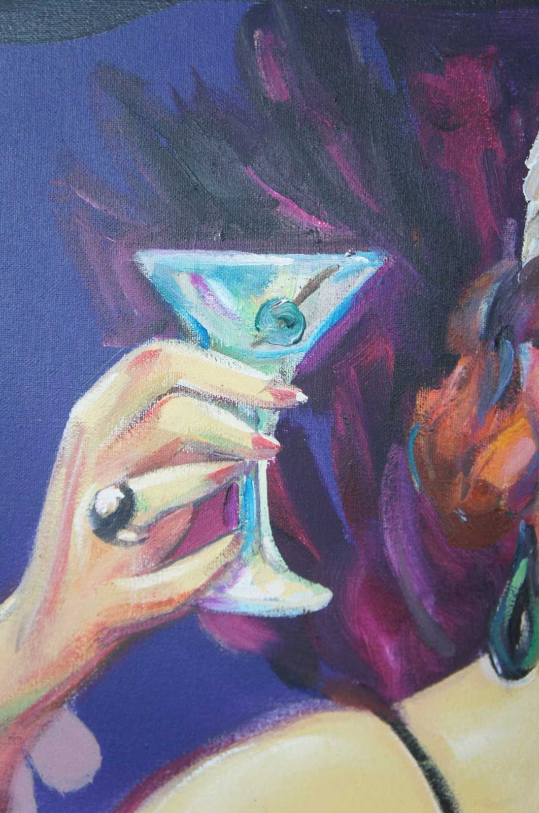 This painting was done in trade for the use of Daniel Adams' Paris apartment, by artist Ralph (Andy) Richards. The general subject was an adaptation of a 1930's Campari ad. A martini glass was substituted for the Campari glass since Adams doesn't drink Campari. The background reflects the four places Adams had property and spent time.