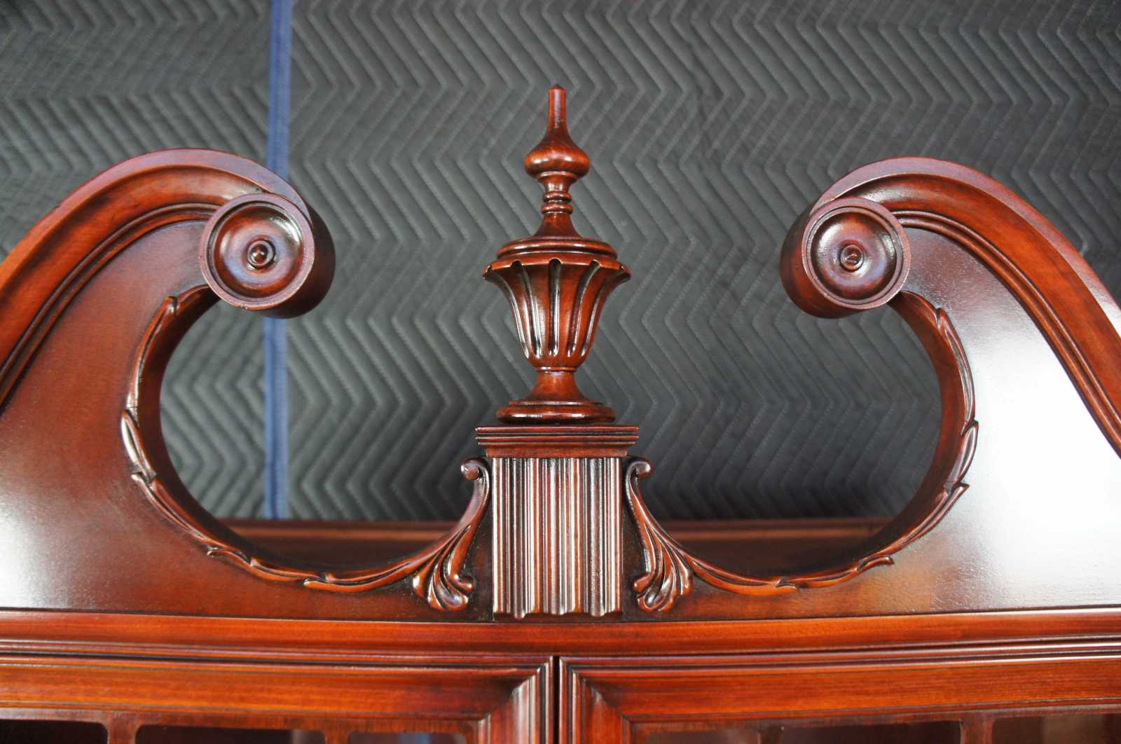 Circa 1940s American mahogany china cabinet. Features Sheraton styling with an open pediment and central trophy finial. The glass covered fretwork doors open to two shelves. Lower storage includes one drawer and cabinet. Legs are tapered and fluted.