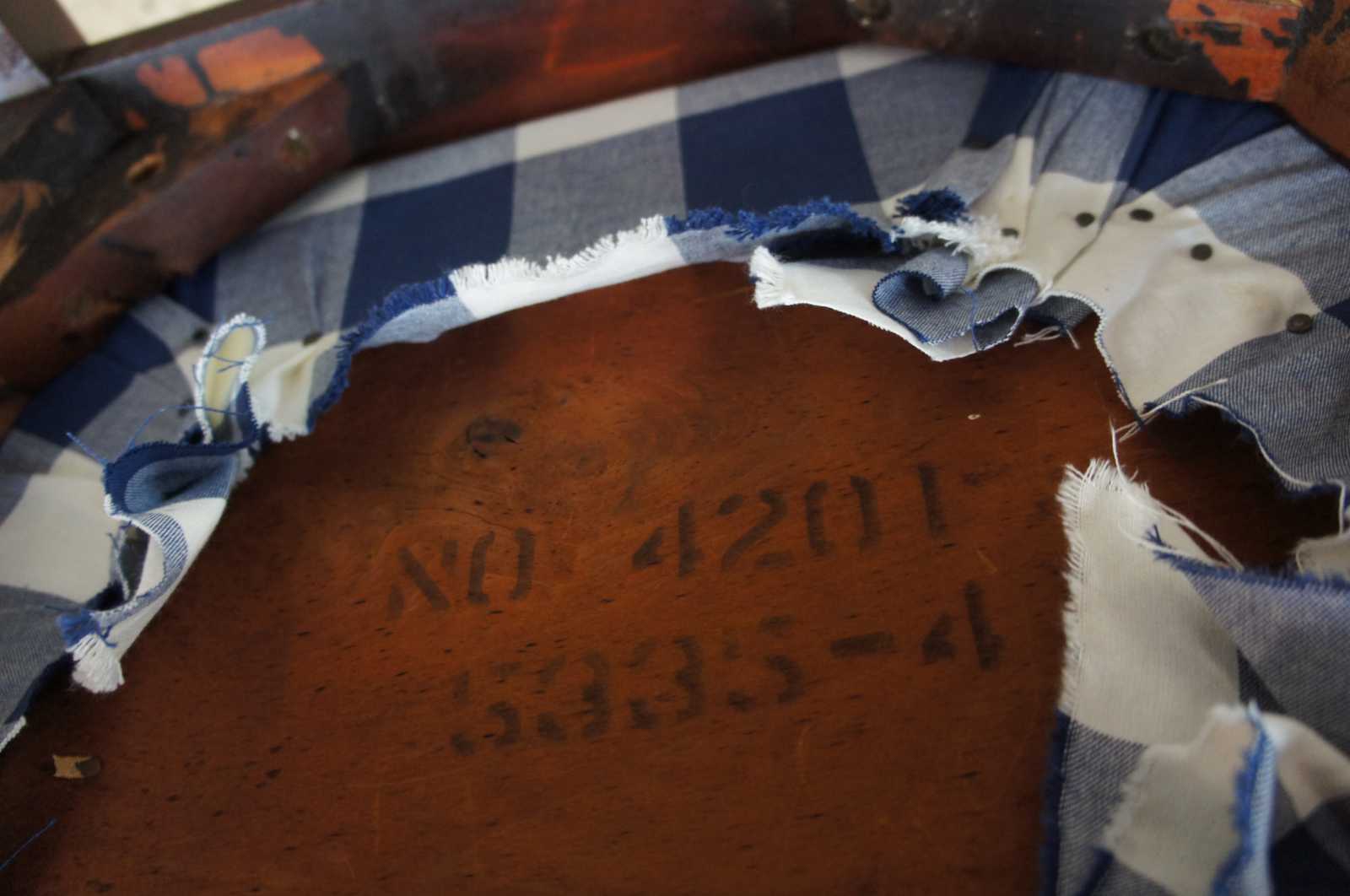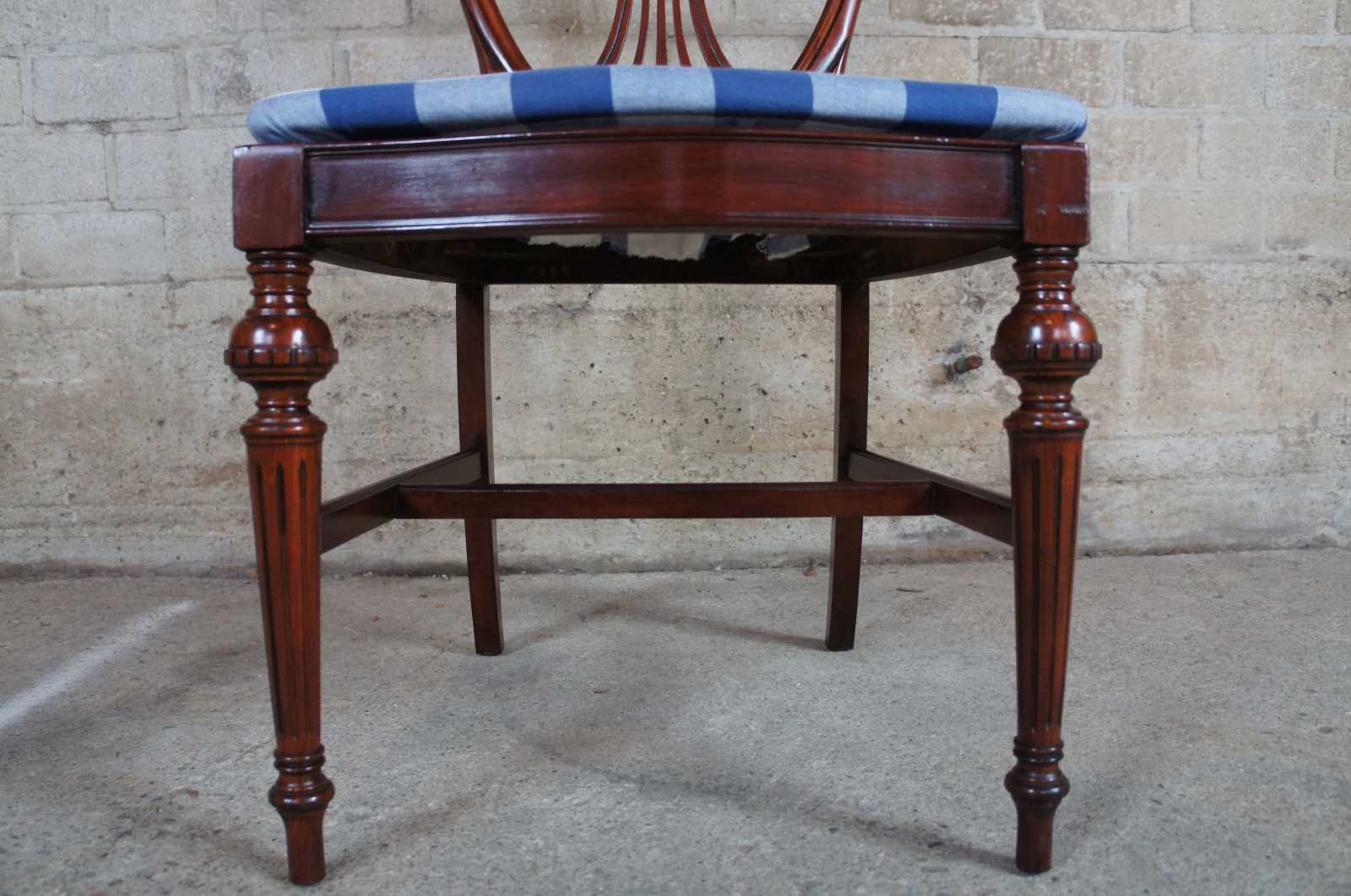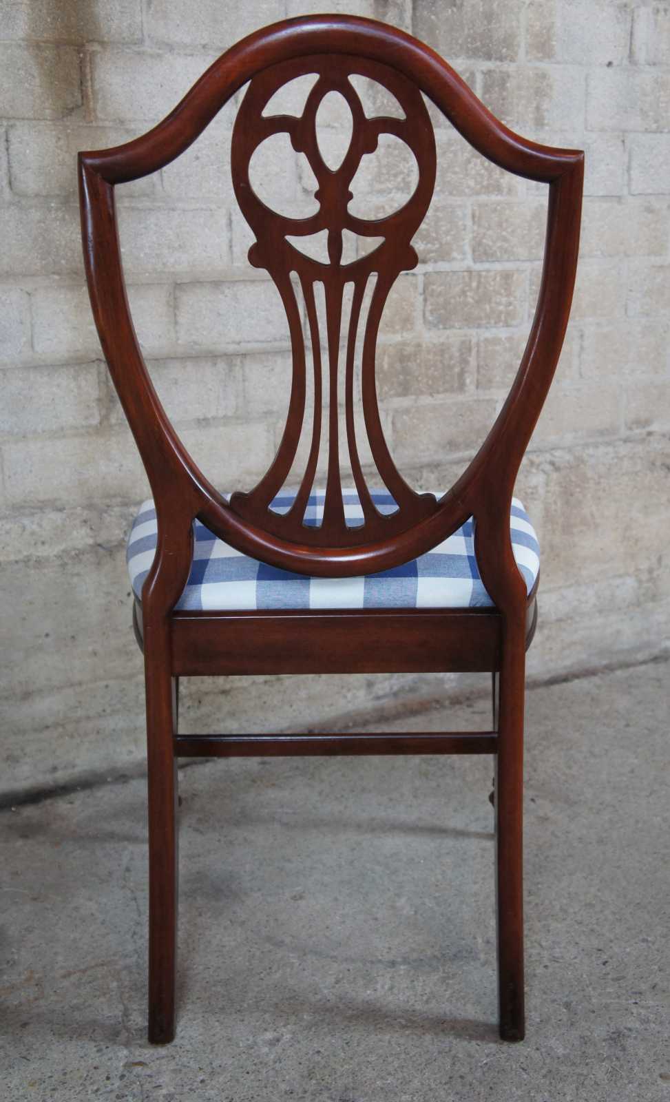 Circa 1940s American Red Mahogany Dining Chairs. Features a blend of sheraton and hepplewhite styling with a pierced shield back. Upholstered in a white and blue check over turned fluted and tapered legs connected by an H stretcher leading down to an arrow/ peg foot.