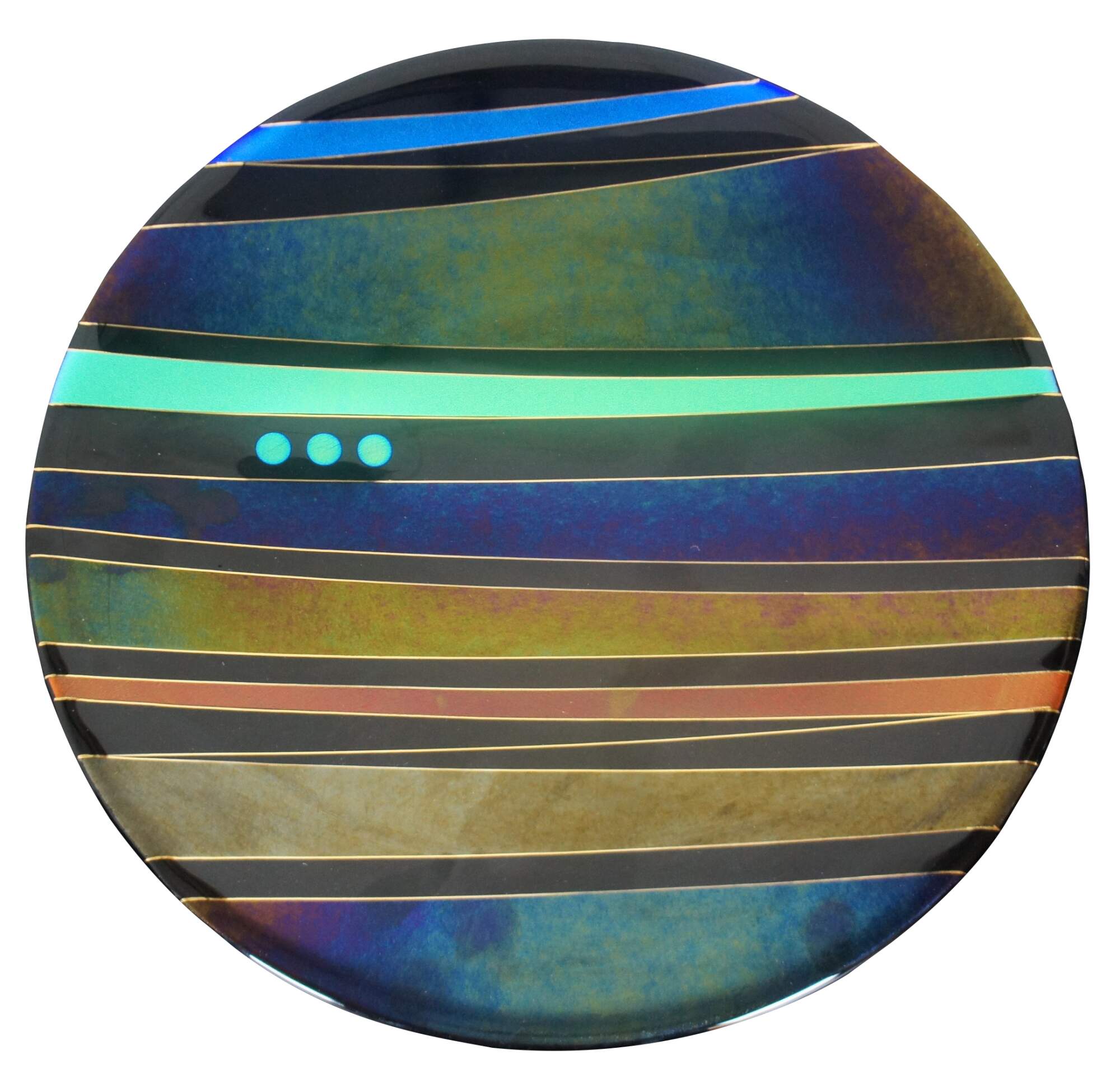 Beautiful Modernist abstract geometric studio art glass plate or charger featuring striped of bold, iridescent colors and gold trim. Made by Jim & Sharon Barrett of Barrett Glass Studios in Memphis, Tennessee.
