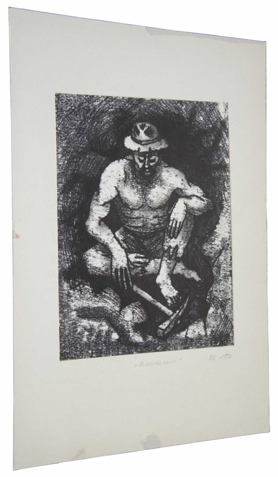 Vintage 1992 black and white Ukrainian etching by Lanyak Dmytro Oleksiiovych titled “Dig In or In The Mine” showing a shirtless miner seated in a cave (gold or coal mine) with a pick axe. Titled and dated in pencil by the artist.
