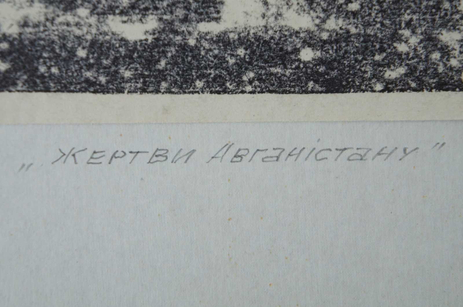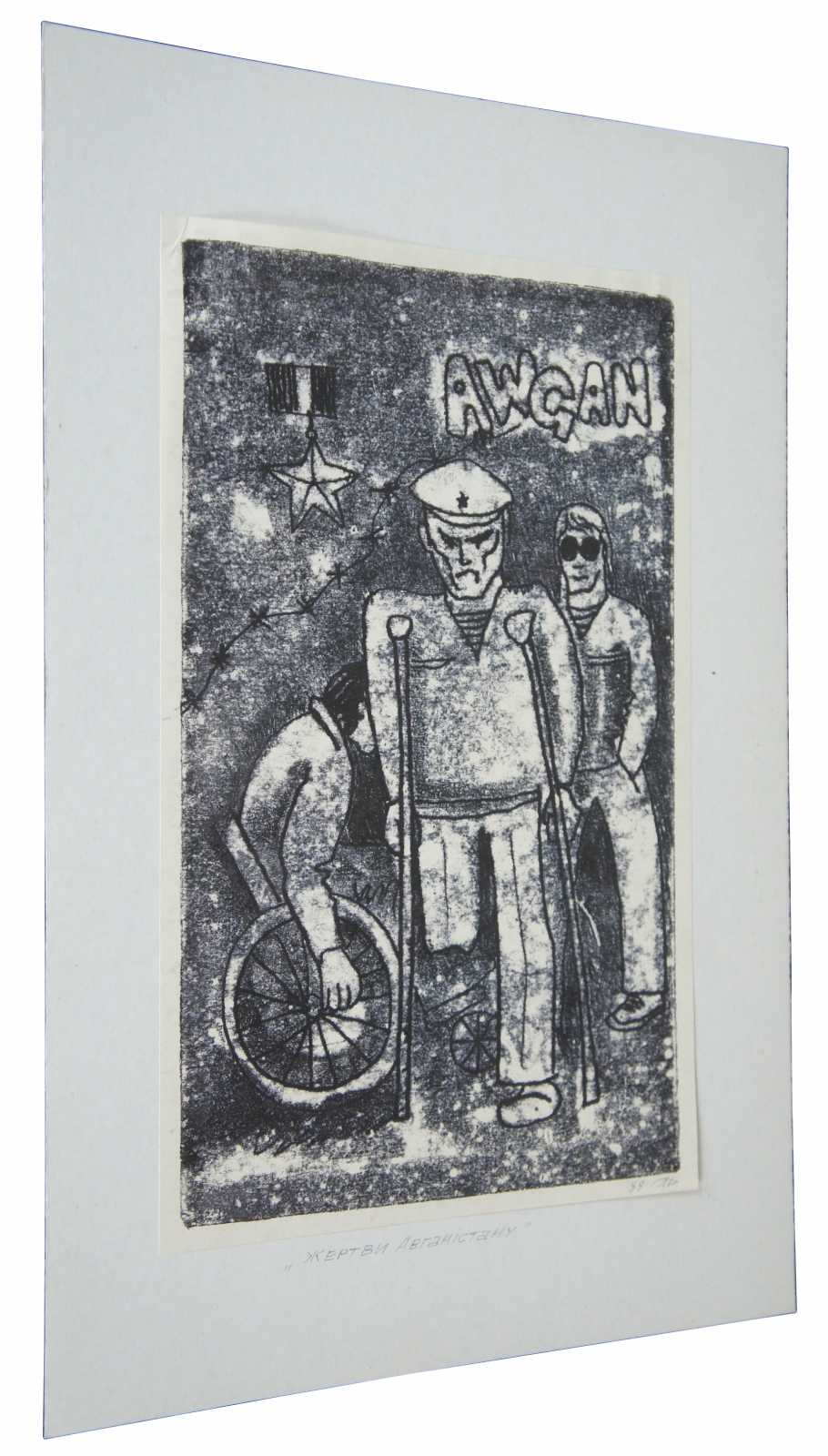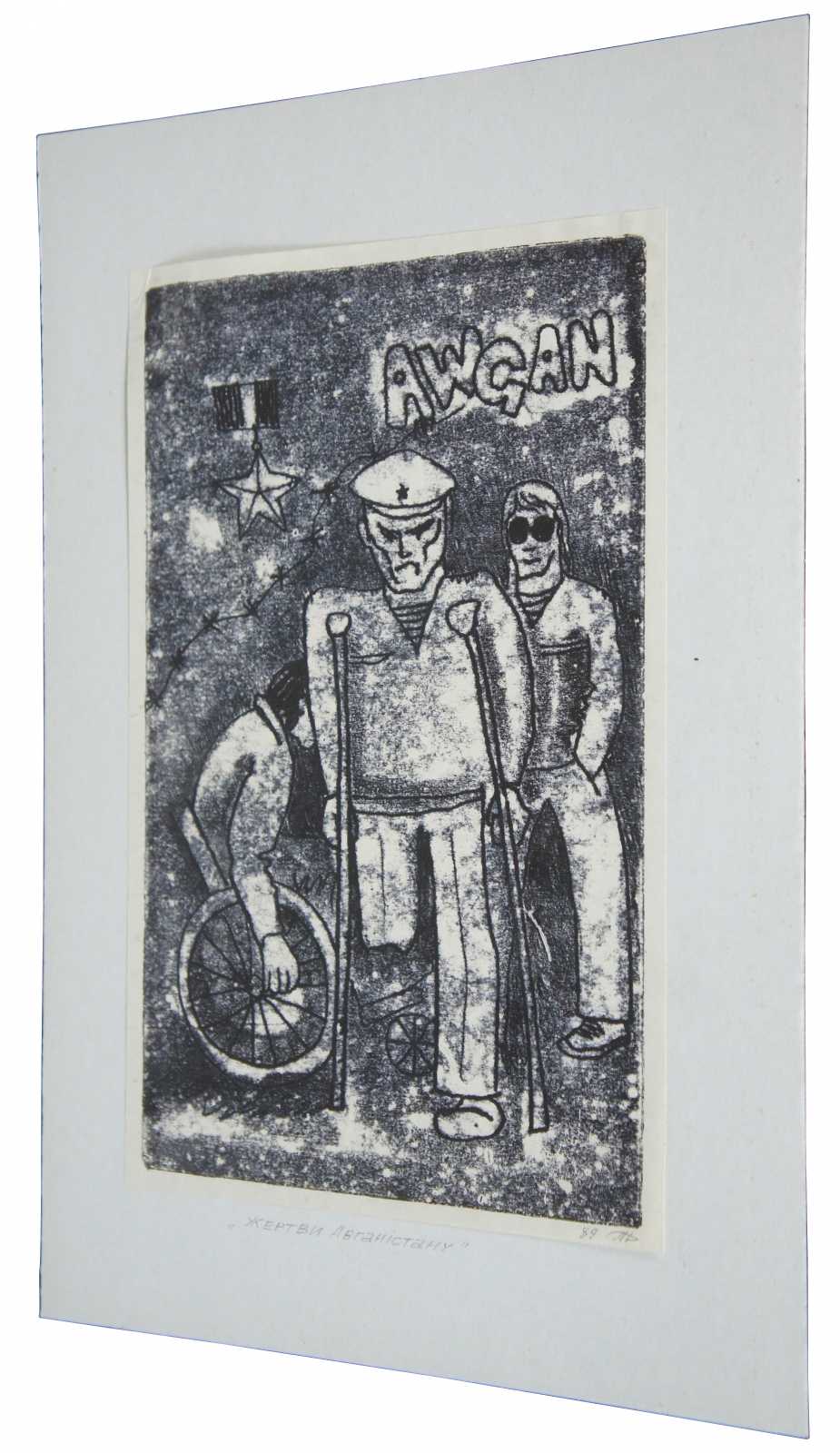 Vintage 1989 black and white Ukrainian etching by Lanyak Dmytro Oleksiiovych titled “Victims of Afghanistan” showing three figures with various war wounds. Titled and dated in pencil by the artist.