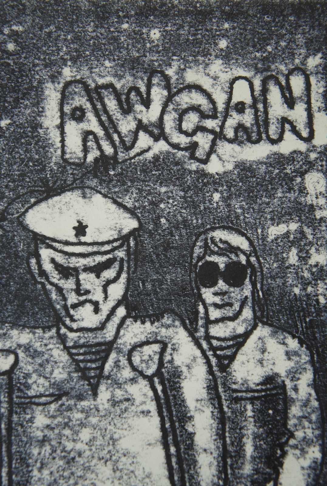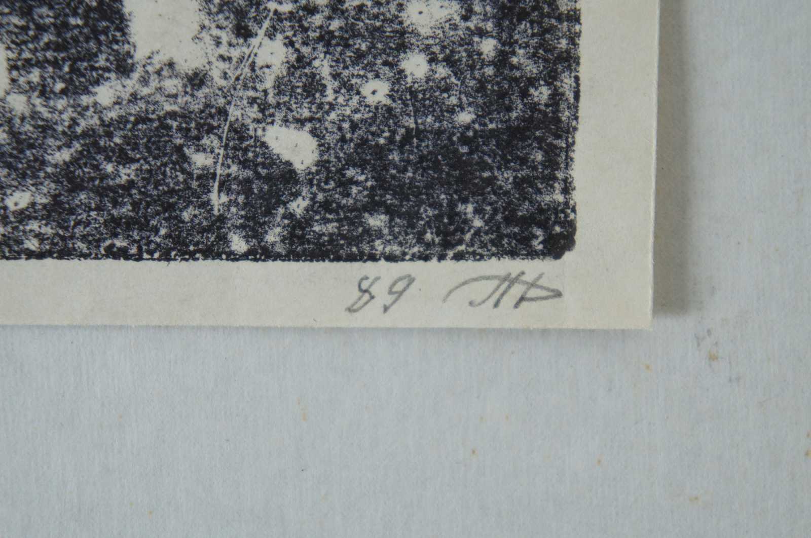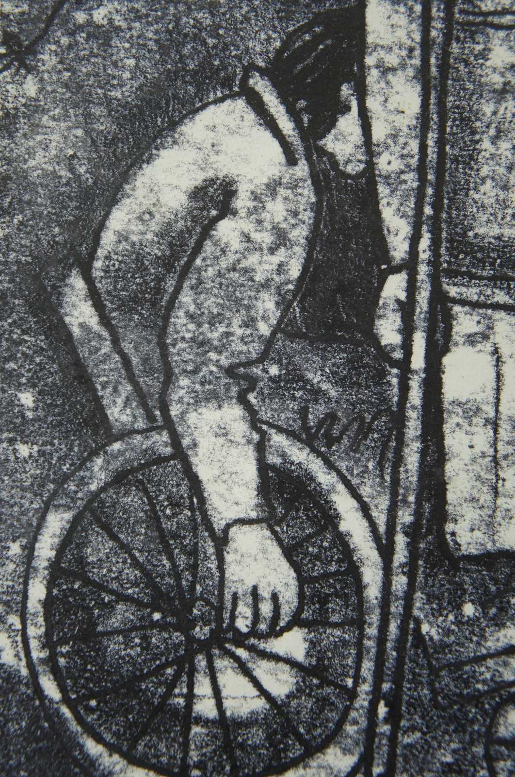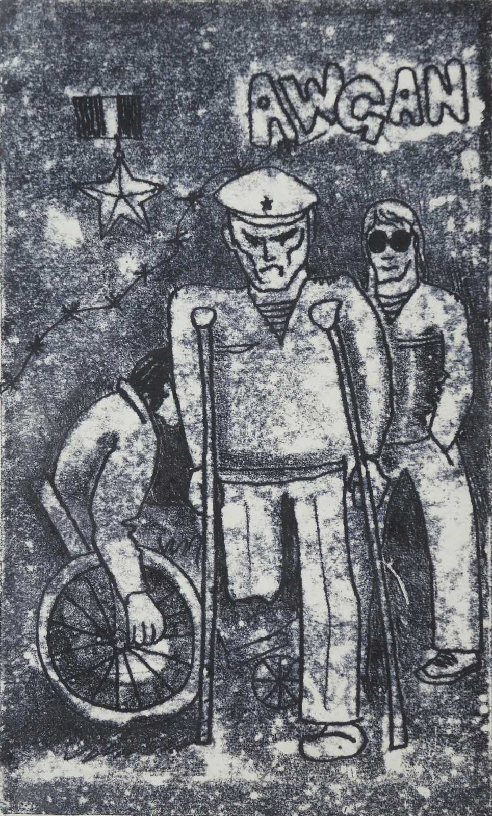 Vintage 1989 black and white Ukrainian etching by Lanyak Dmytro Oleksiiovych titled “Victims of Afghanistan” showing three figures with various war wounds. Titled and dated in pencil by the artist.