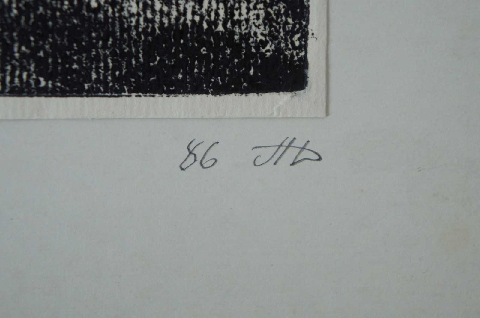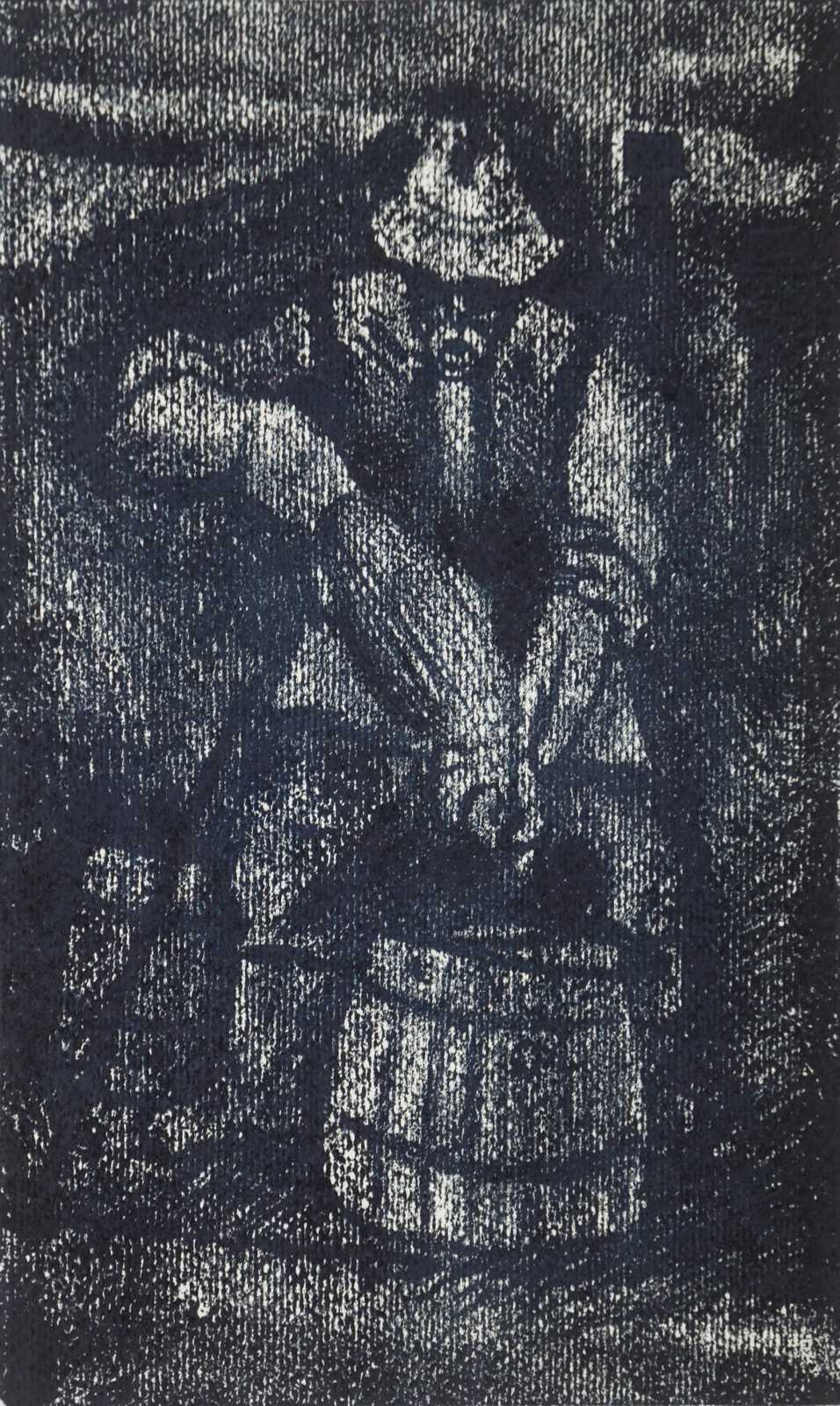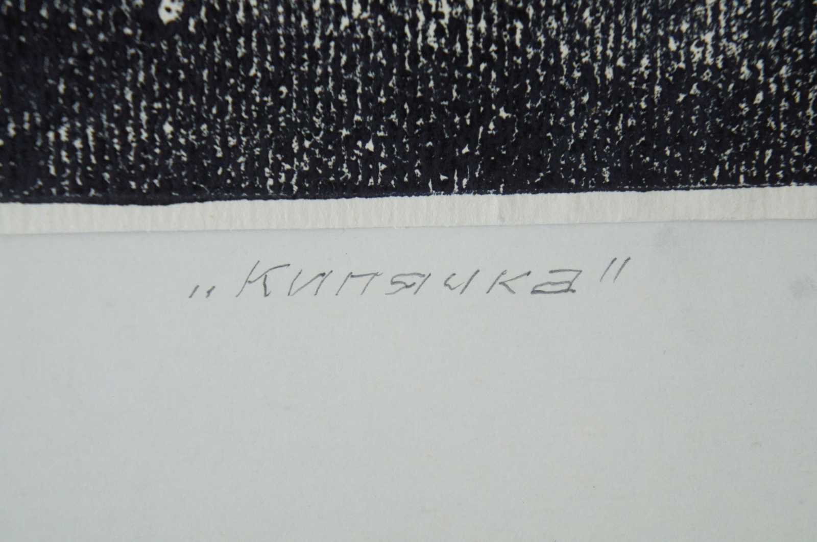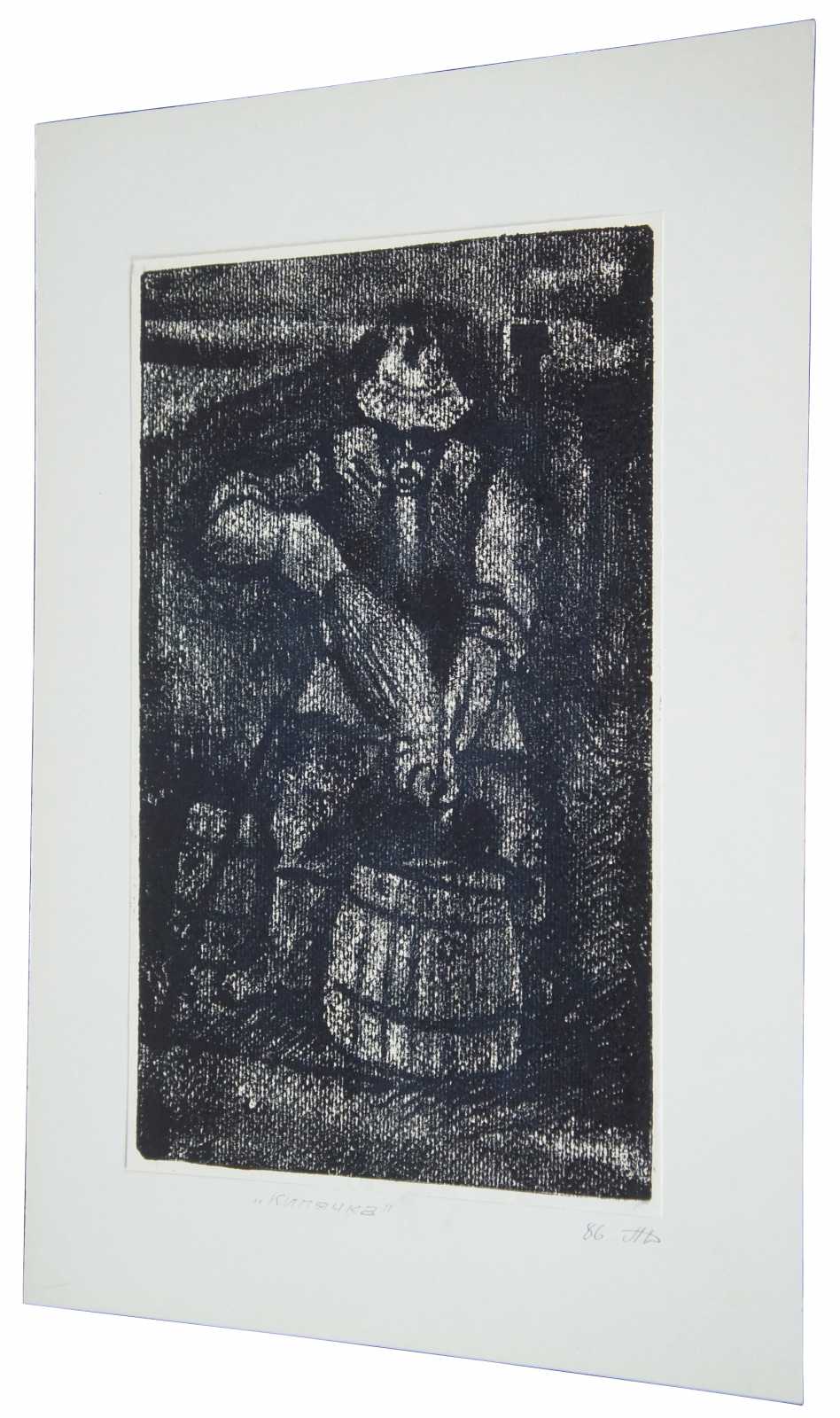 Vintage 1986 black and white Ukrainian etching by Lanyak Dmytro Oleksiiovych titled “Boiler,” showing a man wringing / twisting / draining water / oil into an barrel with factory stacks in the background. Titled and dated in pencil by the artist.