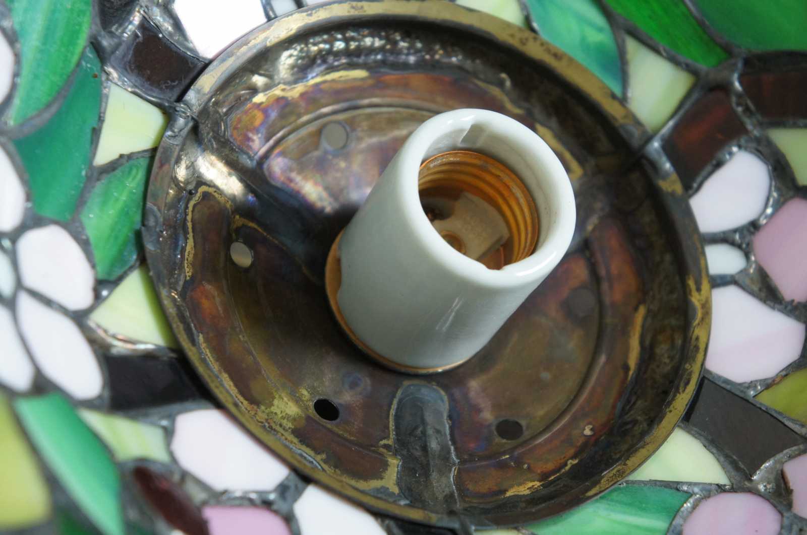 Vintage Tiffany style, leaded slag glass, ceiling mounted pendant light featuring a pattern of leaves, cherry blossoms and cherries.