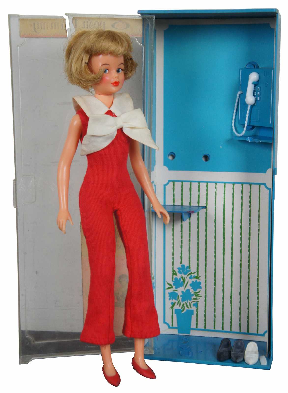 Vintage 1965 Pos’n Tammy doll by Ideal Toy corp, in her original red jumpsuit outfit and plastic telephone booth. Also included are black and white shoes (one missing) and hair comb.