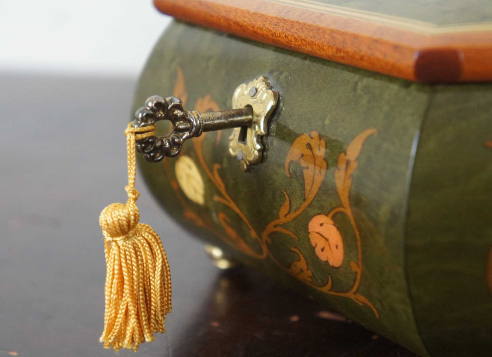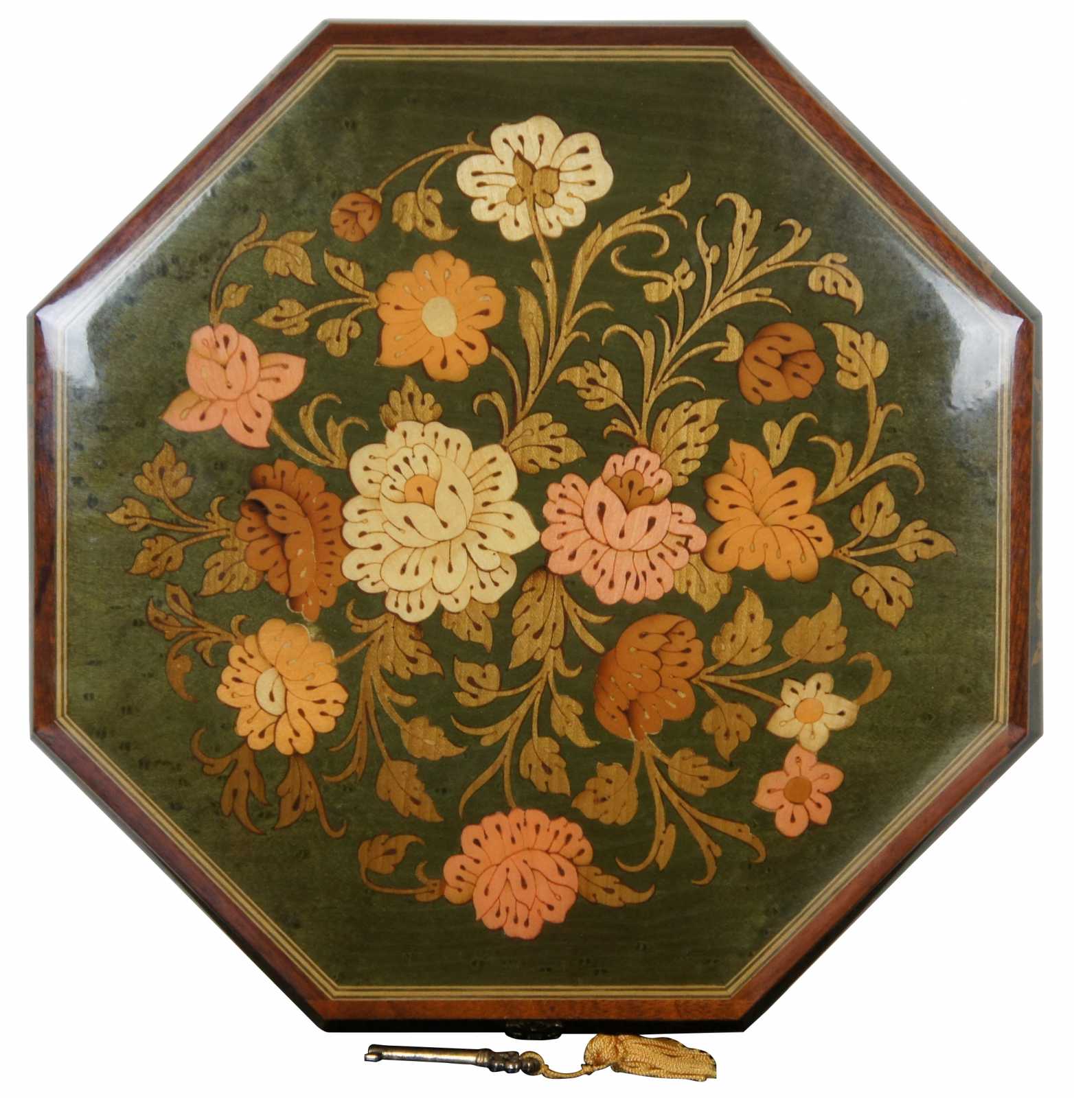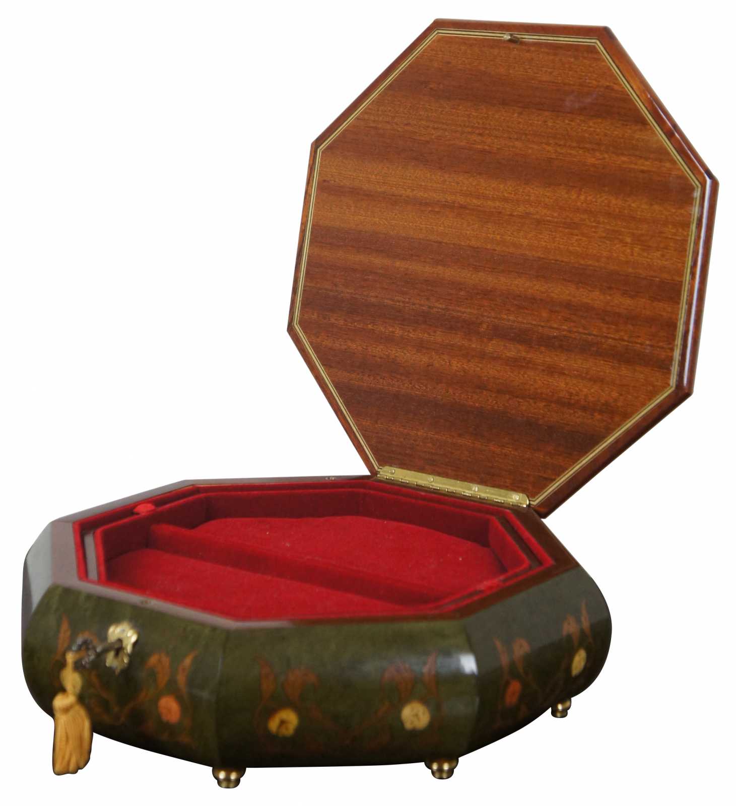 Octagonal jewelry/music box with interior tray, red lining, key with gold tassel, and a green exterior with salmon and ivory flowers. Labeled as playing “My Sun.”
