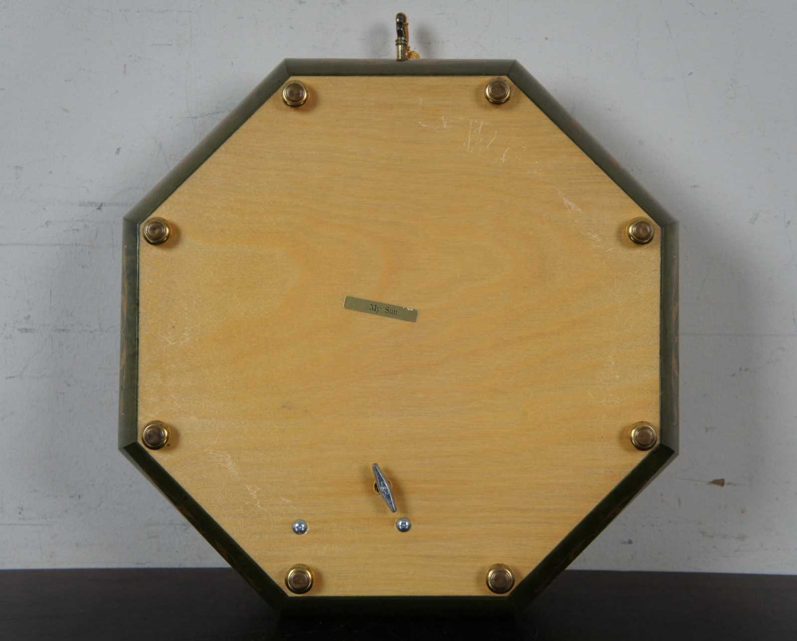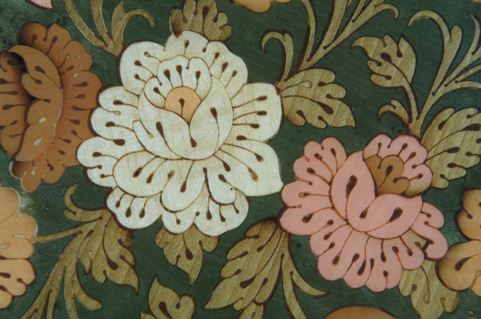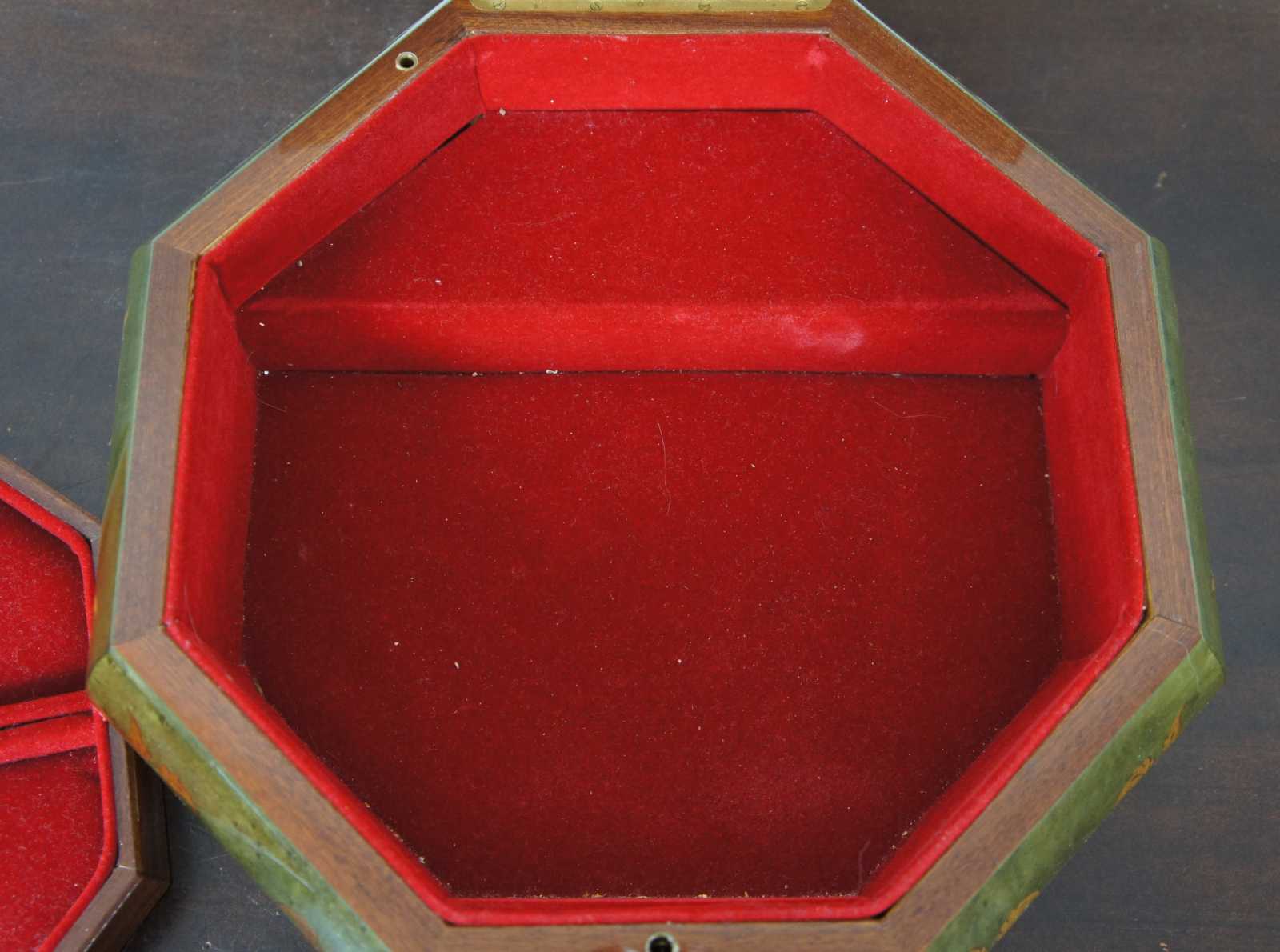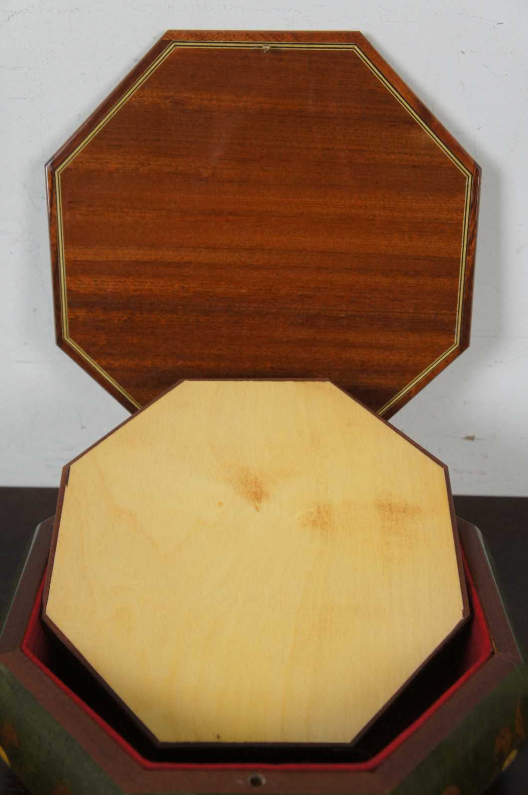 Octagonal jewelry/music box with interior tray, red lining, key with gold tassel, and a green exterior with salmon and ivory flowers. Labeled as playing “My Sun.”