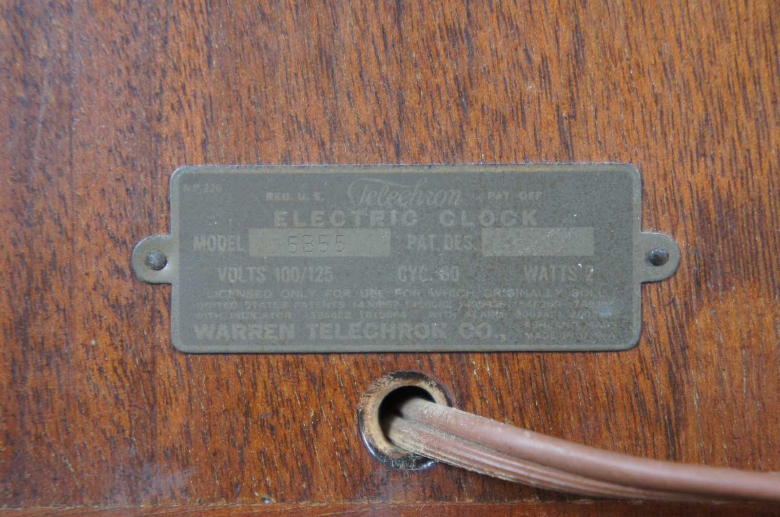 Antique working 1938 Warren Telechron mantel clock, Model 5B55 - The Congress – featuring a walnut case with holly art deco stripes. This model was designed by Leo Lvan Bruce and was produced from 1937 to 1938; only 1,926 were sold.