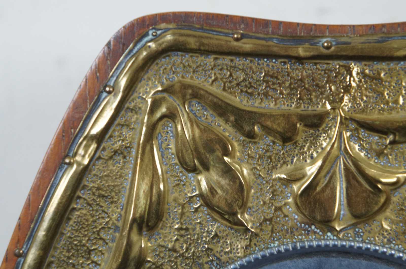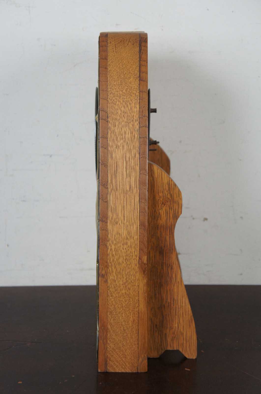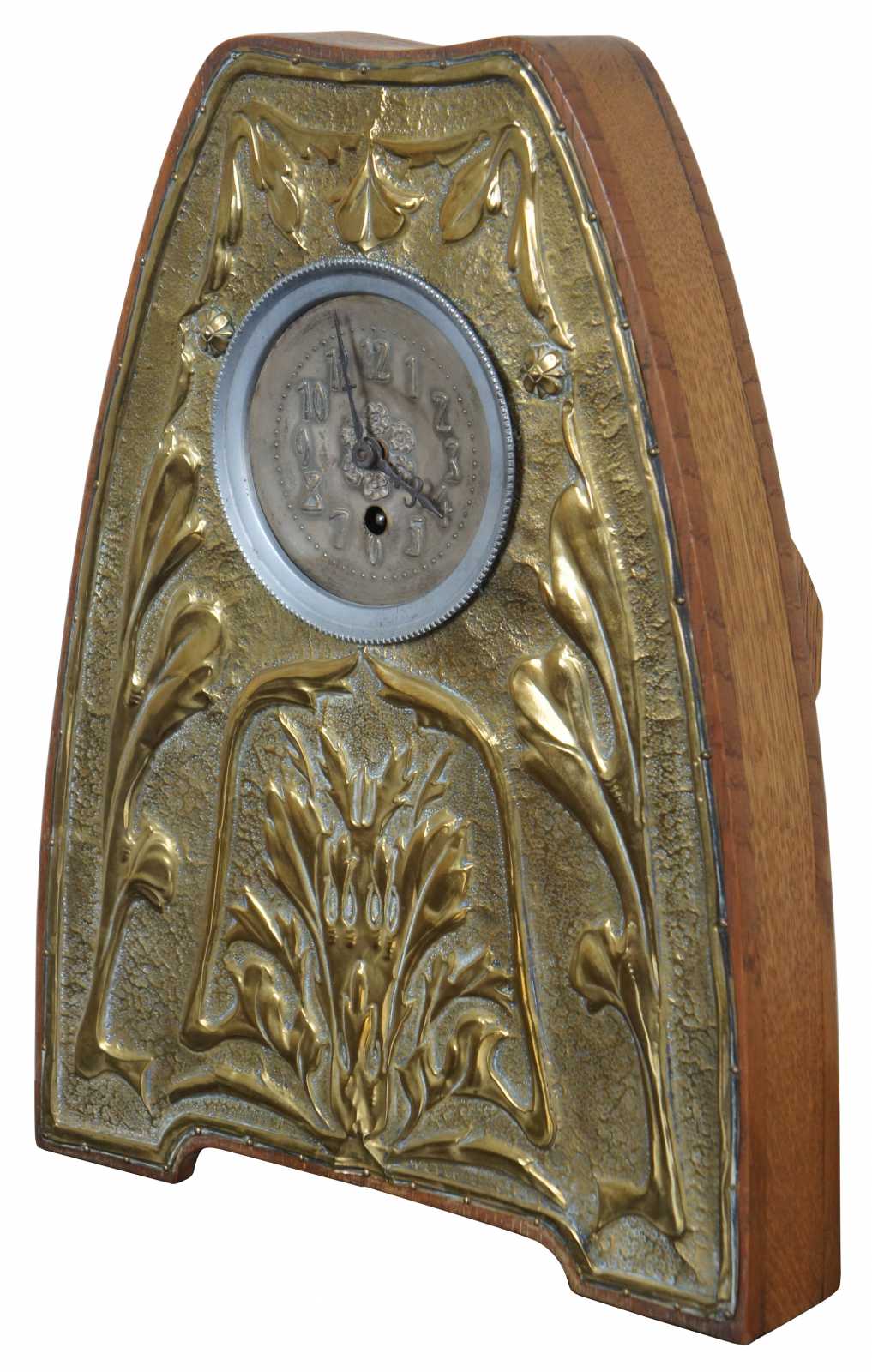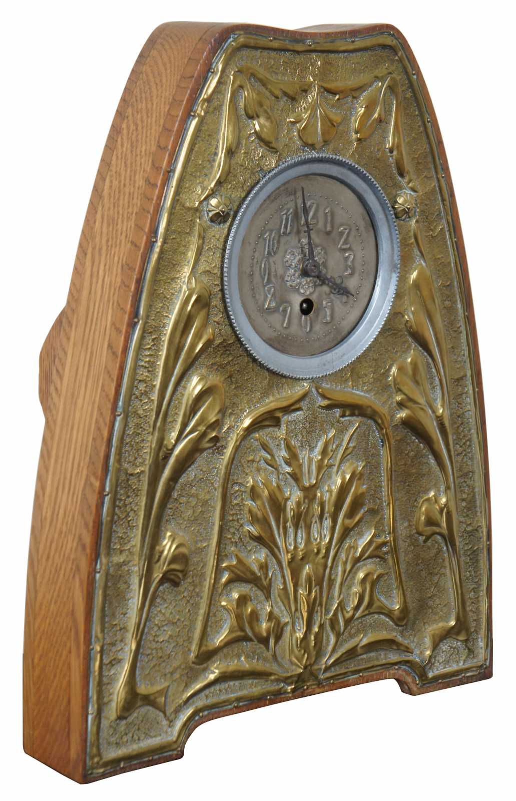 Antique Belgian mantel clock with a oak case and hammered brass panel on front with leaf / floral pattern.