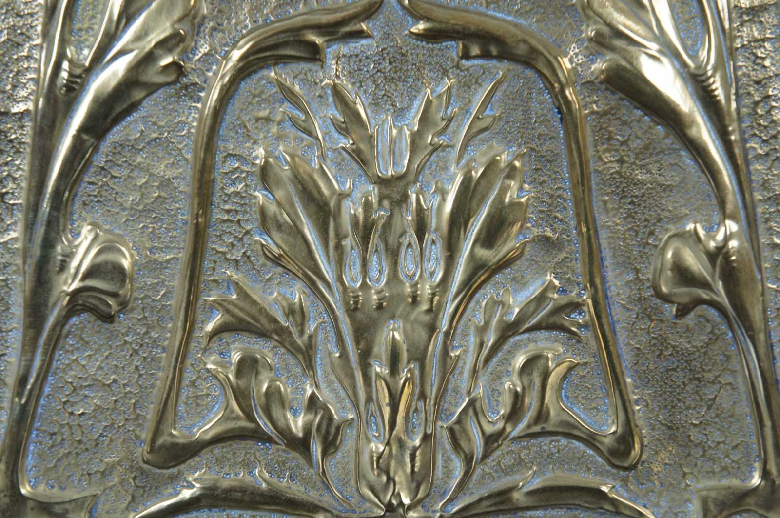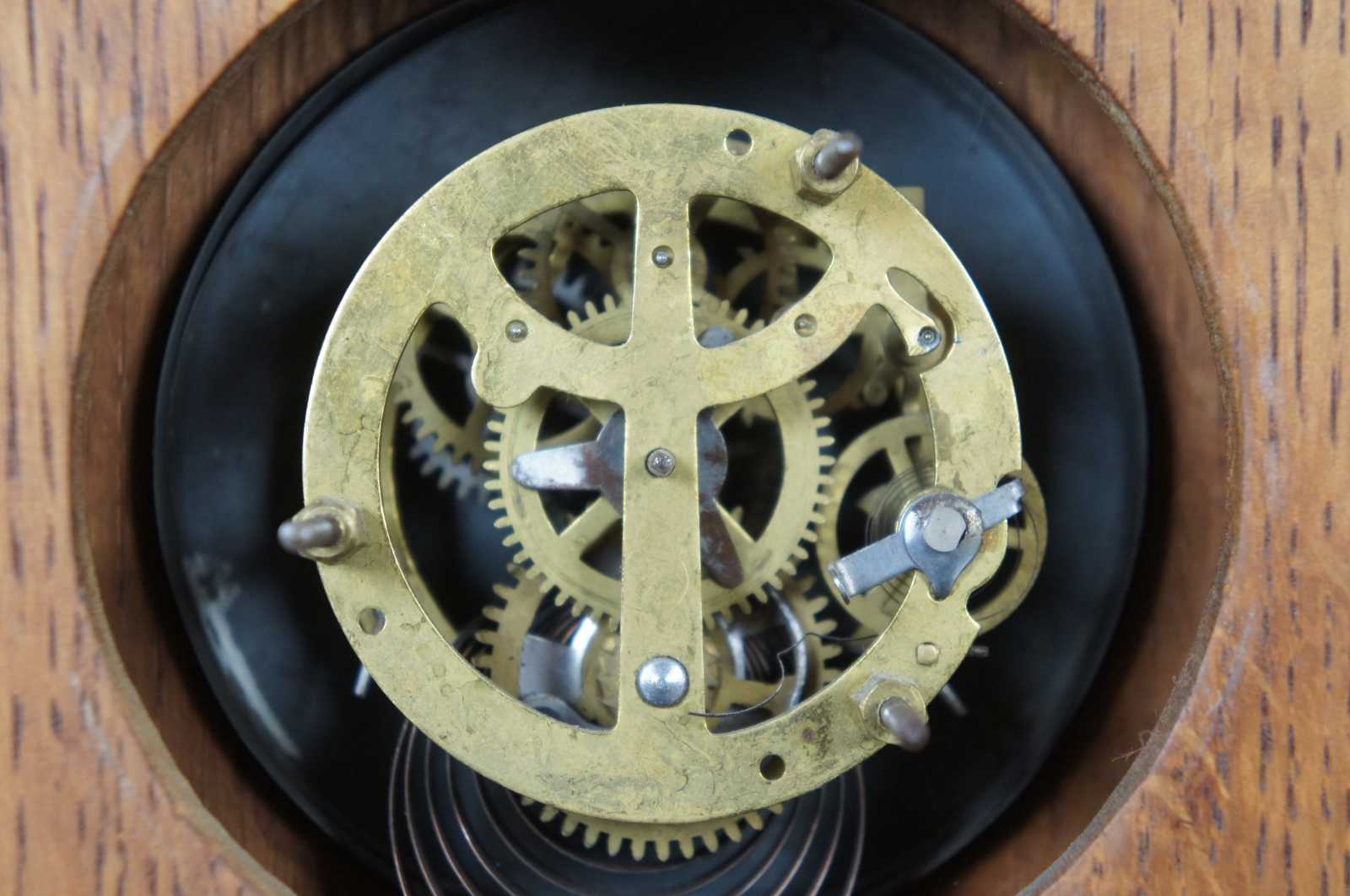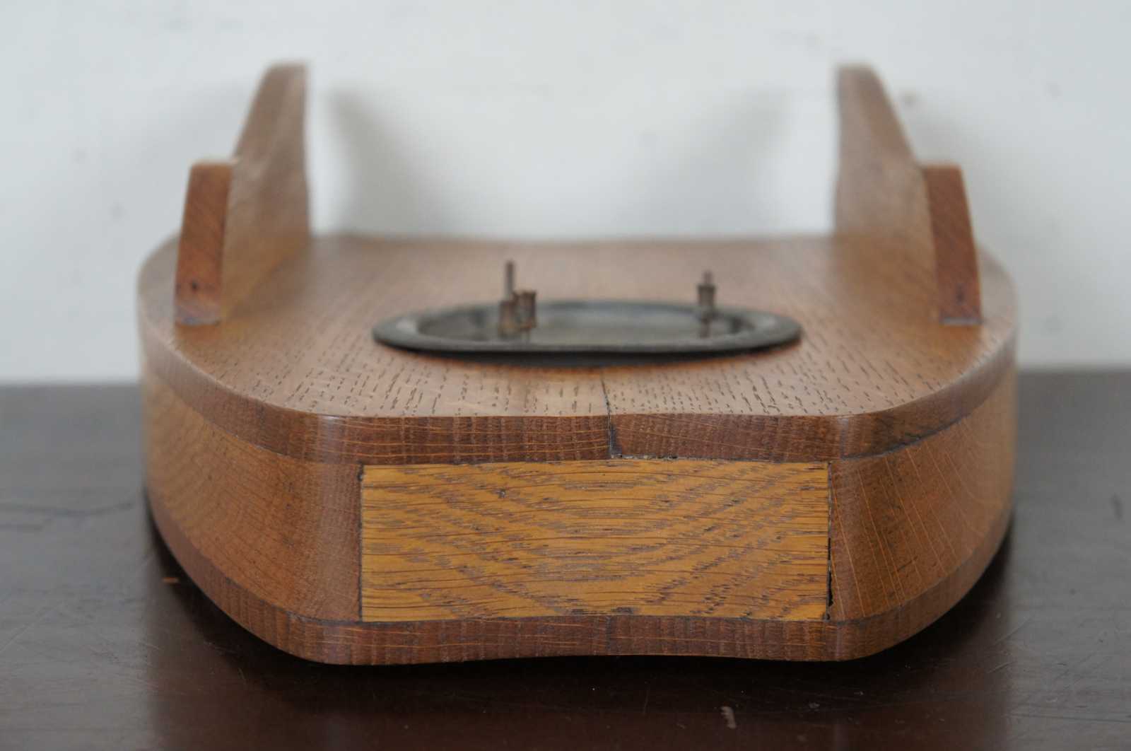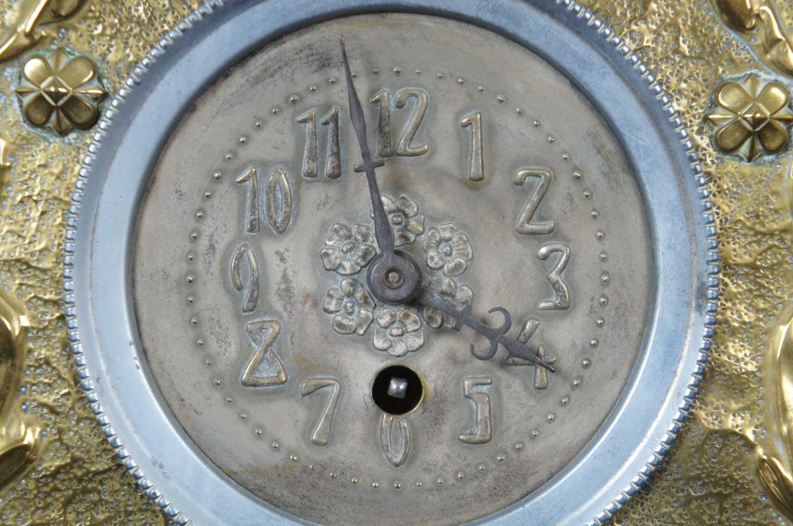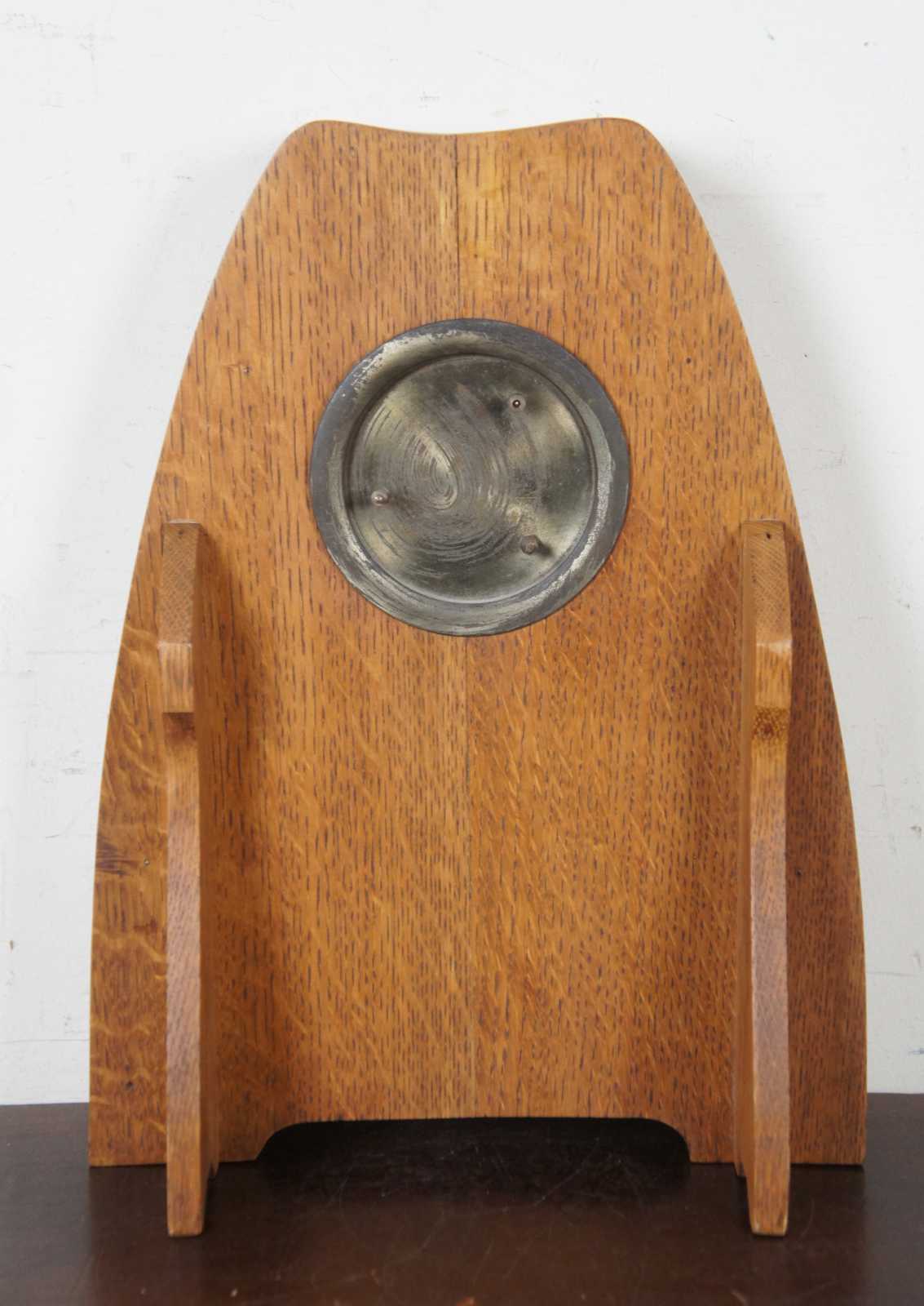 Antique Belgian mantel clock with a oak case and hammered brass panel on front with leaf / floral pattern.
