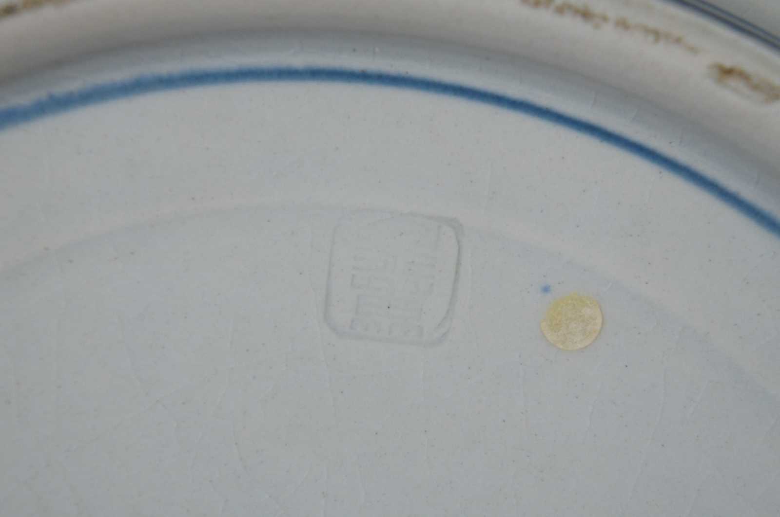 Antique Japanese Imari blue and white porcelain plate or charger featuring a gnarled pine with water at the base and three cranes / storks. Signed / marked / stamped on front and back.