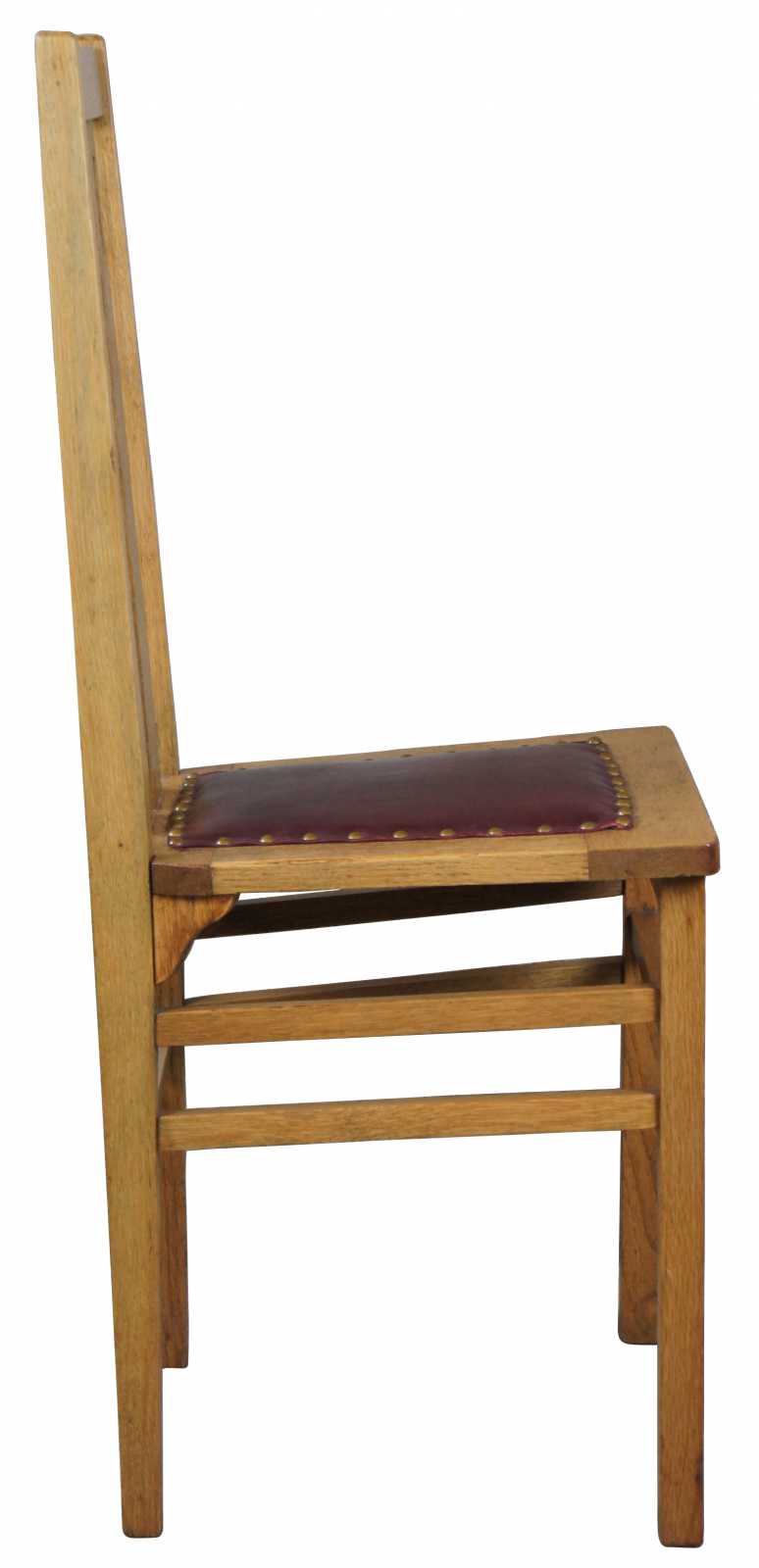 Circa 1920s arts and crafts oak dining or side chair. Features a burgundy leather seat with nailhead trim and a pierced rear splats with ribbon design.