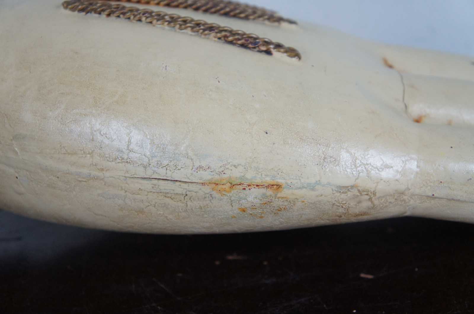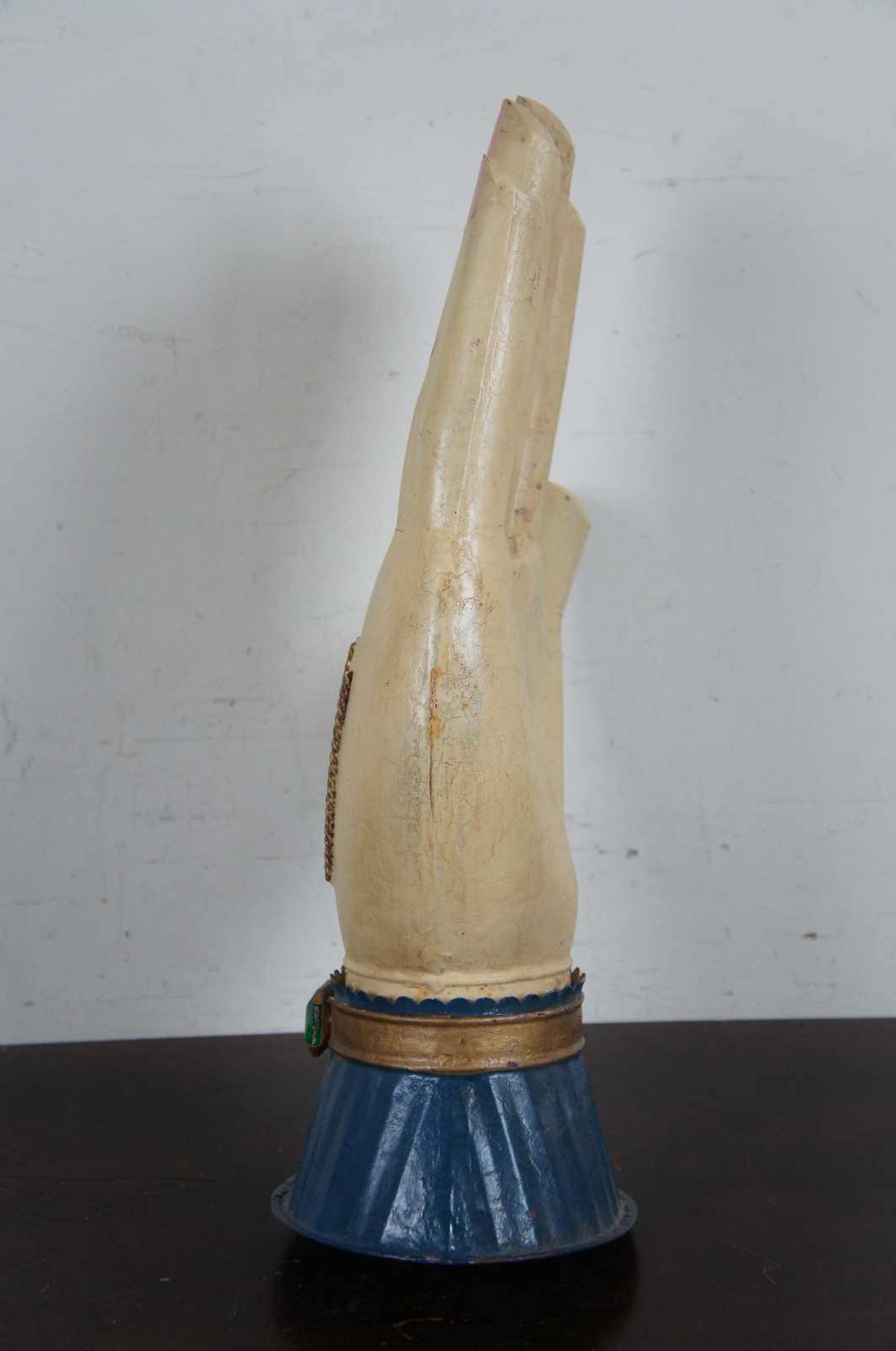 Vintage metal semi-realistic oversized human hand, with a blue cuff and bronze painted bracelet with a green glass gem, detailing on the back of the hand reminiscent of vintage gloves and pink painted nails. The base of the wrist is painted red with a bracket to attach the hand to another surface.