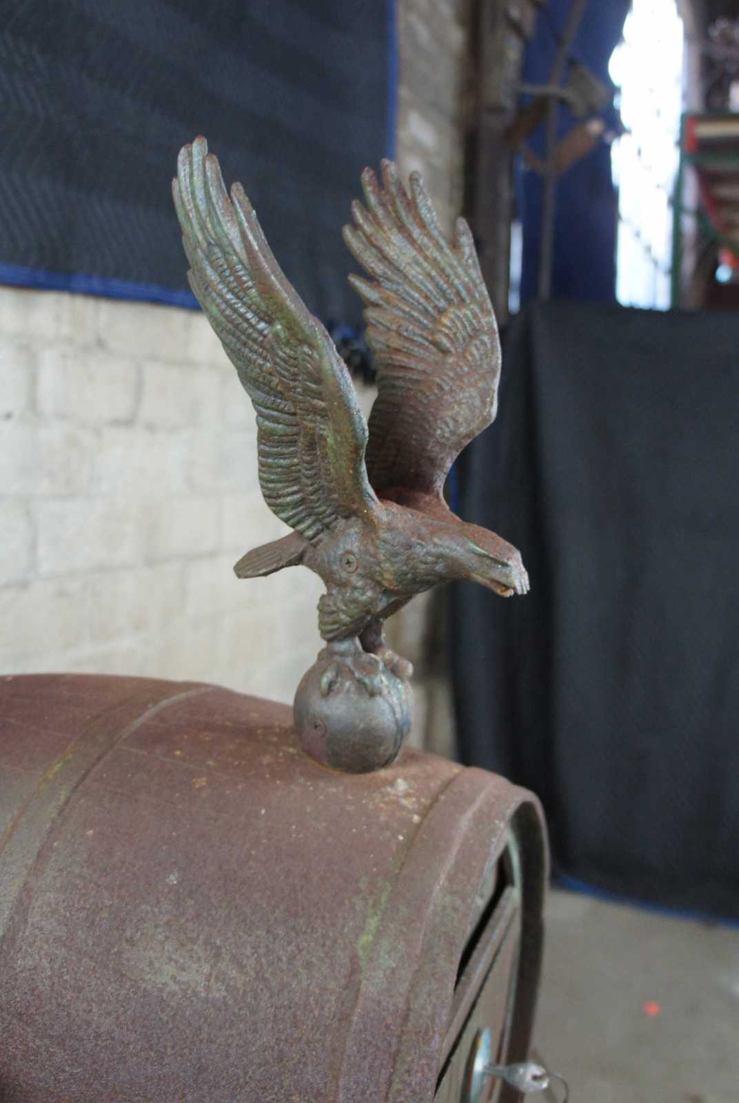 A fun vintage cast iron oak barrel shaped mailbox. Features an eagle finial and ornate base that can be bolted to the ground for safetly. Includes lock and key.