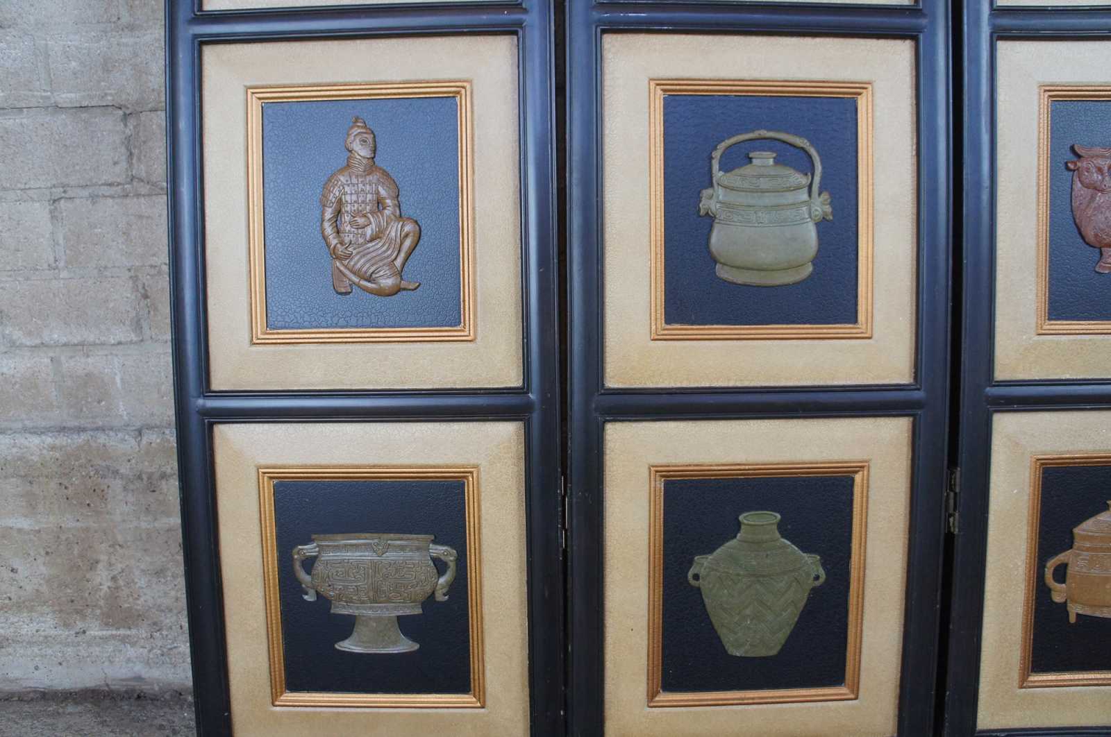 Vintage Chinese style room divider or folding screen. Made of wood and faux stone carved into ornate sillouettes of animals and pottery. Features a dragon / serpent, bear / dog, cow / bull, sensors, pots, pitchers, incents burners, buddha, vessels, a warrior / man and a monkey.