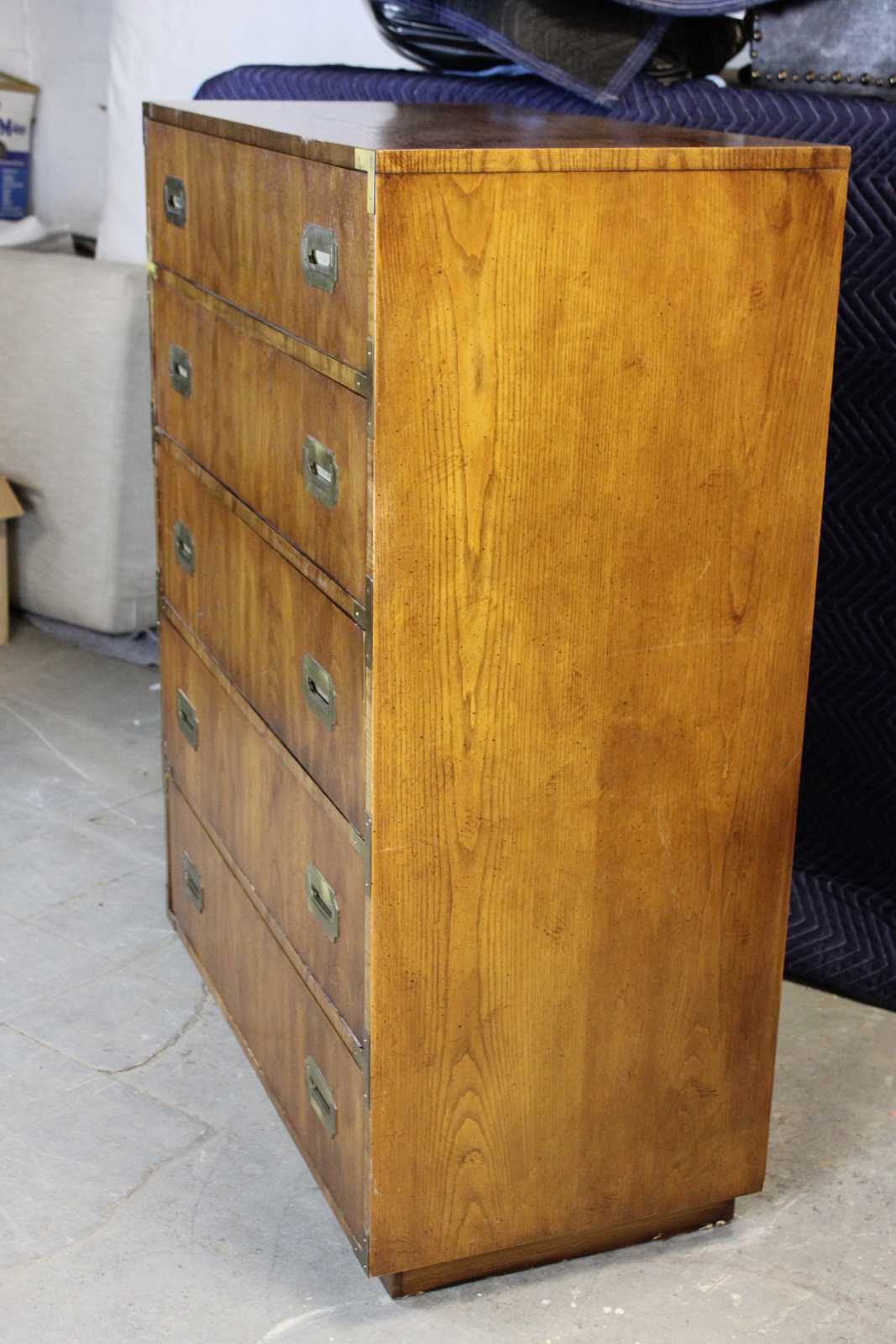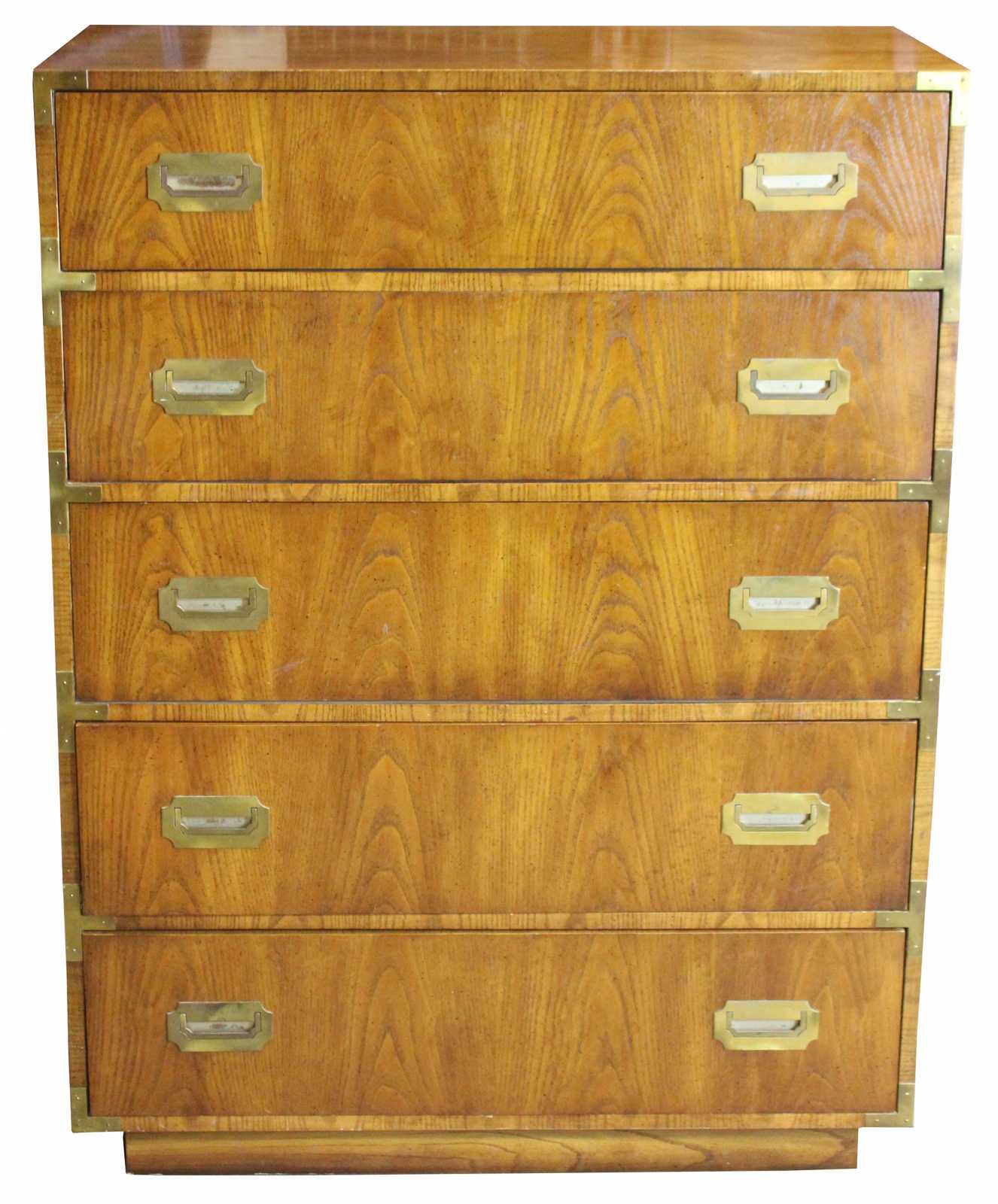 Circa 1975 Dixie Campaigner tallboy chest of drawers or dresser. Made of walnut with brass accents. 767-307