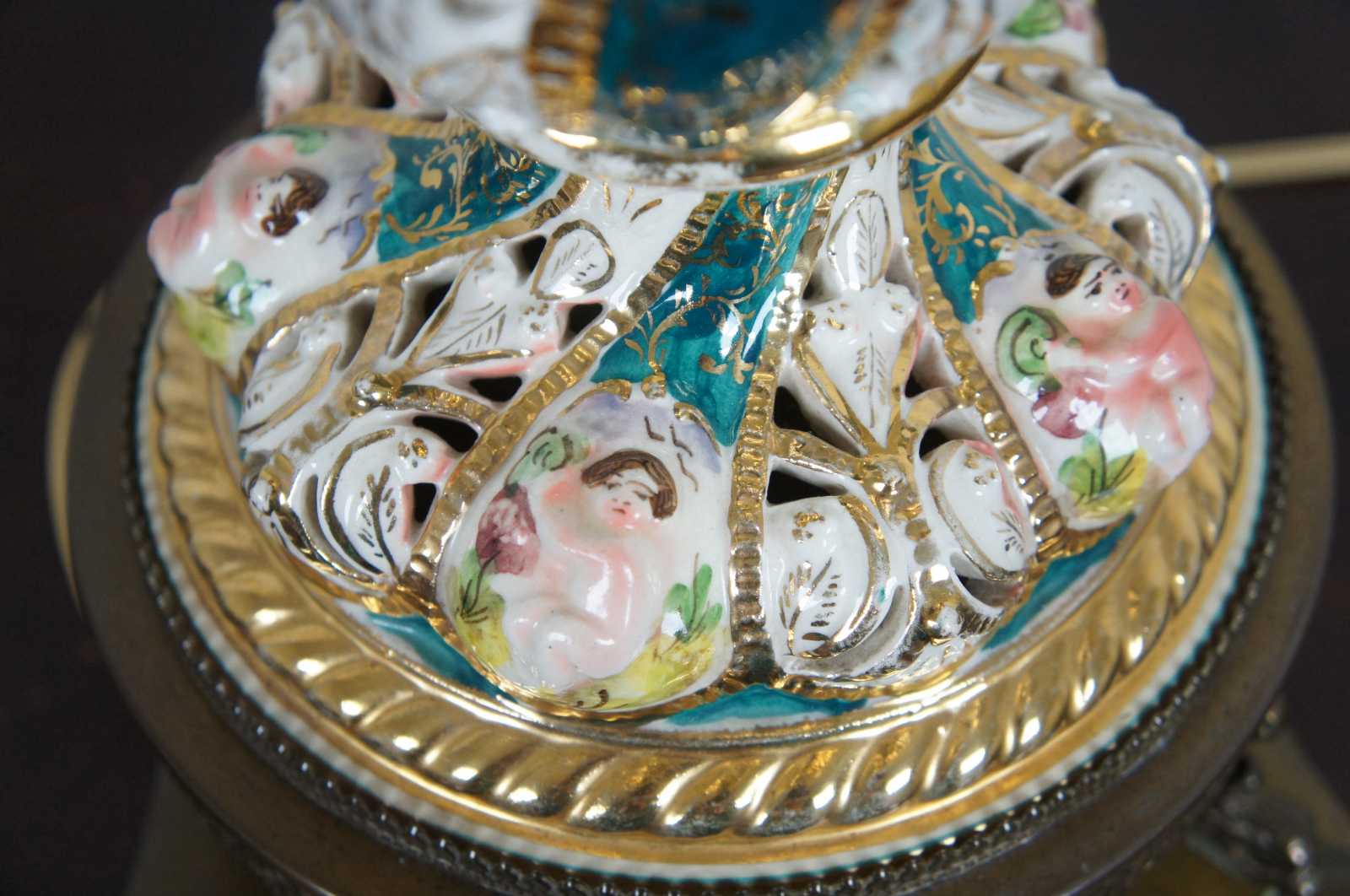 Antique Italian capodimonte style table lamp featuring a swirling, reticulated pattern of green and white stripes along an urn shaped body with painted figures and cherubs, standing upon a brass dolphin footed base. Also includes a white brocade and lace shade.