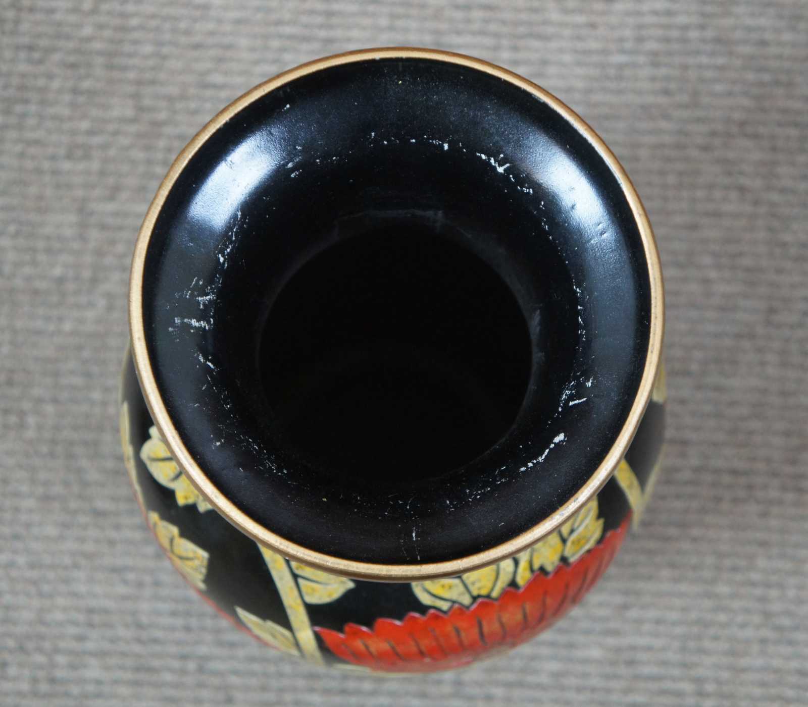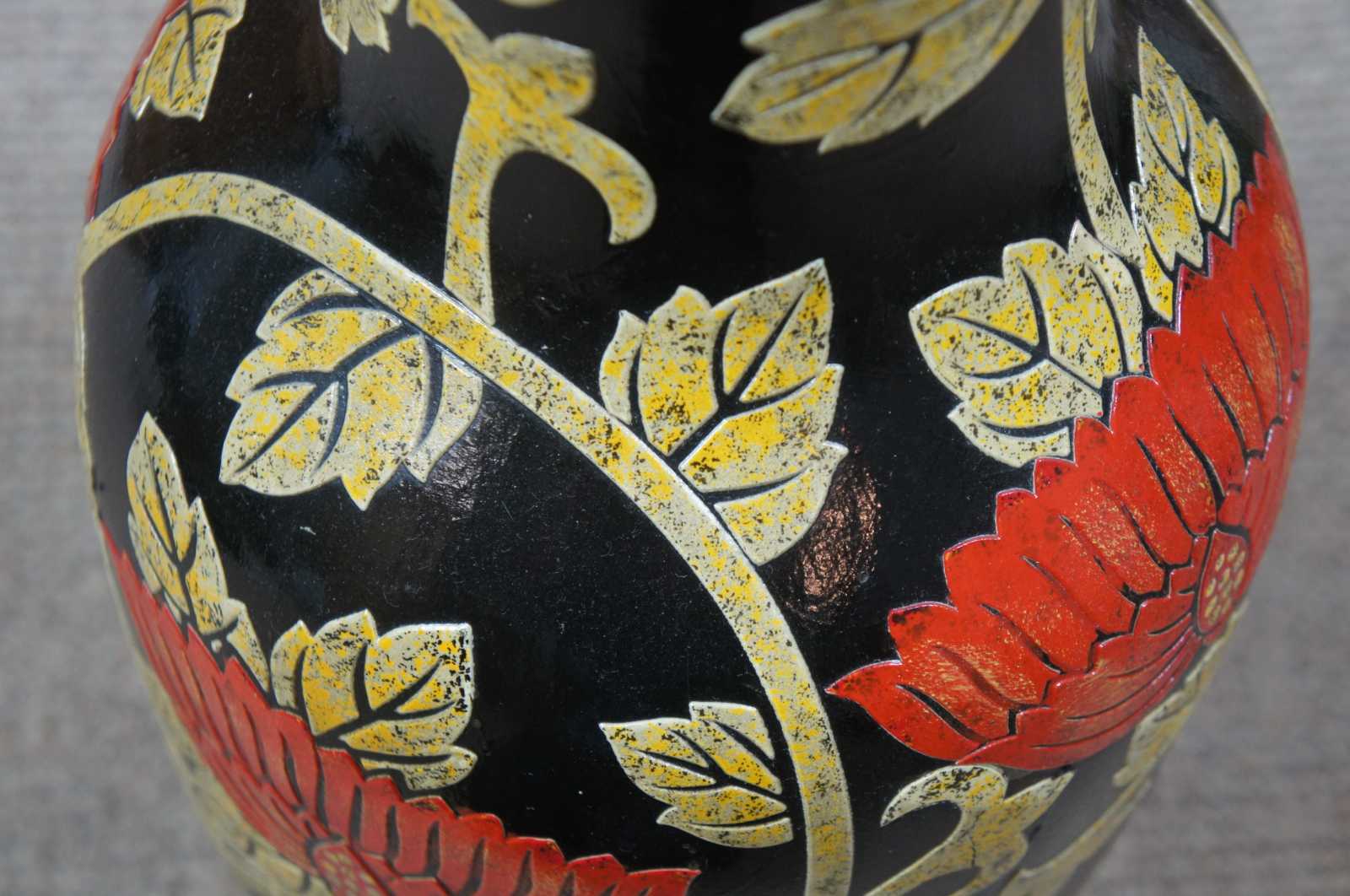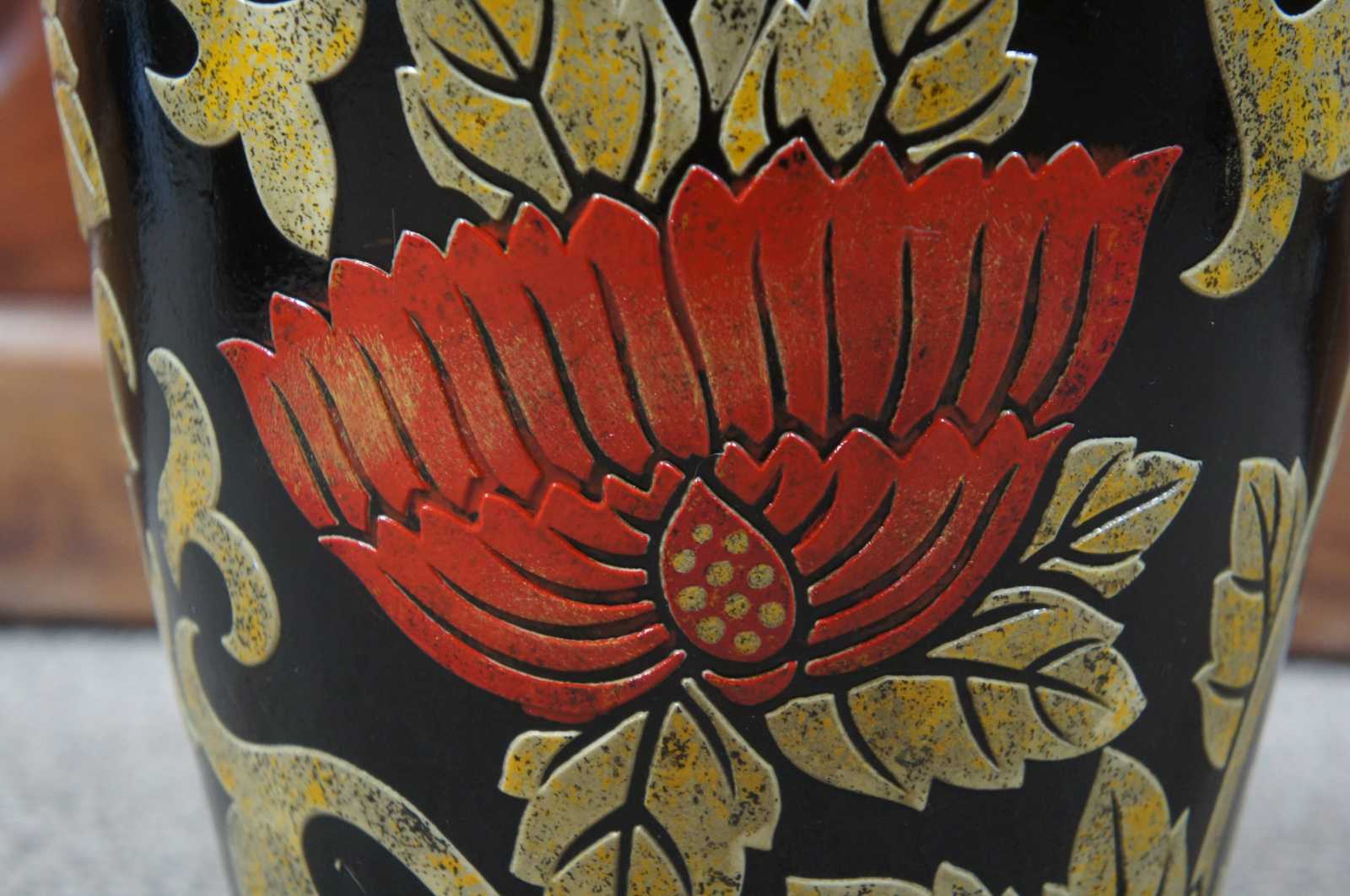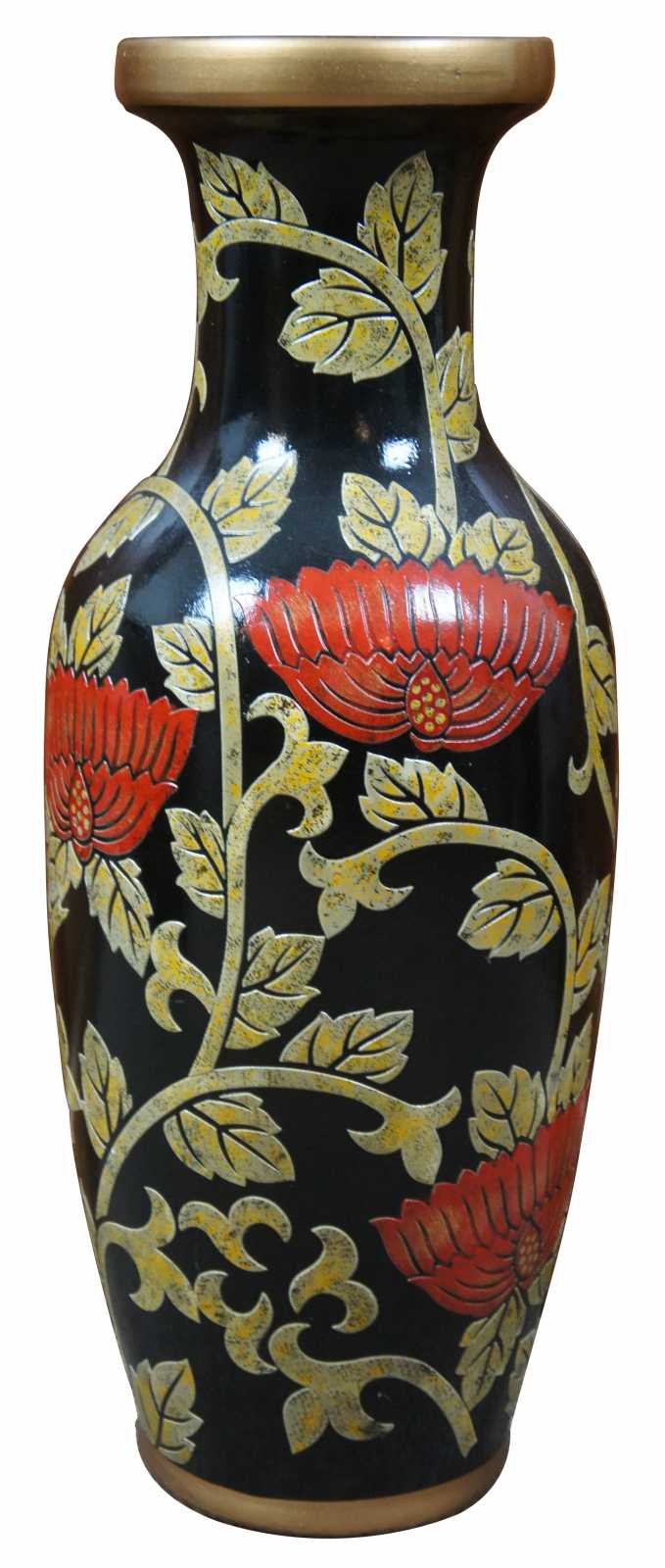 Vintage ceramic Asian floor vase featuring red flowers and yellow vines swirling over a black background.