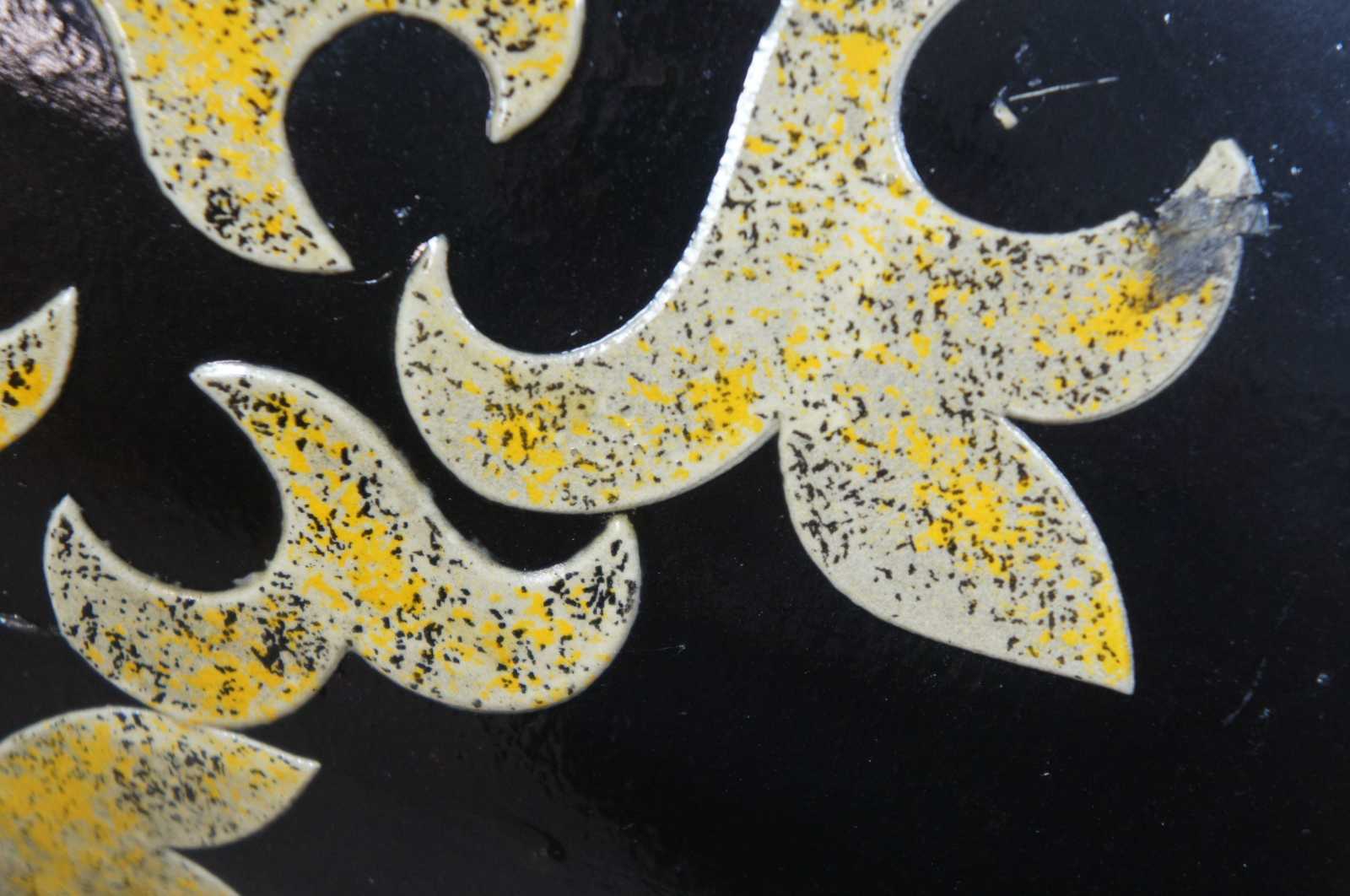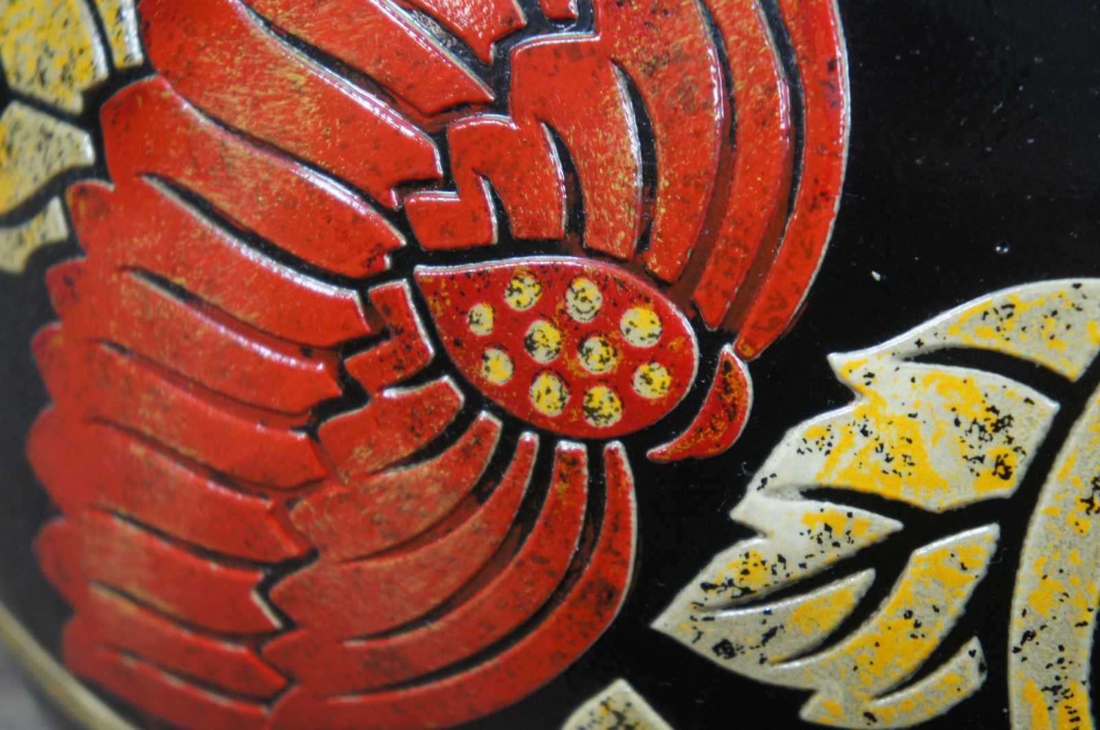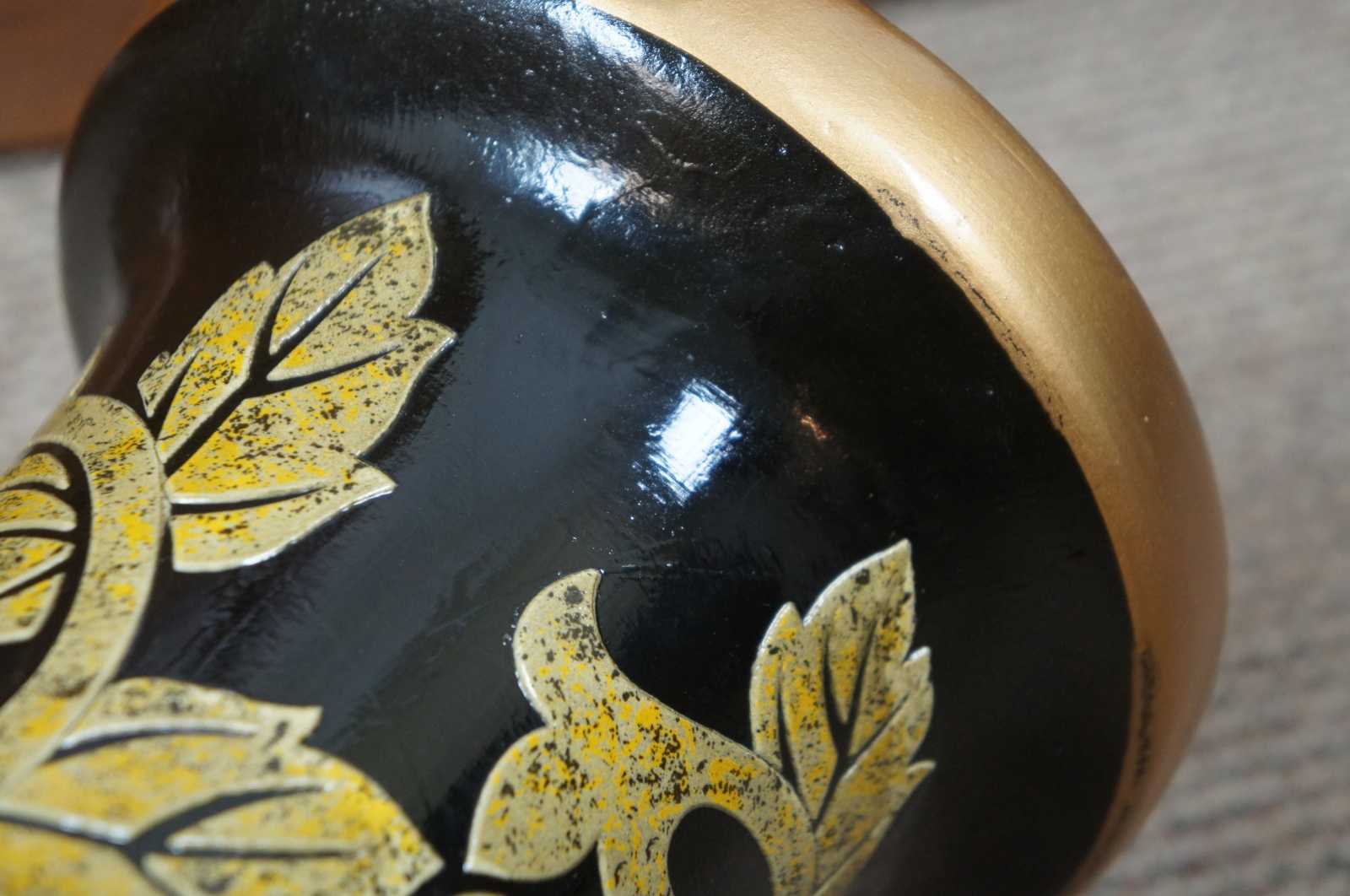 Vintage ceramic Asian floor vase featuring red flowers and yellow vines swirling over a black background.