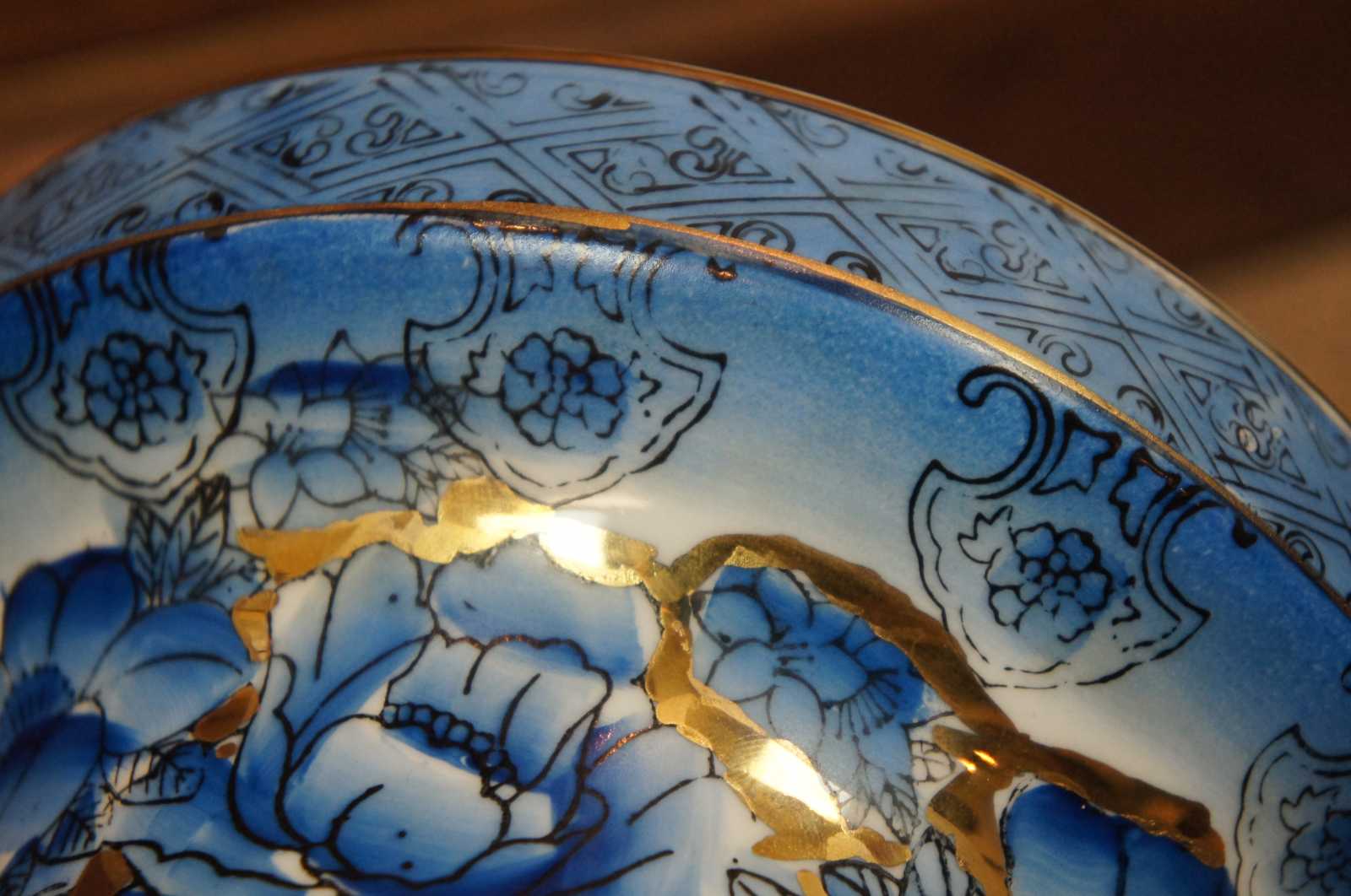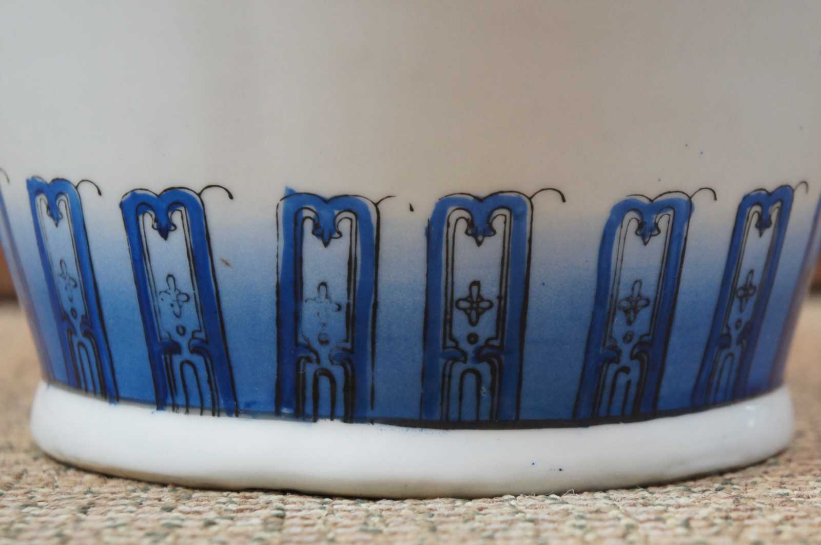 Vintage blue and white gilded Asian floor vase or urn with a design of flowers and birds.