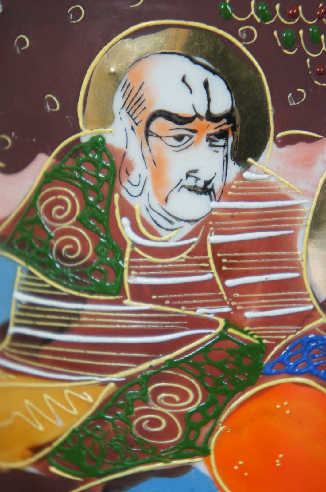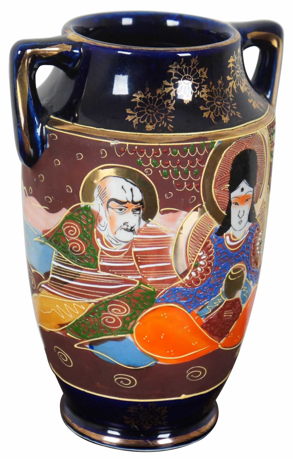 Vintage Satsuma / Moriage porcelain vase with handles, painted / enameled with three Japanese meiji figures.