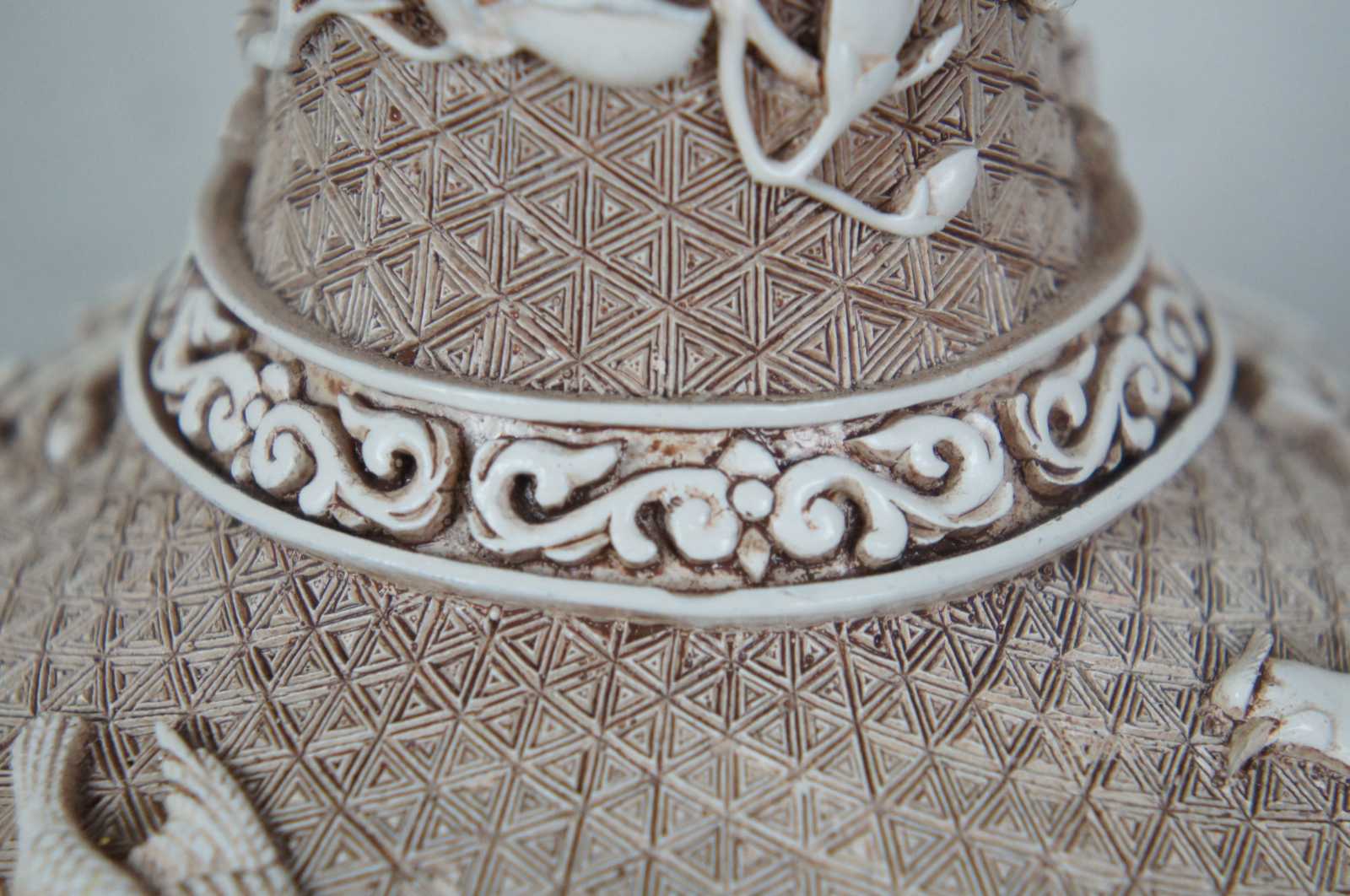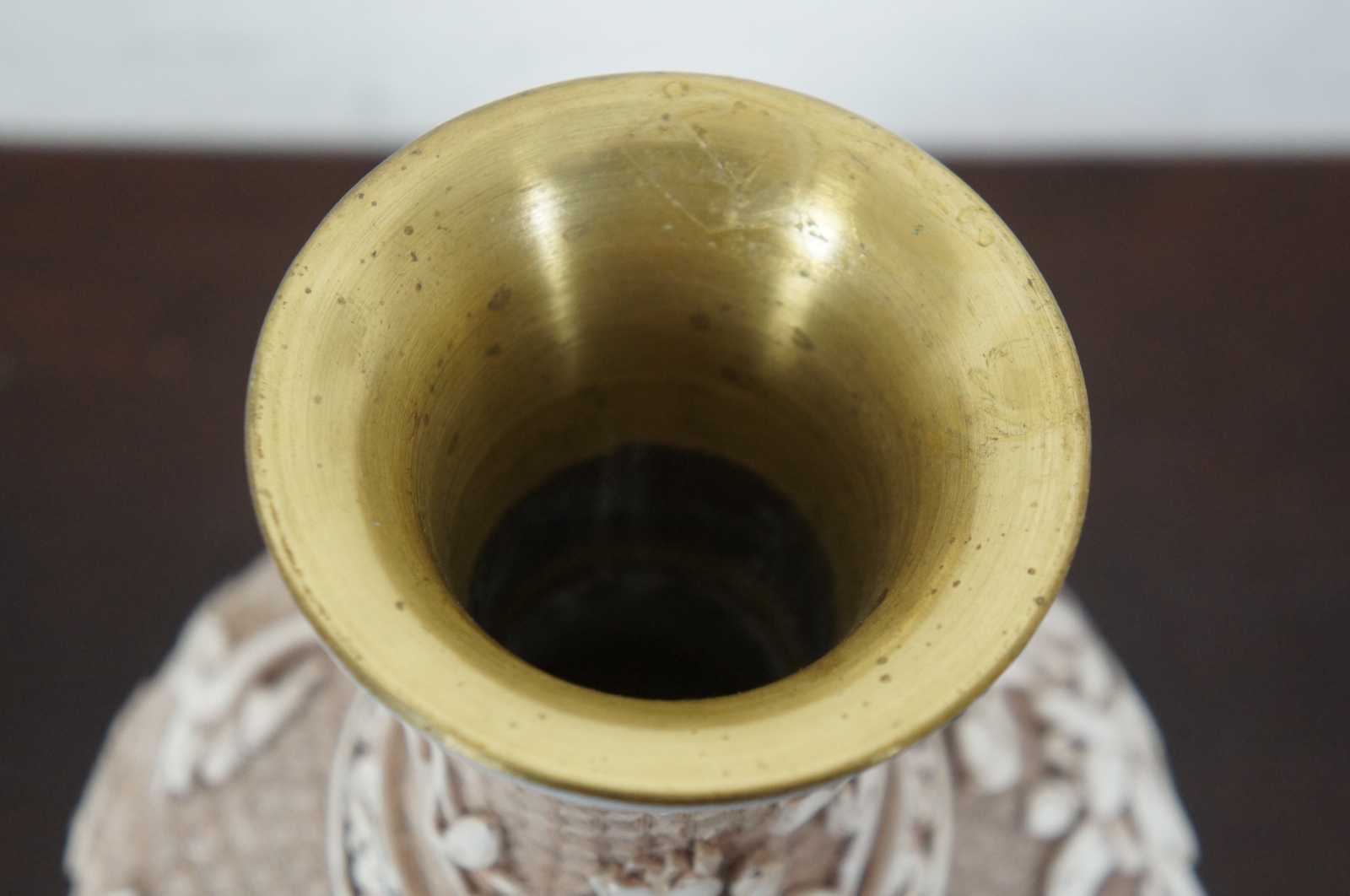 Vintage 1982 Arnarts Ivory Dynasty white cinnabar, carved resin vase with cherry blossoms and birds and inlaid brass around the mouth.
