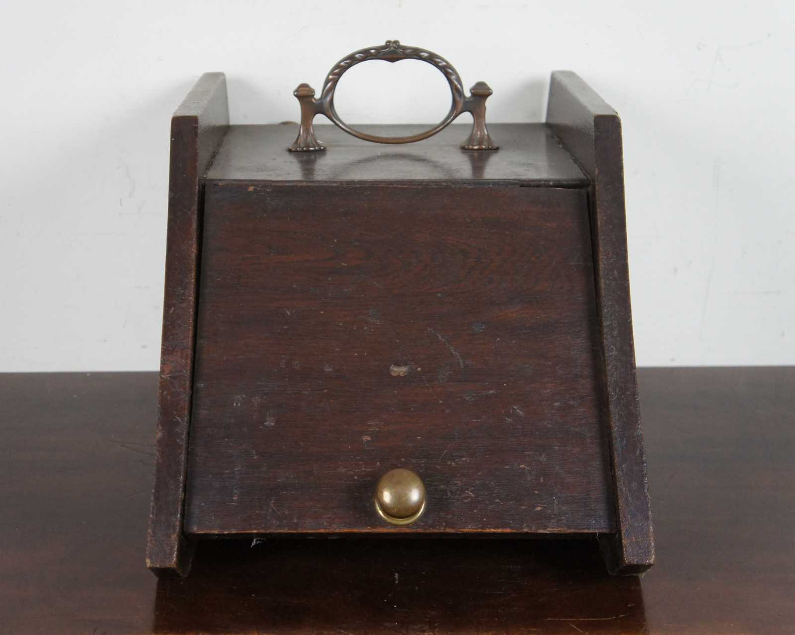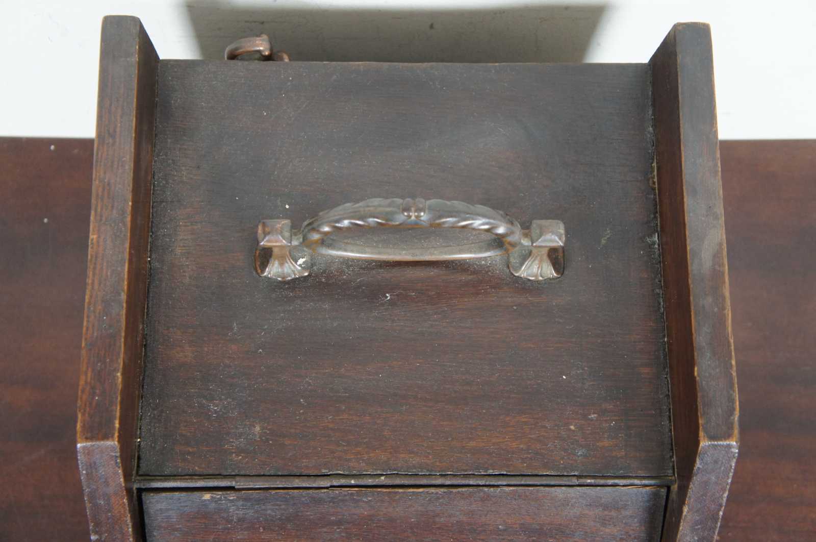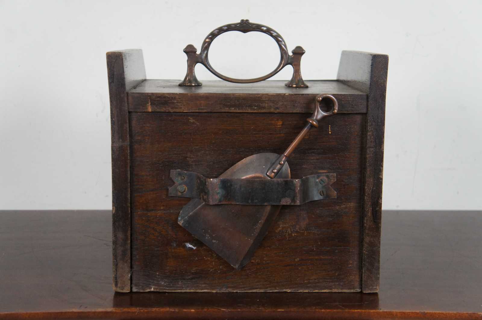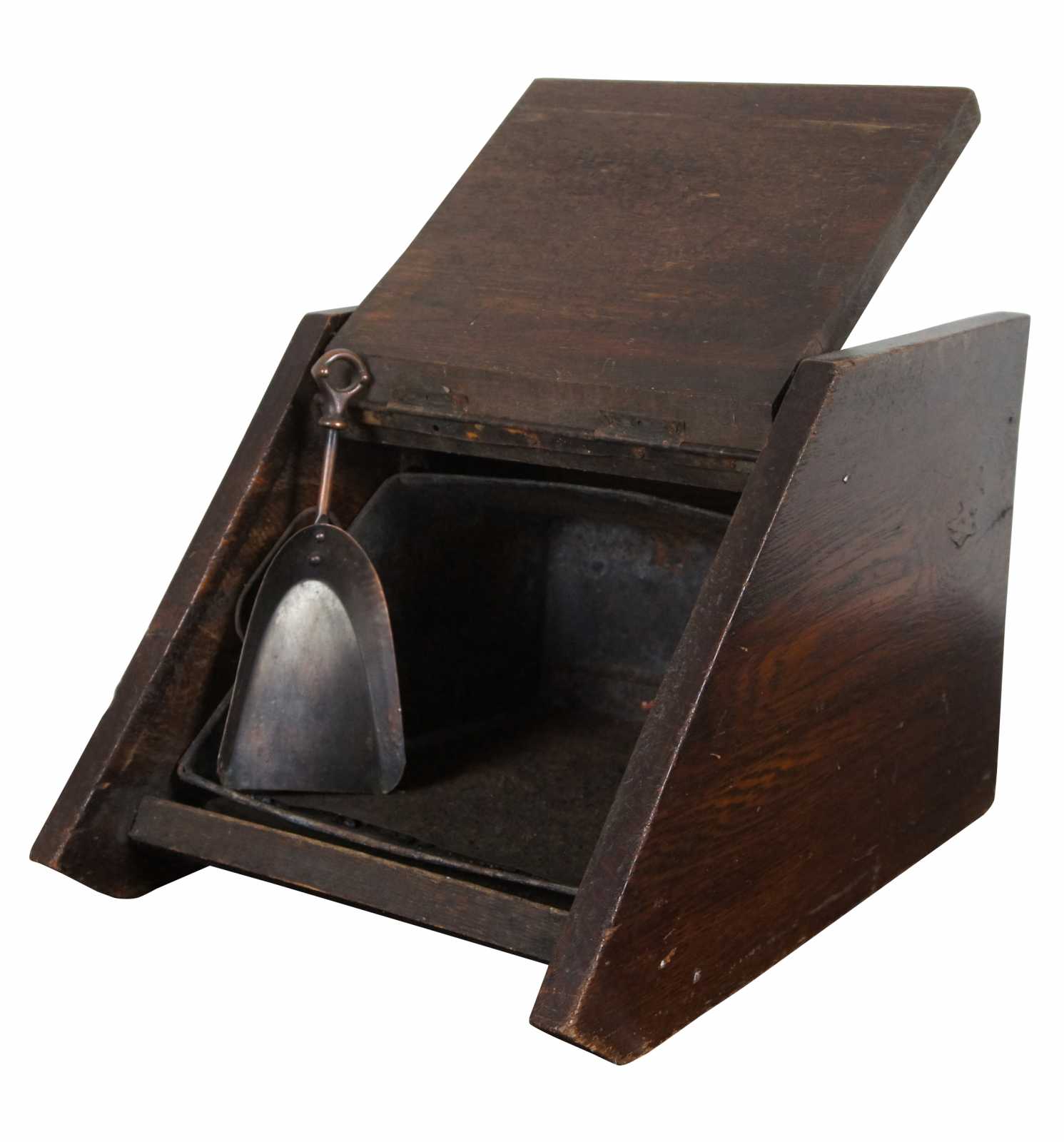 Antique English oak coal bin featuring a removable metal liner, top handle, and a copper scoop stored on the back.