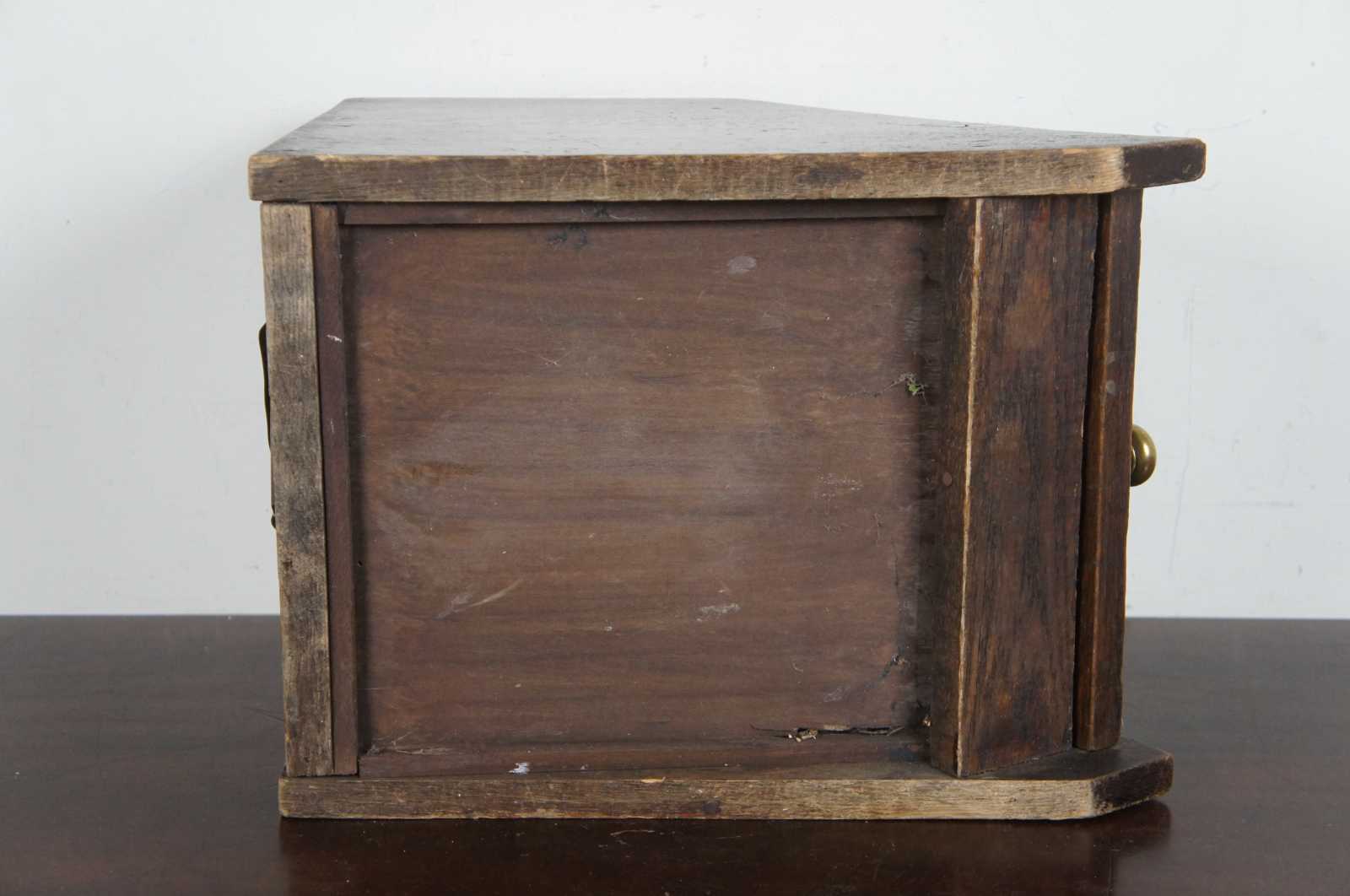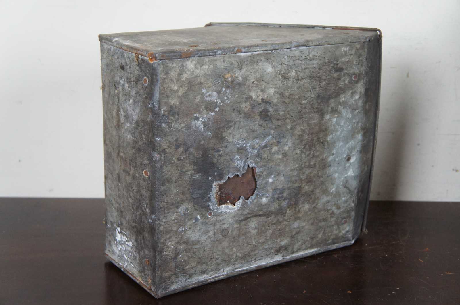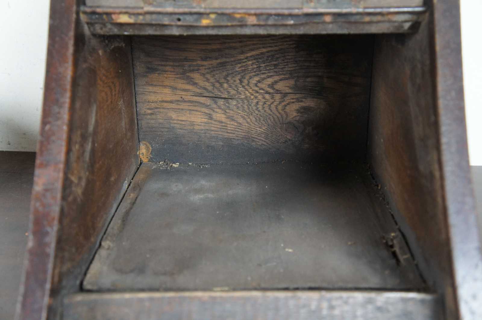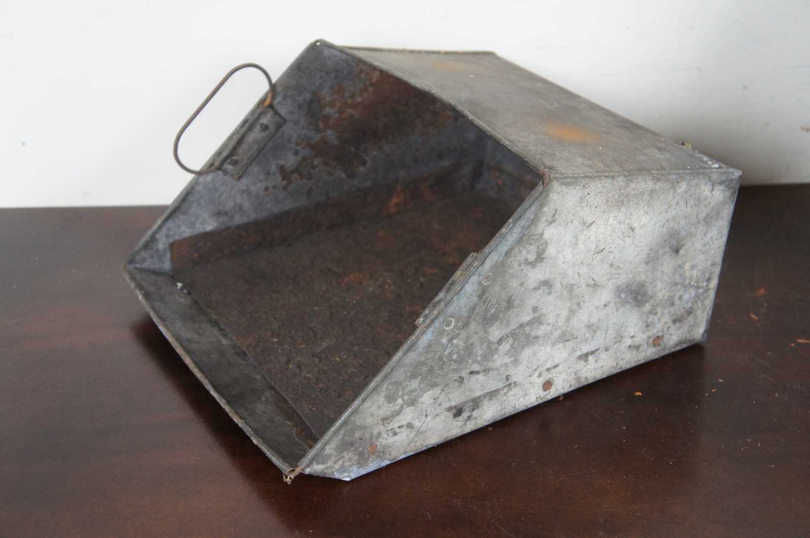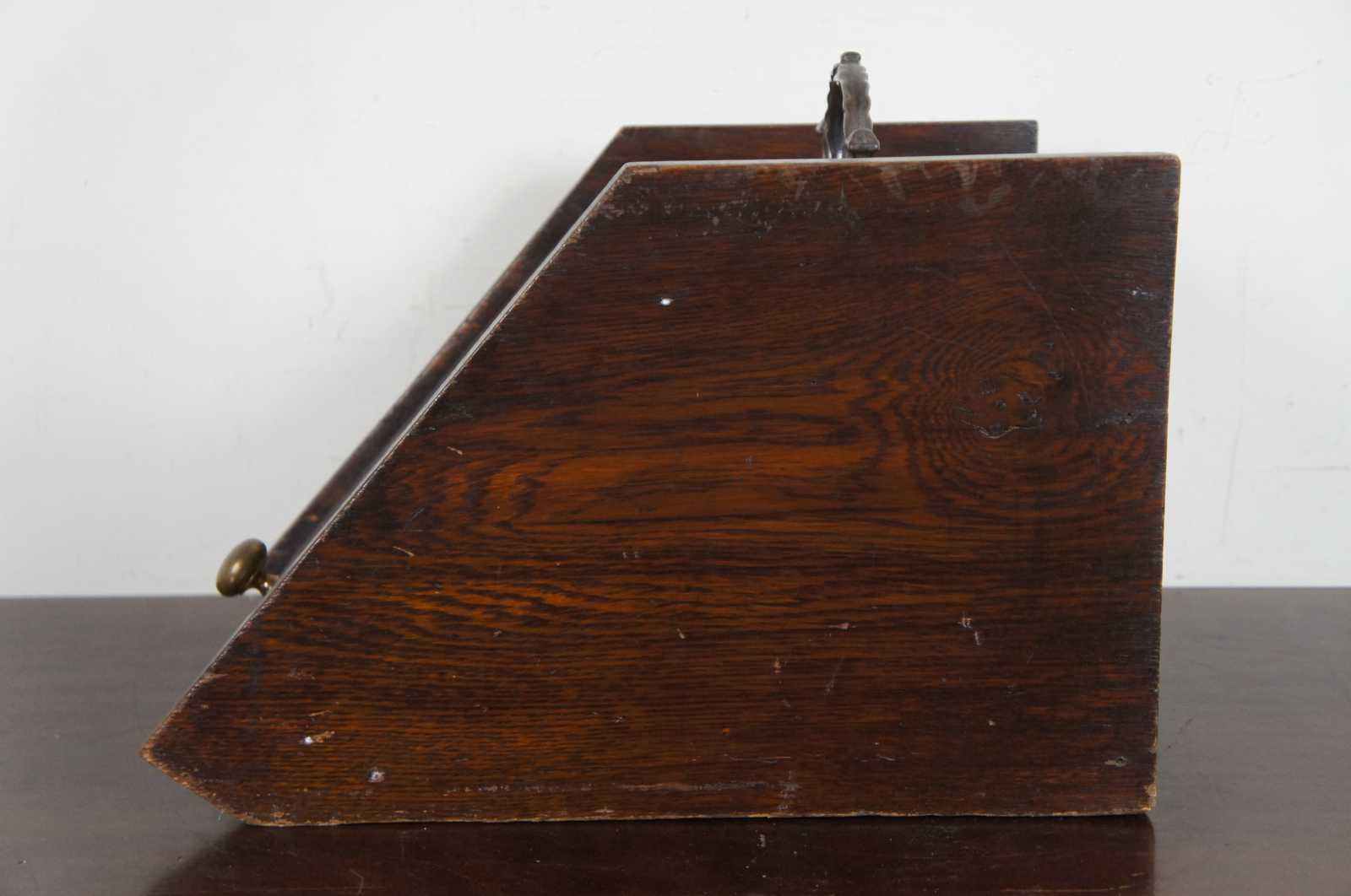 Antique English oak coal bin featuring a removable metal liner, top handle, and a copper scoop stored on the back.