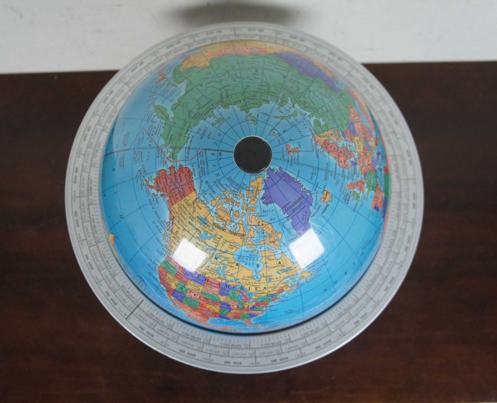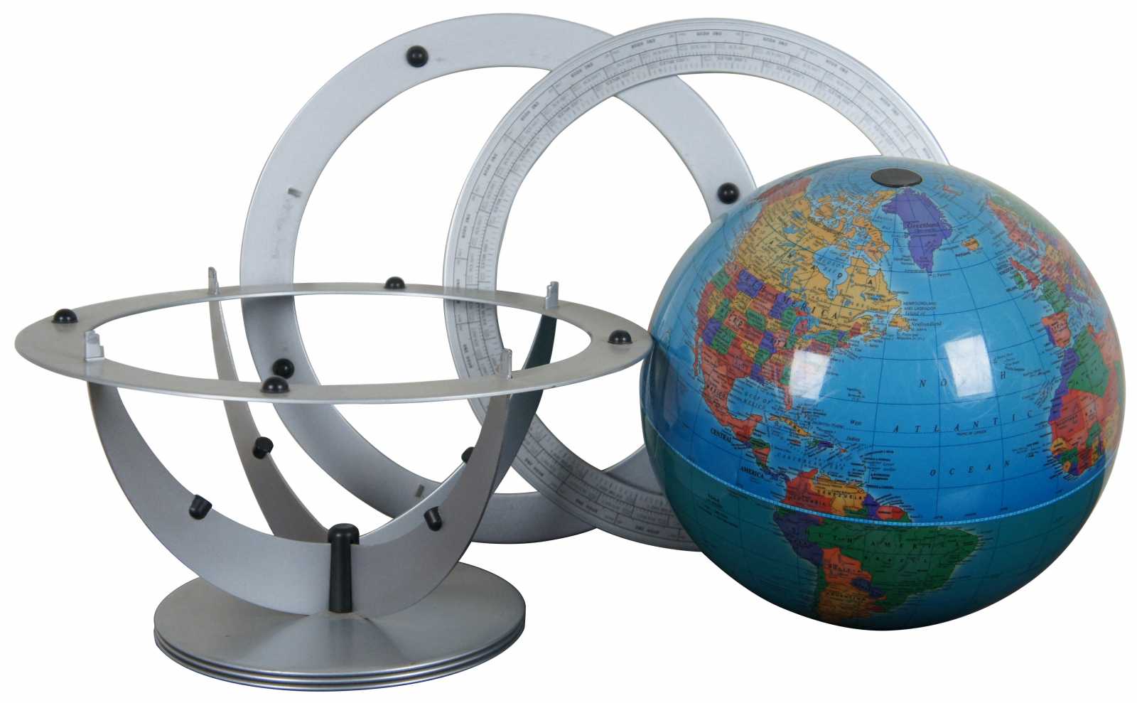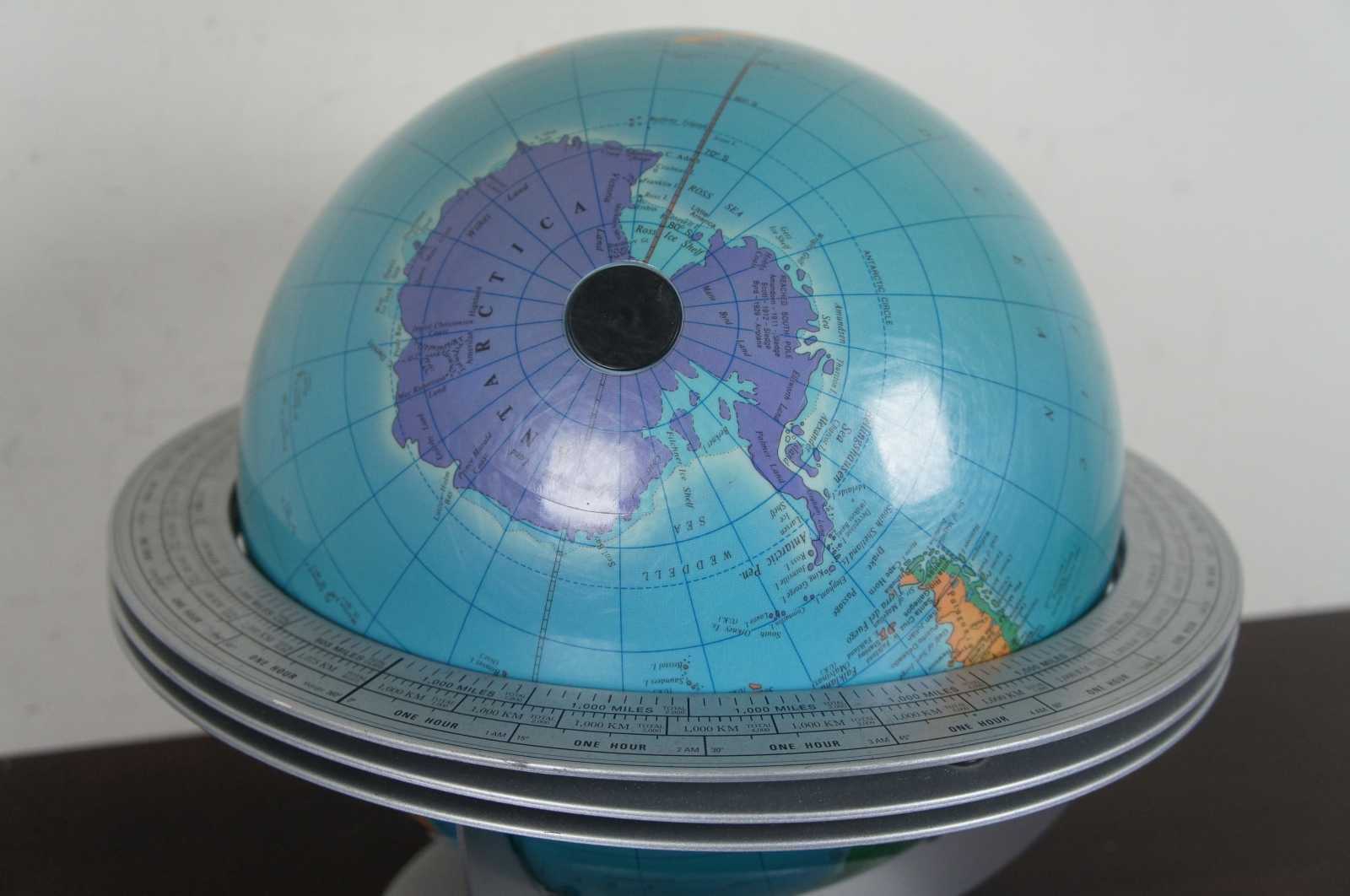 The Classica globe by George F. Cram Co. Inc. Globe sits loose in a metal cradle style stand marked with mile markers and time zones, allowing the user to see the time for any location on the planet at any time.
