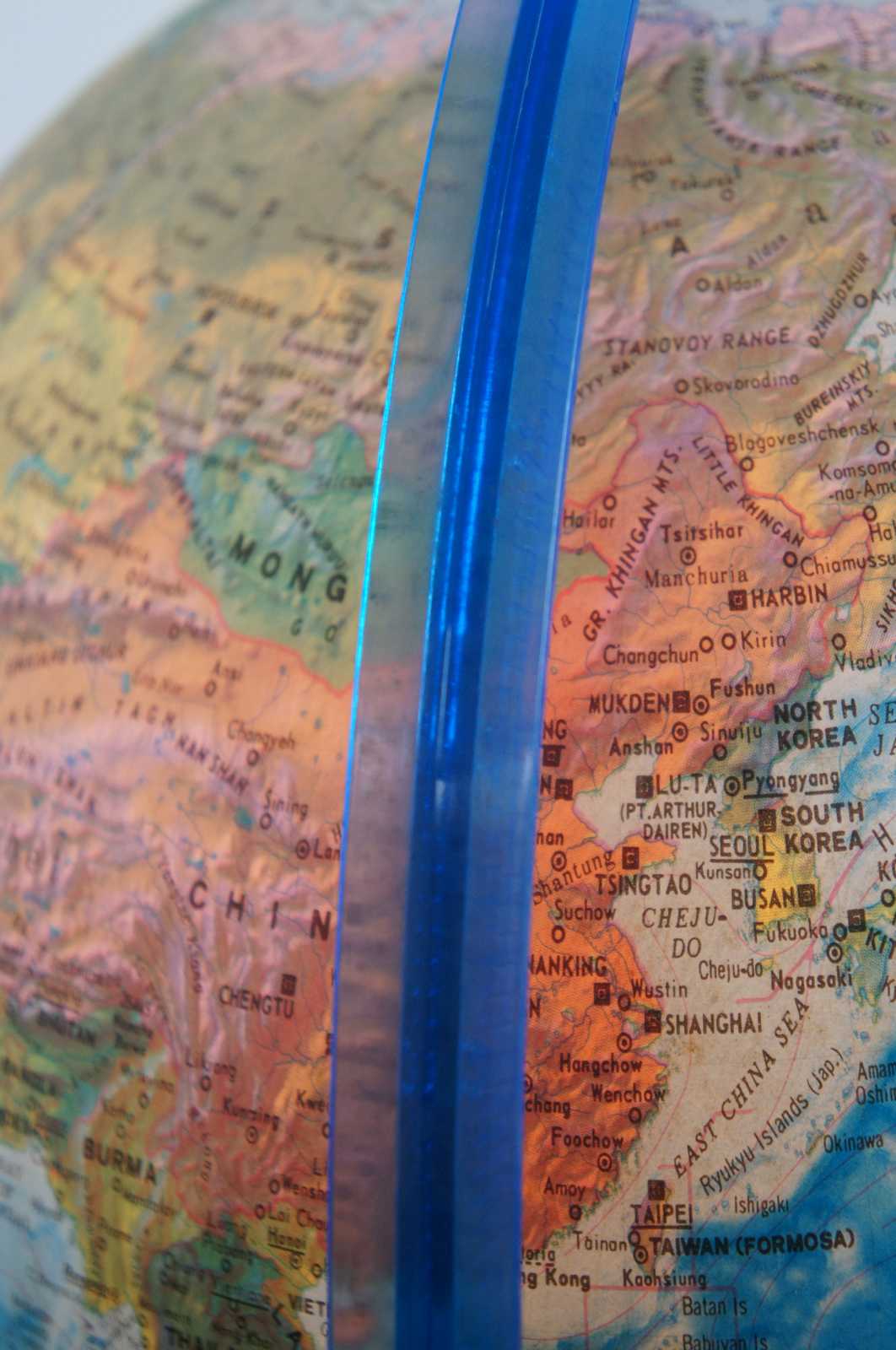 Vintage Nova Rico Ricoglobus illuminated, night light desk globe suspended on a blue plastic stand.