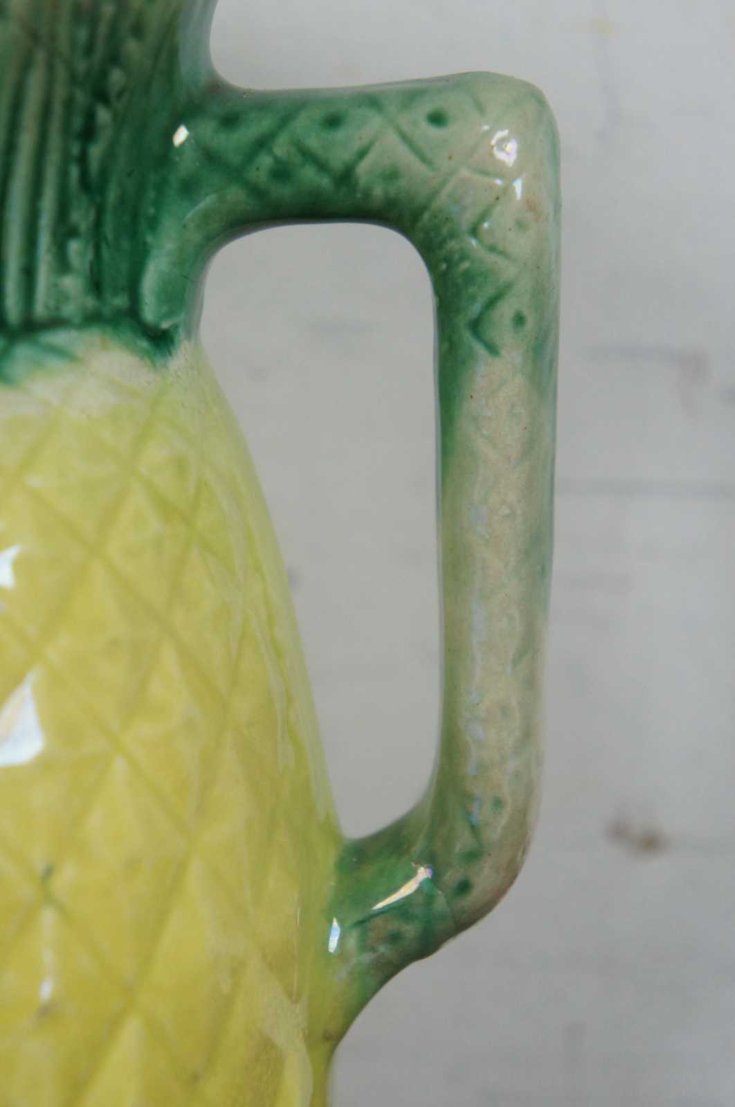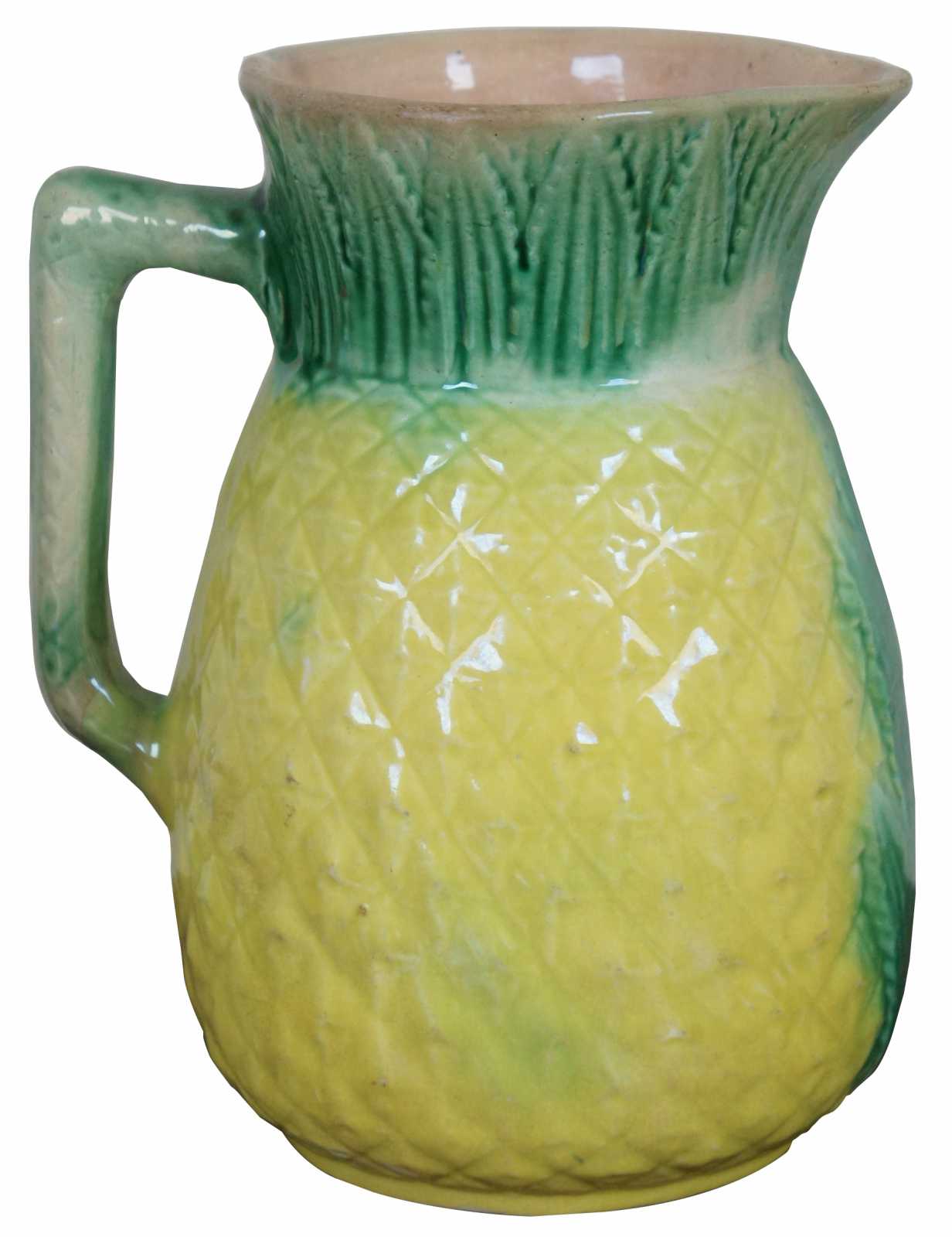 Antique majolica pitcher in the shape of a pineapple with a patterned handle and leaves up the front and around the top. Glazed in green and yellow.