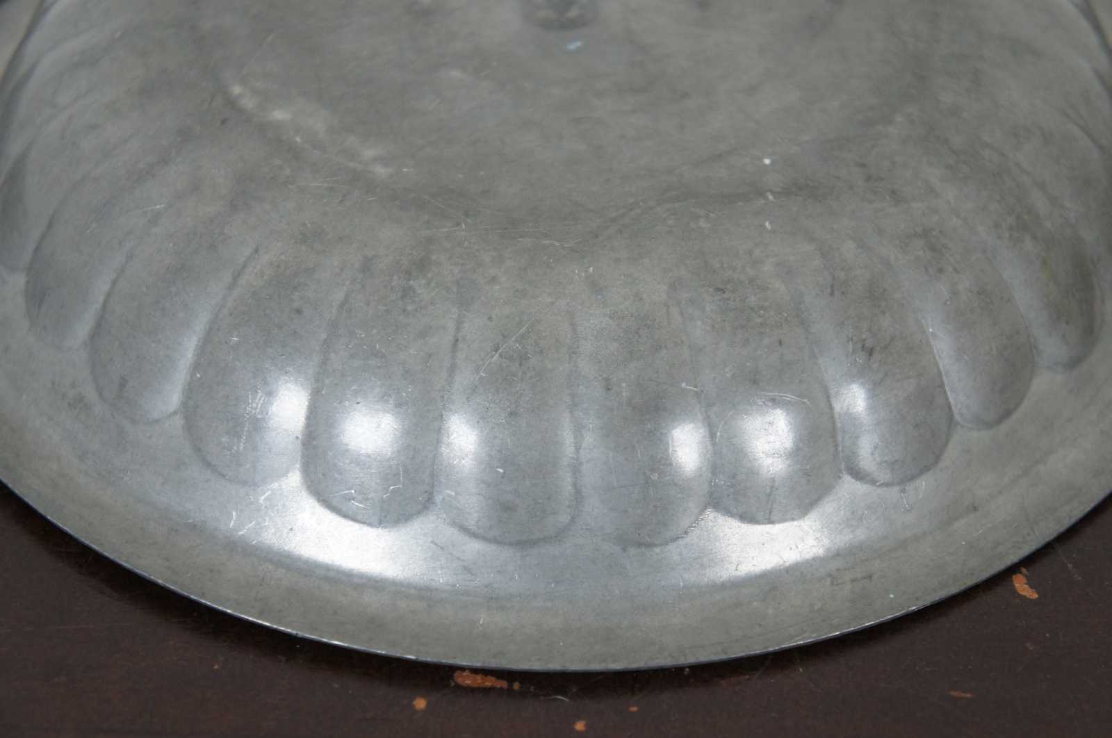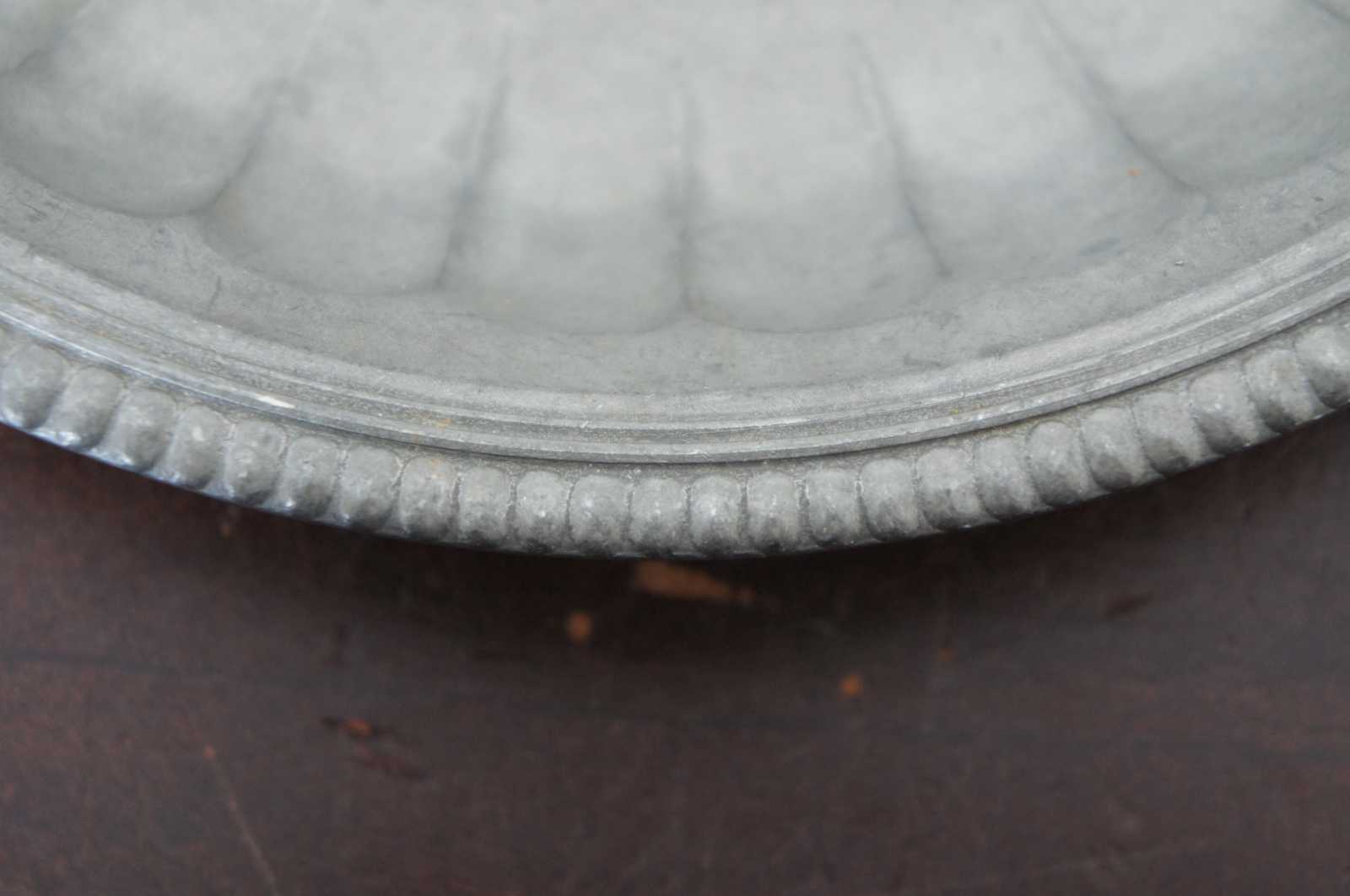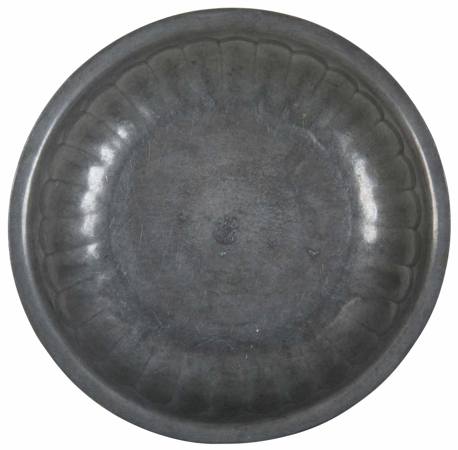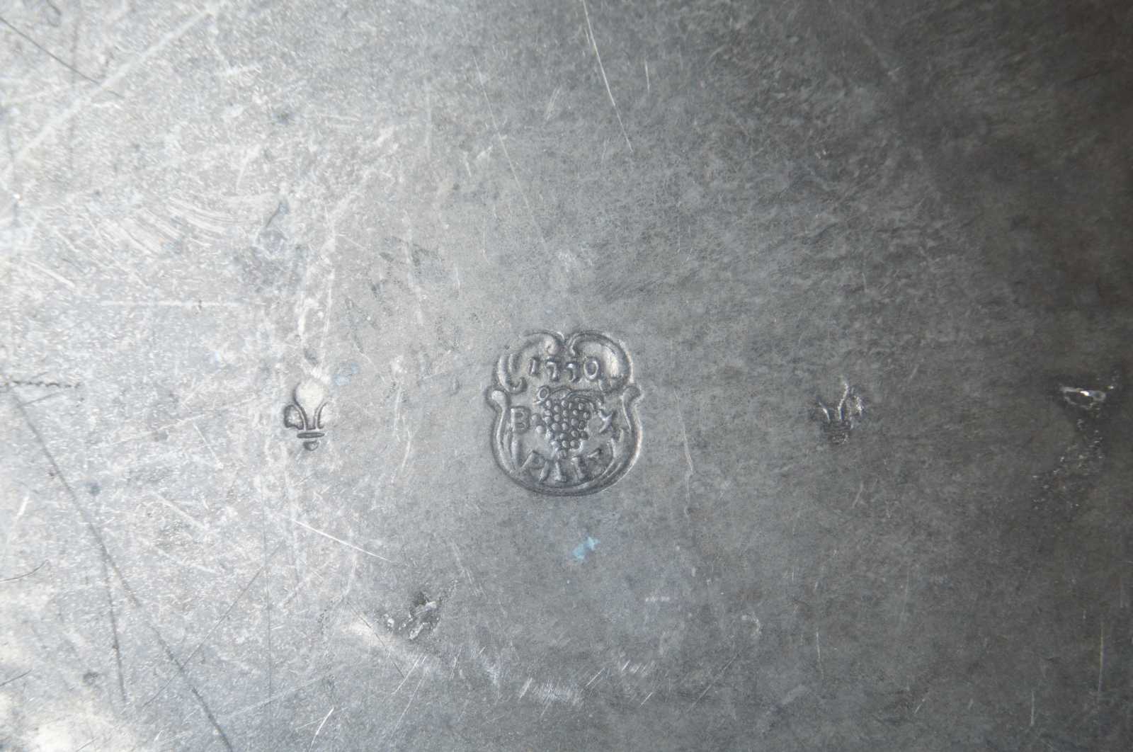 Antique round pewter serving dish with fluted sides and a rop twist pattern around the rim. Stamped on the reverse with two fleur de lis and a makers mark featuring a bunch of grapes, the numbers 1770, and the possible letters “BX Pilet” surrounded by leaves.
