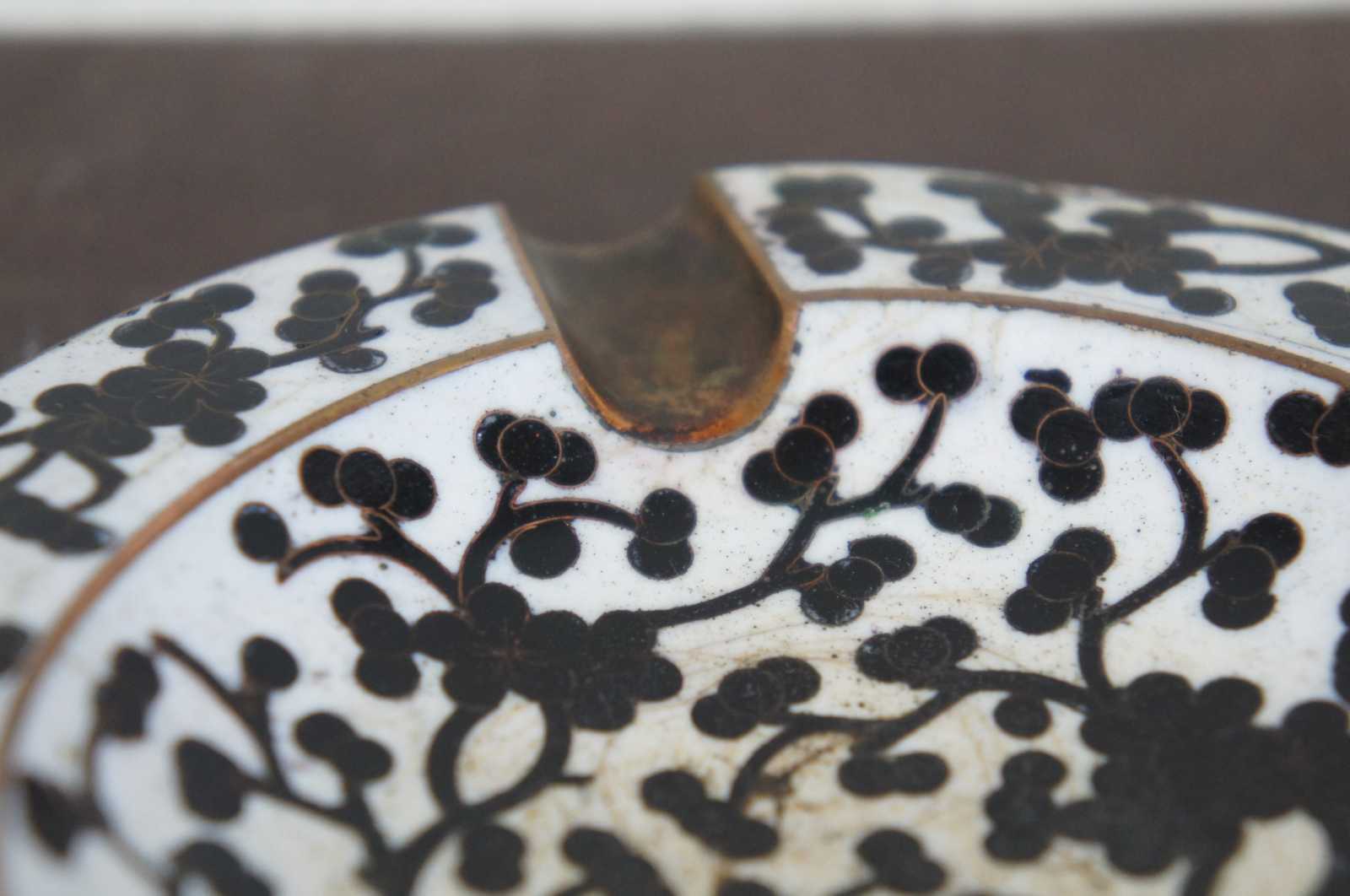 Vintage enamel on copper ashtray with three cigarette rests, decorated with black flowers on a white background and a blue underside.