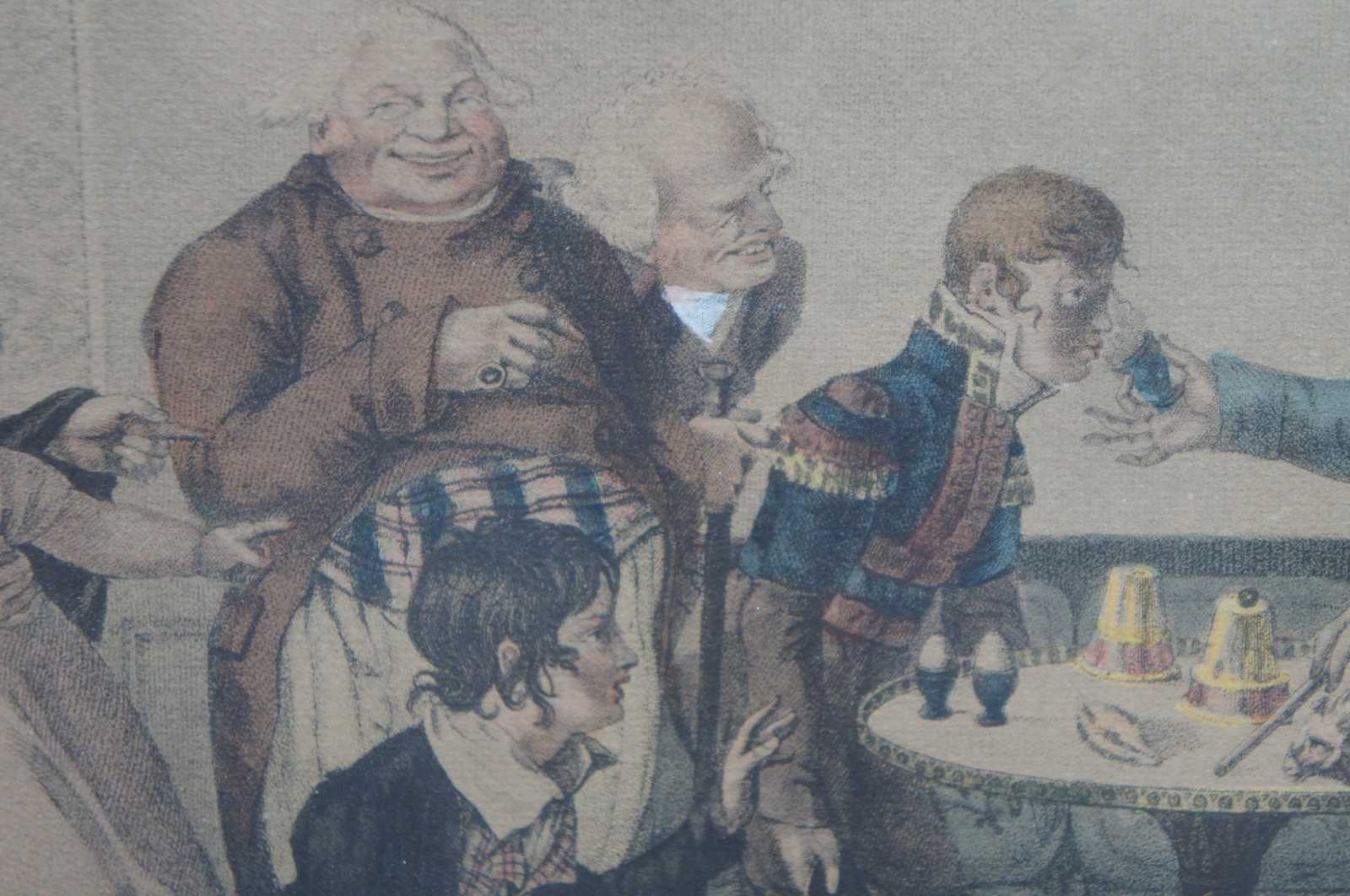Early 19th century colored French engraving titled L’Escamoteur (The Conjurer) created in 1801 by Louis Charles Ruotte (1754-1806) after a work Jean-Francis Bosio, showing a party of people in a parlor surrounding a table where a conjurer is performing magic tricks.