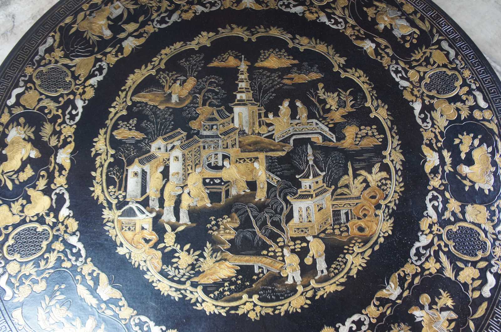 Baker Furniture Company Historic Charleston Japanned tilt-top tea table, in the Regency or Empire style. Features a circular top with embossed gilt landscape and figural decoration, a secondary band of embossed gilt foliate and figural vignette decoration with a fret border, over a turned baluster that terminates into a triangular base with gilt decoration and gilt paw feet. Label en verso of top reads "Baker Historic Charleston Reproductions".