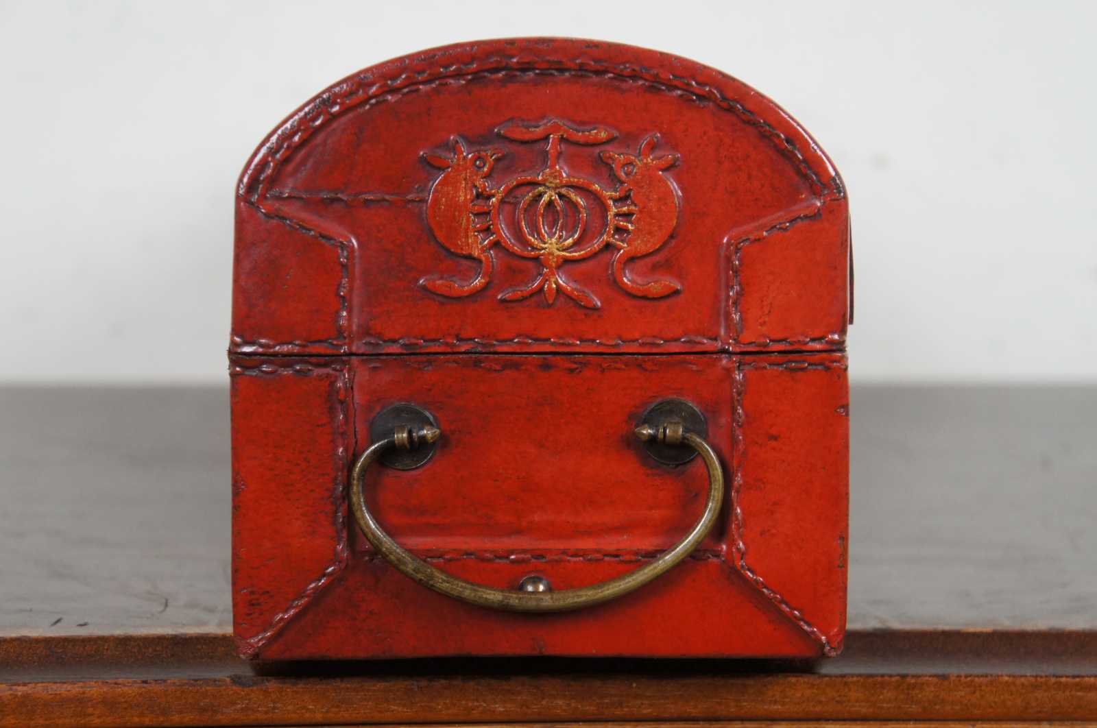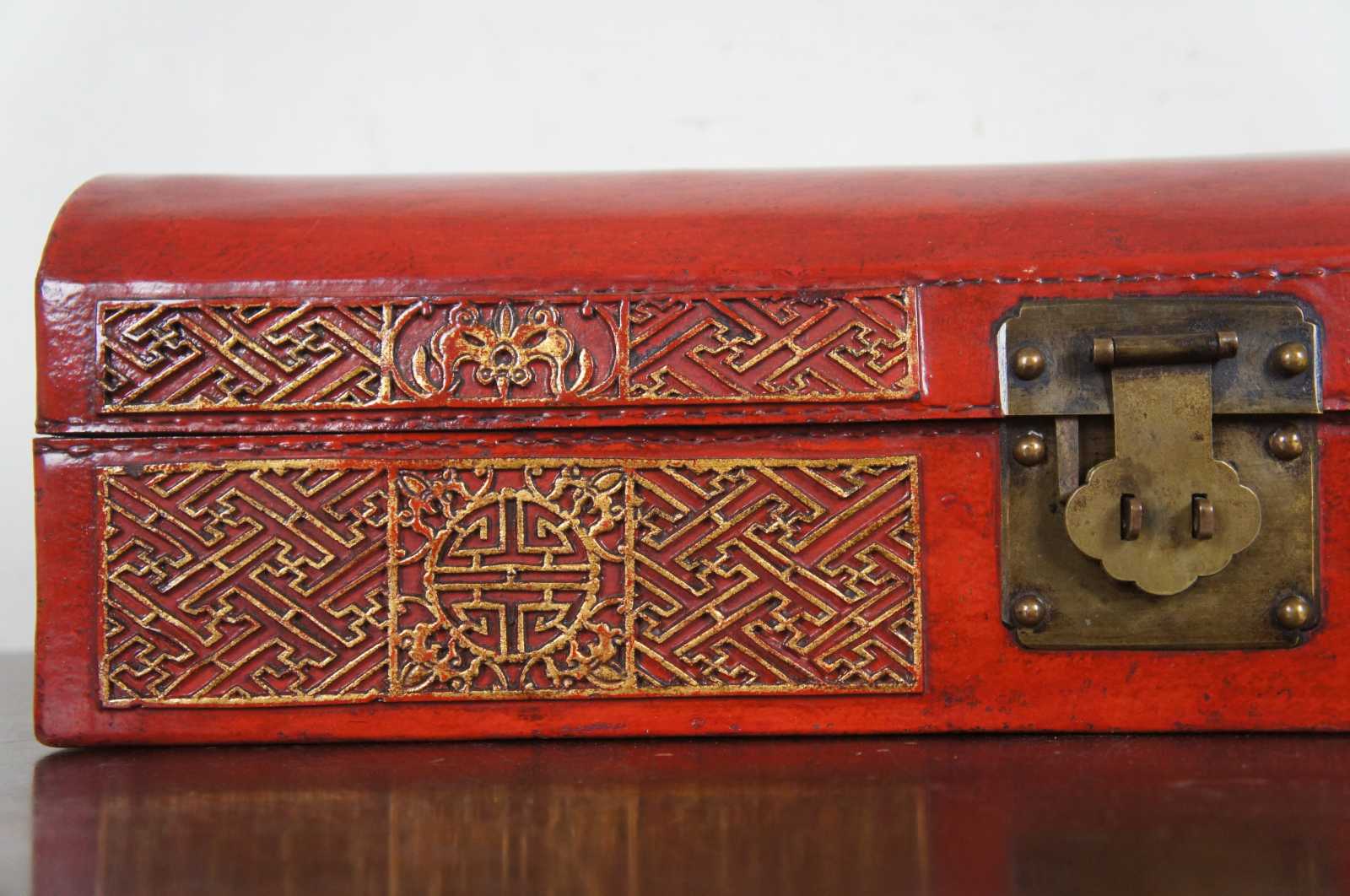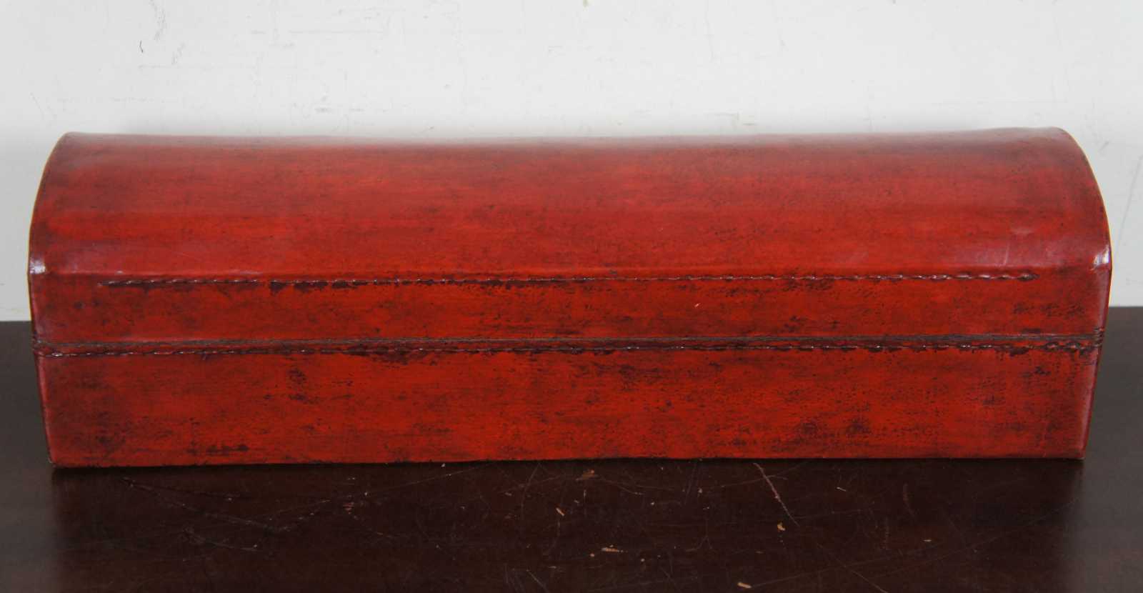 Antique red leather and lacquer Chinese scroll box with gold designs, domed lid, interior tray and brass handles / hardware.