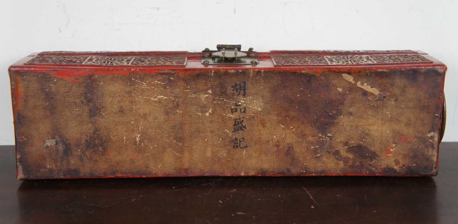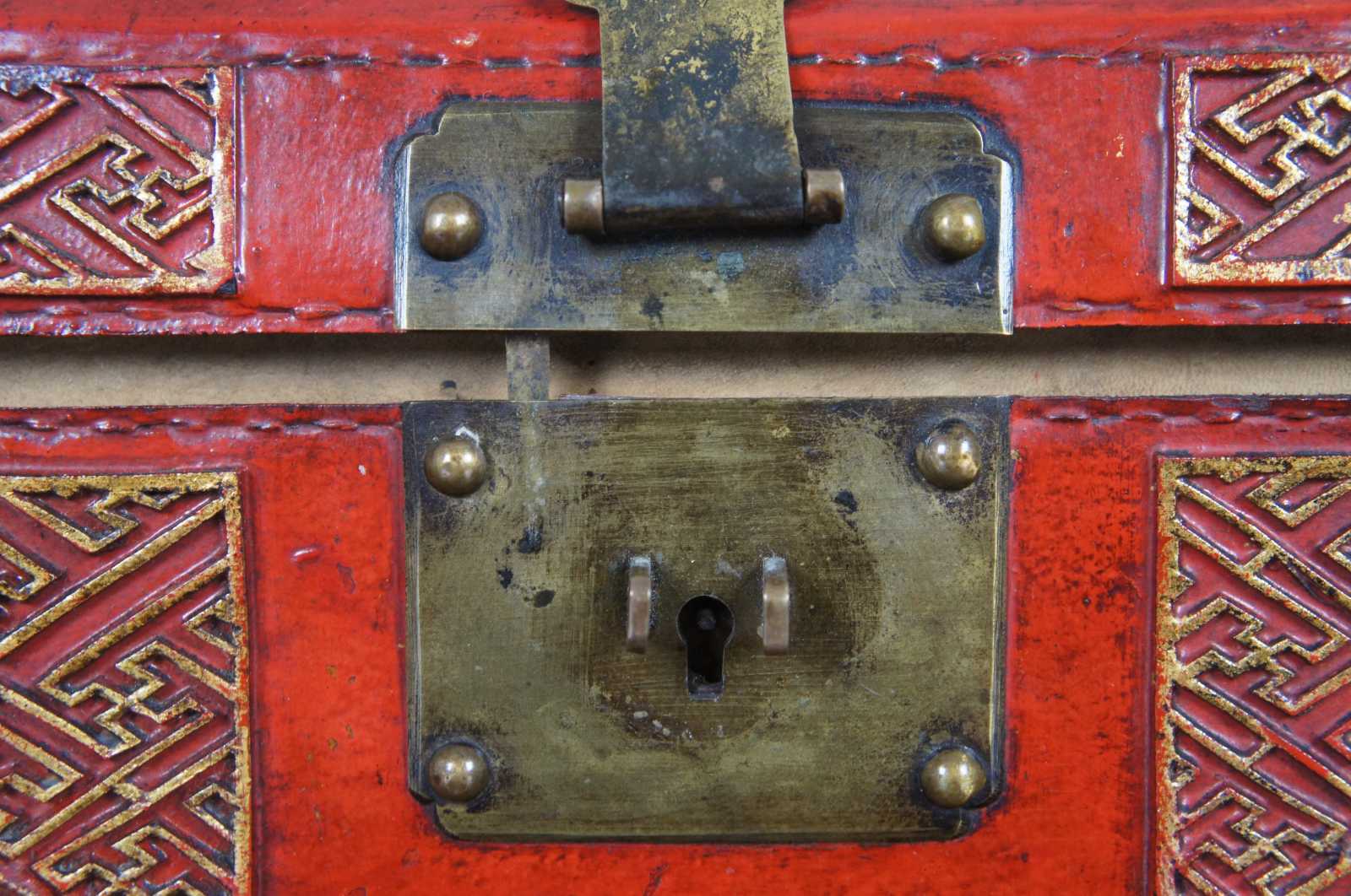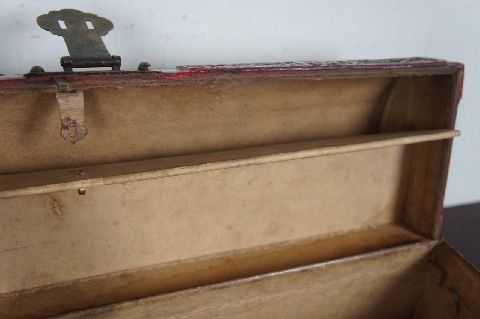 Antique red leather and lacquer Chinese scroll box with gold designs, domed lid, interior tray and brass handles / hardware.