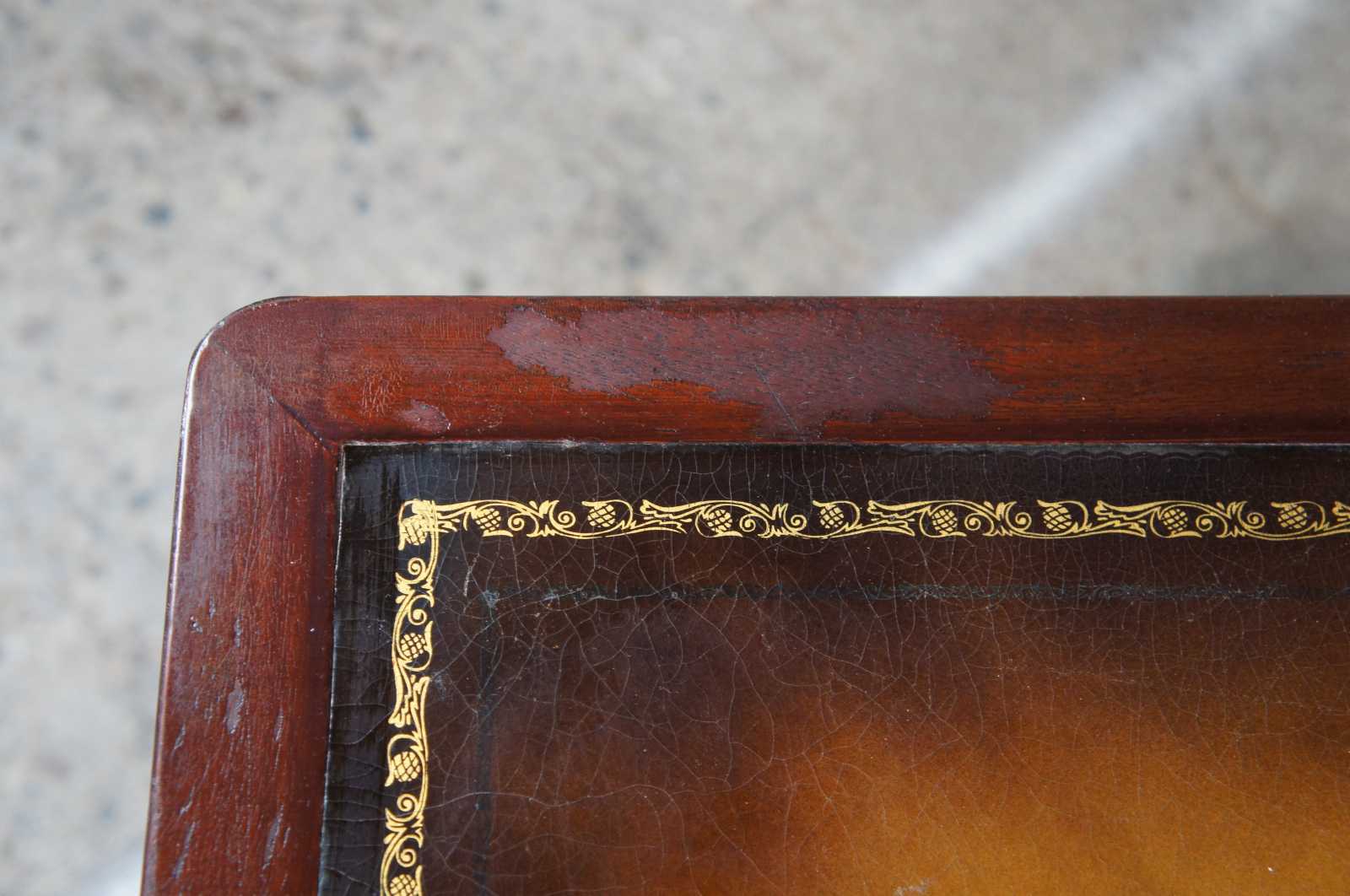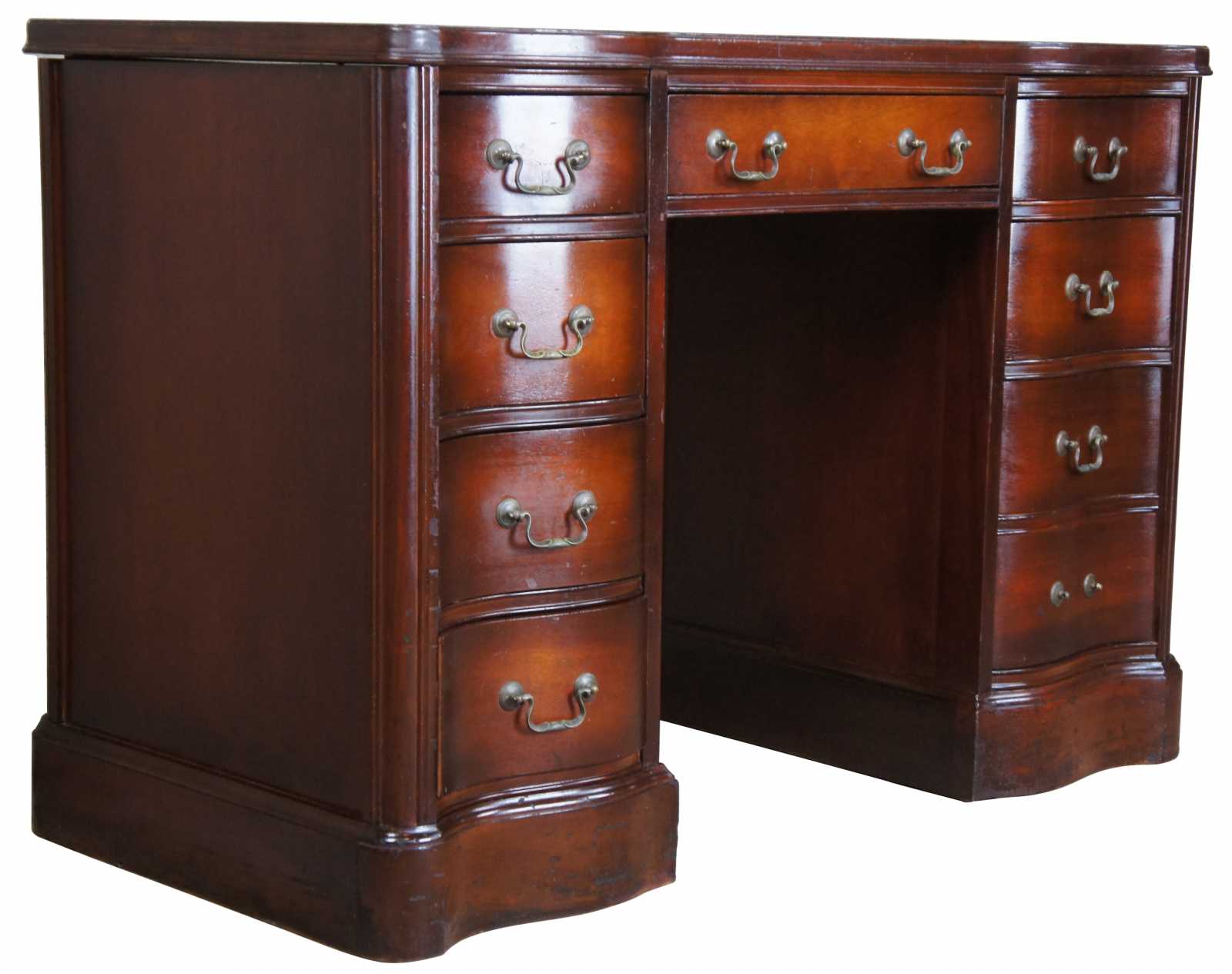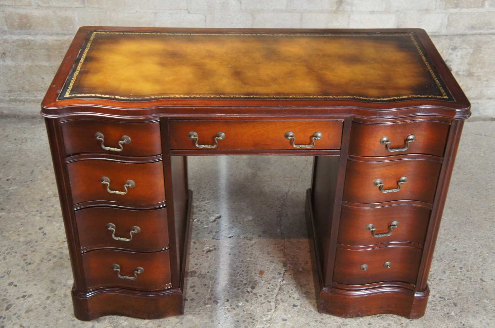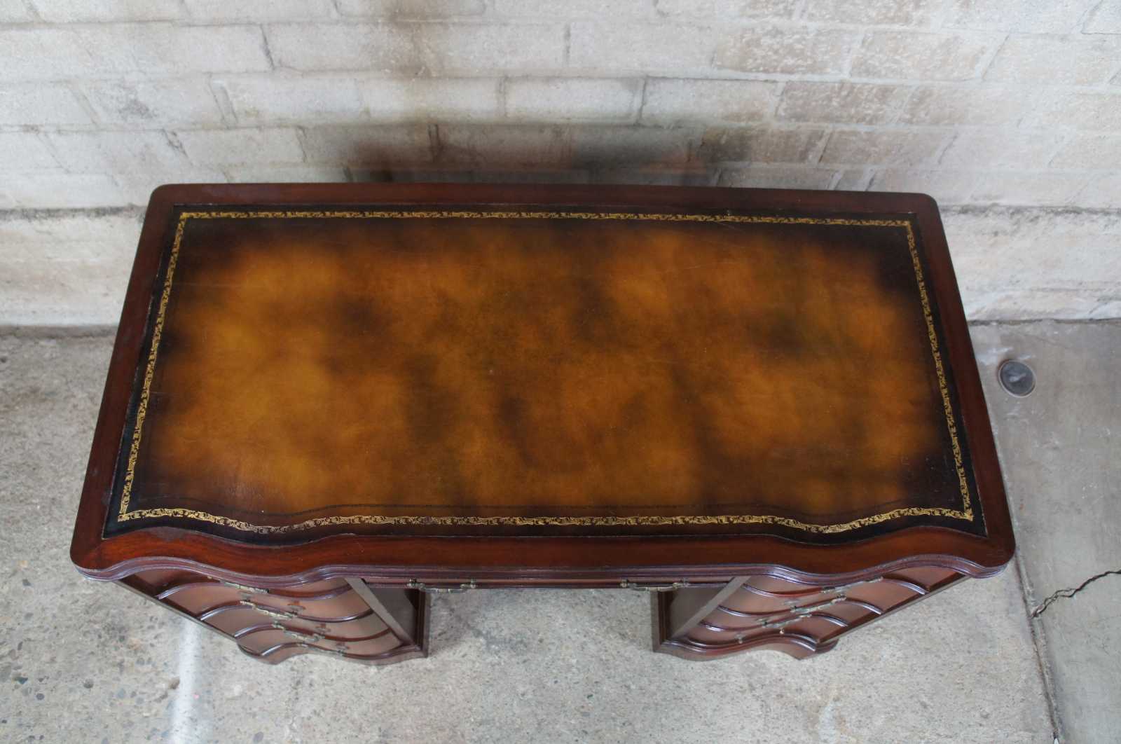 Mid 20th Century tooled leather top writing desk. Made from mahogany with a rectangular form featuring a serpentine front and eight drawers.