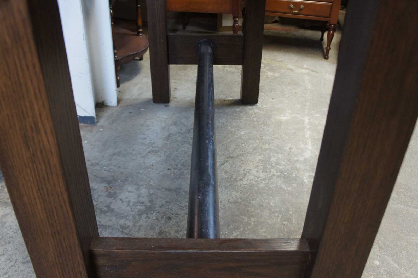 A neat library or pub table made from oak with trestle base and drawer. Could be used as a kitchen island, desk or table.