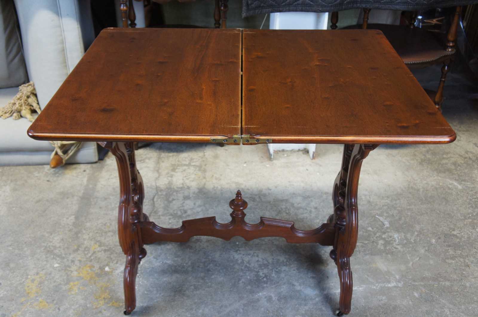 Circa 1880s walnut parlor table. A unique dual functioning piece that can be used as a swivel top game table or sewing cabinet. Features a compartment for storage beneath the table top as well as a large dovetailed troth drawer. Intricately designed with spindeled accents and eastlake inspired serpentine supports.