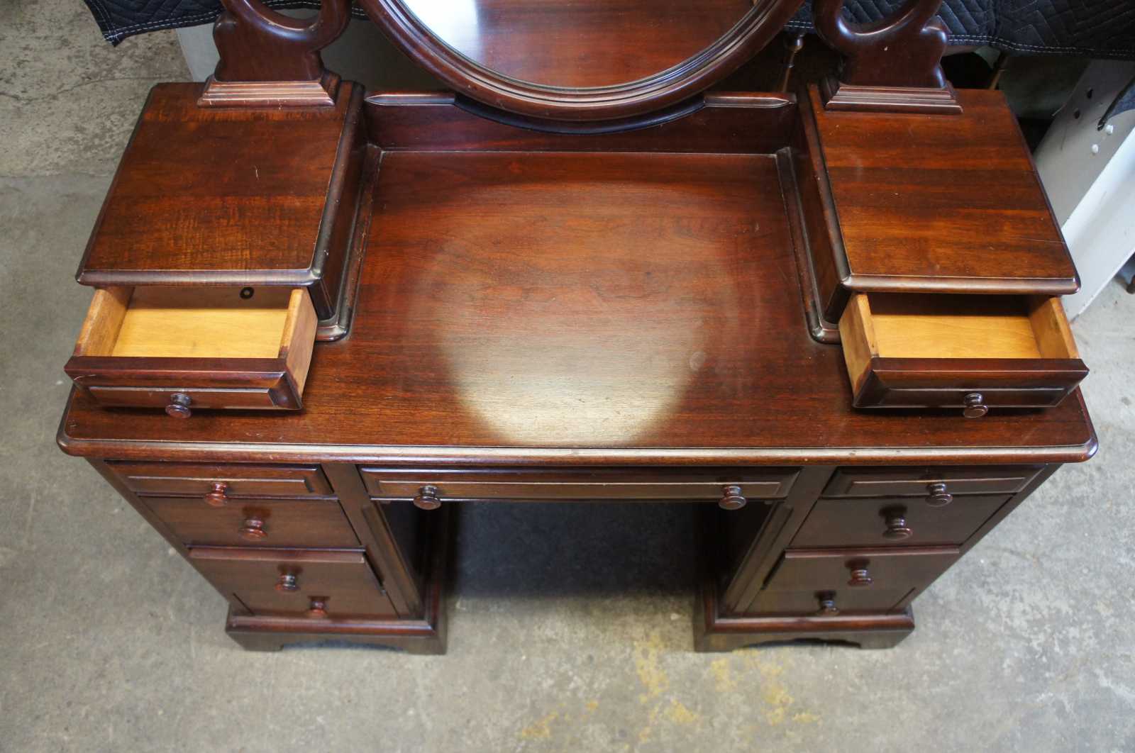 Circa 1940s dressing table. Made form mahogany in Early American styling with nine drawers in addition to upper glove box drawers. Includes mirror with swivel or adjustable mirror.