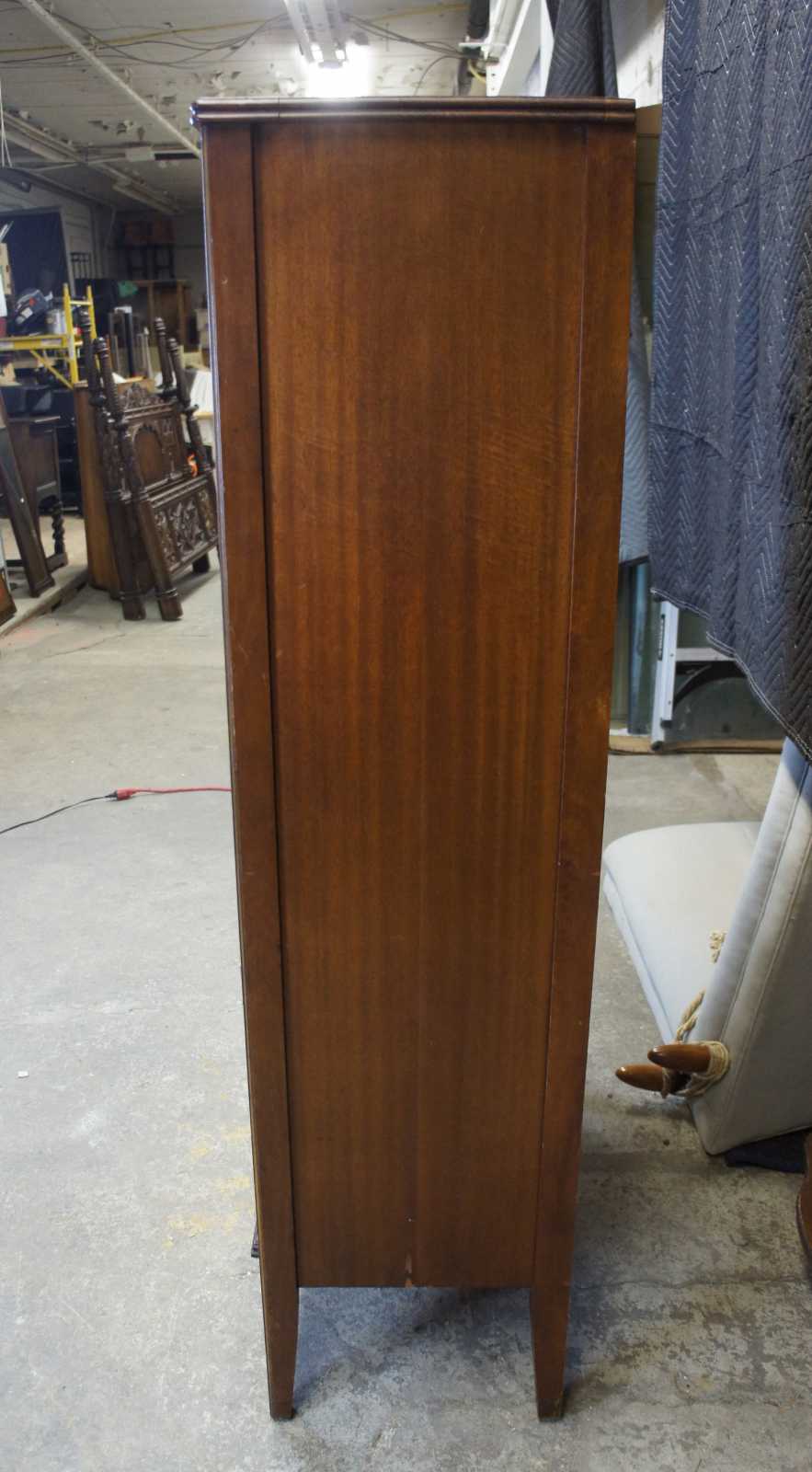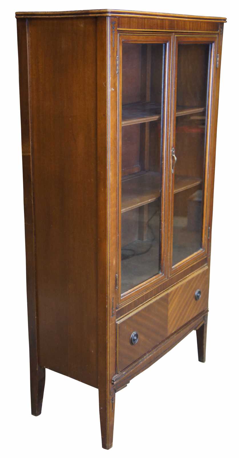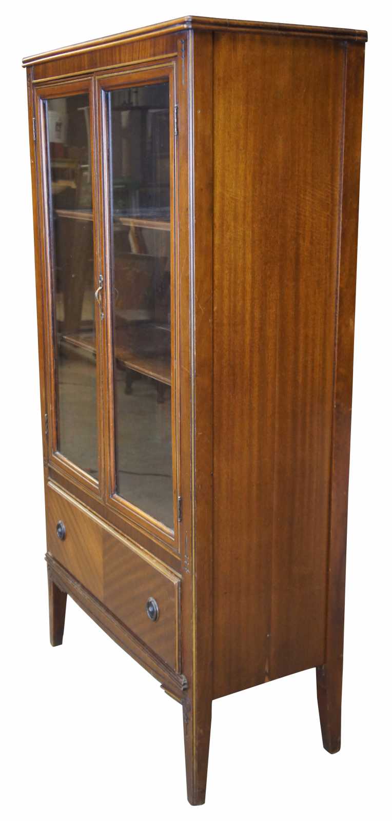 Circa 1940s walnut glass front bookcase. Features three interior shelves, plate grooves and lower drawer for storage. Includes carved accents and matchbook veneer along lower drawer.